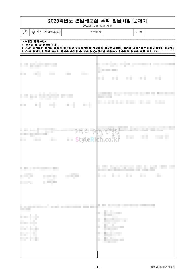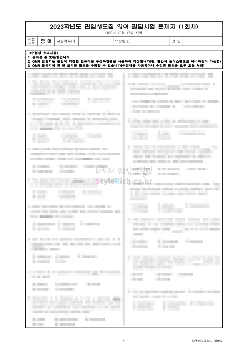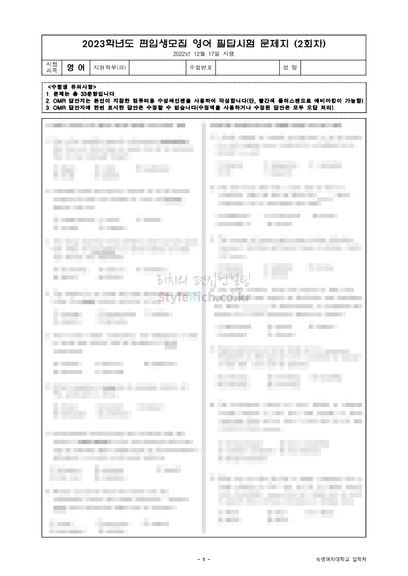 2023학년도 숙명여대 편입 기출문제 다운받기