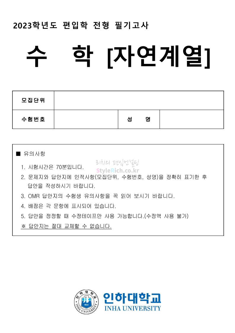 2023학년도 인하대 편입 기출문제 다운받기