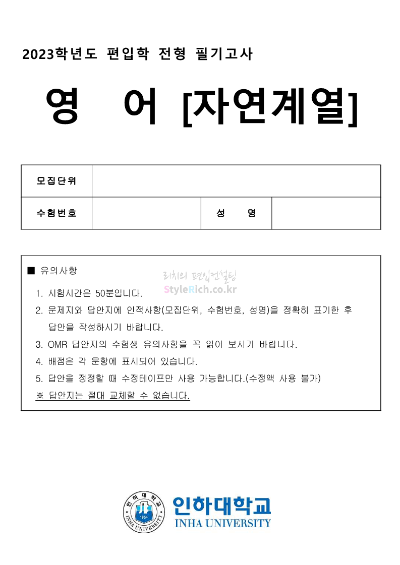 2023학년도 인하대 편입 기출문제 자연 영어