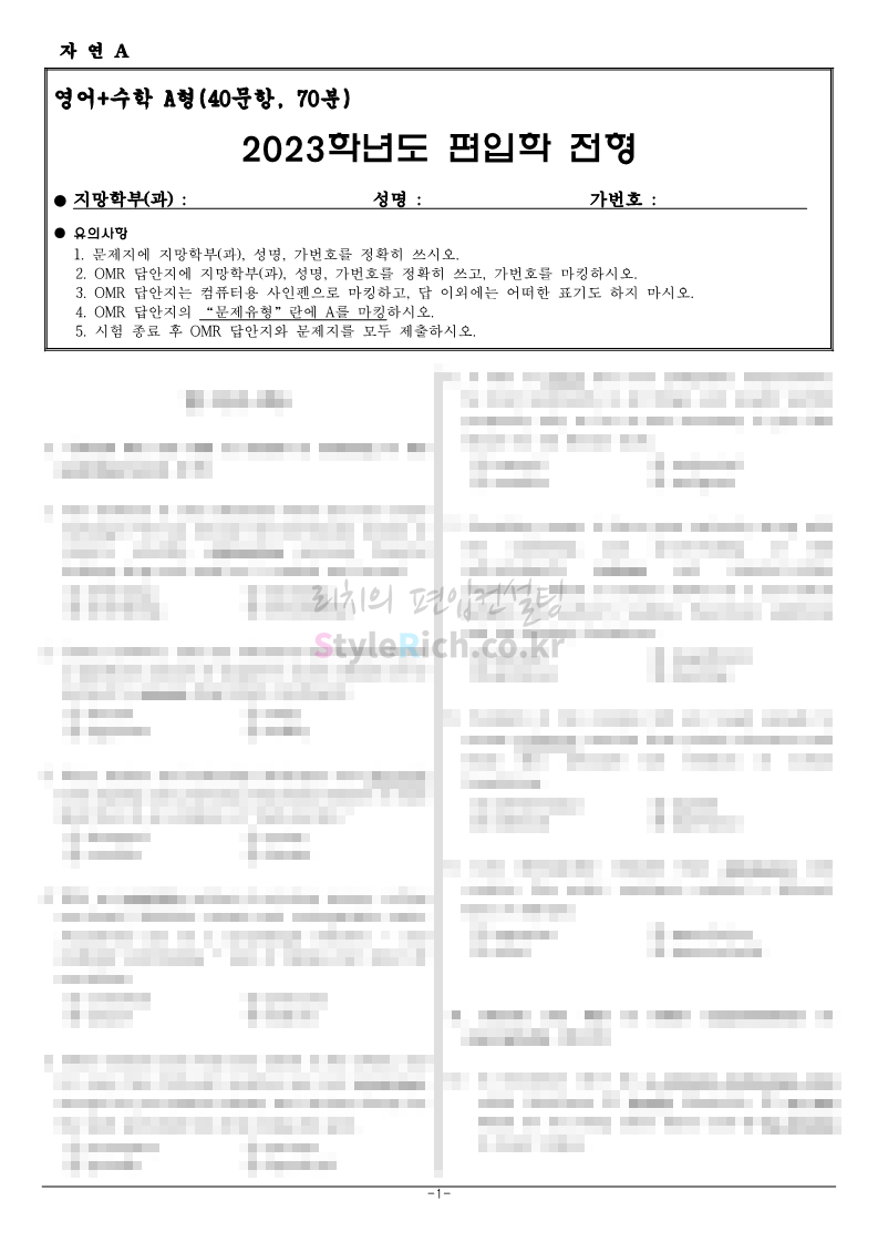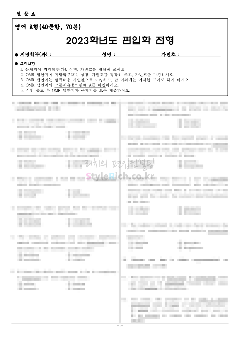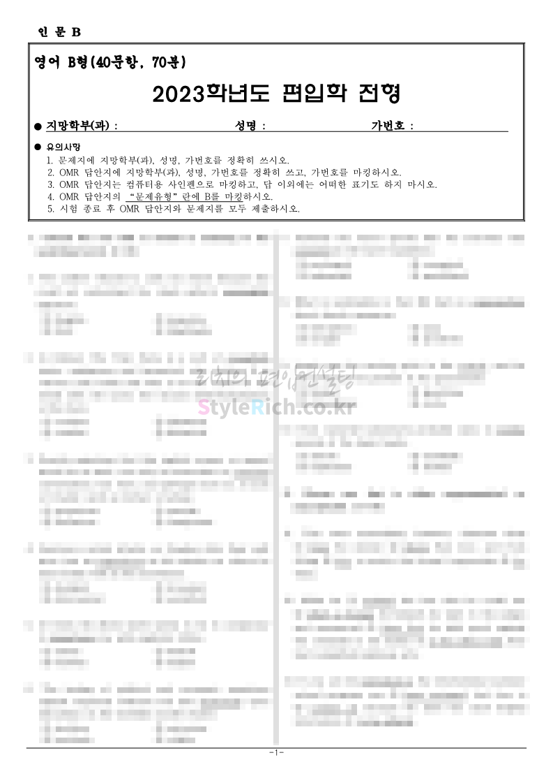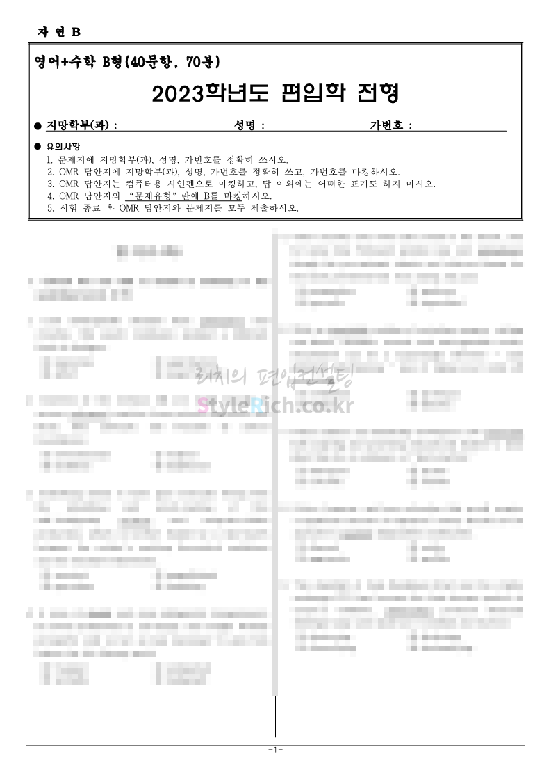 홍익대 편입 2023학년도 기출문제가 궁금하다면? 2023.09.27 00:43 편입 기출문제/2023학년도 기출문제 2023학년도 홍익대 편입 기출문제를 살펴보겠습니다. 2023학년도 홍익대 편입 인문계열 영어 기출문제는 40문항/70분, 객관식 4지선다형, 총점 75점 만점에 문항당 배점은 1.875점이며, TOEFL 형식입니다. 2023학년도-홍익대-편입-기출문제-인문-영어-A형 2023학년도-홍익대-편입-기출문제-인문-영어-B형 2023학년도 홍익대 편입 자연계 영어+수학 기출문제는 40문항(영어 25, 수학 15), 객관식 4지선다형, 총점 75점 만점에 문항당 배점은 영어 25문항 1.5점, 수학 15문항 2.5점으로 영어는 TOEFL 유형, 수학은 대학 1, 2학년 과정에서 배우는 대학수학과 공학수학의 기본적인 문제를 출제합니다. 2023학년도-홍익대-편입-기출문제-자연-영어+수학-A형 2023학년도-홍익대-편입-기출문제-자연-영어+수학-B형 2023학년도 홍익대 편입 기출문제 다운받기 2023학년도 홍익대 편입 기출문제 인문 영어 A형.pdf 0.12MB 2023학년도 홍익대 편입 기출문제 인문 영어 B형.pdf 0.12MB 2023학년도 홍익대 편입 기출문제 자연 영어+수학 A형.pdf 0.15MB 2023학년도 홍익대 편입 기출문제 자연 영어+수학 B형.pdf 0.15MB <출처: 홍익대> 공유하기 게시글 관리 리치의 편입컨설팅 저작자표시 비영리 변경금지 (새창열림) '편입 기출문제 > 2023학년도 기출문제' 카테고리의 다른 글 한국공학대 편입 2023학년도 기출문제가 궁금하다면? (0) 2023.11.04 가천대 편입 2023학년도 기출문제가 궁금하다면? (0) 2023.11.04 한양대 편입 2023학년도 기출문제가 궁금하다면? (0) 2023.09.26 한성대 편입 2023학년도 기출문제가 궁금하다면? (0) 2023.09.25 한국항공대 편입 2023학년도 기출문제가 궁금하다면? (0) 2023.09.25 댓글 공유하기 다른 글 댓글 이 글 공유하기 구독하기 구독하기 카카오톡 카카오톡 라인 라인 트위터 트위터 Facebook Facebook 카카오스토리 카카오스토리 밴드 밴드 네이버 블로그 네이버 블로그 Pocket Pocket Evernote Evernote 다른 글 한국공학대 편입 2023학년도 기출문제가 궁금하다면? 한국공학대 편입 2023학년도 기출문제가 궁금하다면? 2023.11.04 가천대 편입 2023학년도 기출문제가 궁금하다면? 가천대 편입 2023학년도 기출문제가 궁금하다면? 2023.11.04 한양대 편입 2023학년도 기출문제가 궁금하다면? 한양대 편입 2023학년도 기출문제가 궁금하다면? 2023.09.26 한성대 편입 2023학년도 기출문제가 궁금하다면? 한성대 편입 2023학년도 기출문제가 궁금하다면? 2023.09.25 다른 글 더 둘러보기