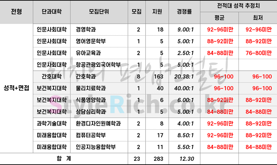* 실기+성적, 성적+면접 전형에서 실기, 면접점수는 공개되지 않아 전적대 성적이 높은 순으로 정렬