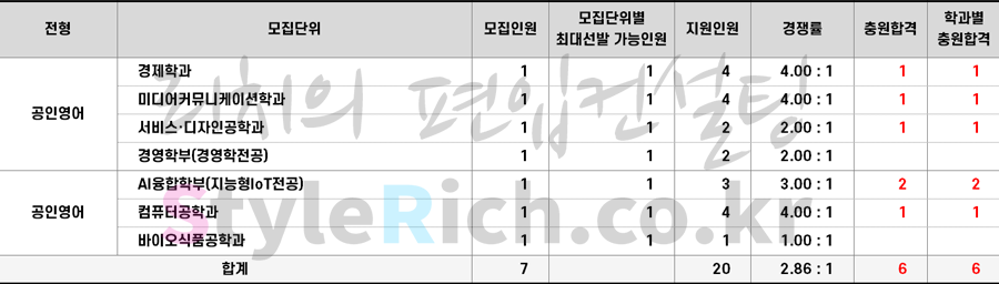 * 추가합격은 합격 후 등록인원을 포기한 인원까지 포함, 학과별 최대선발가능이원 초과로 선발되지 못한 인원은 포함하지 않음