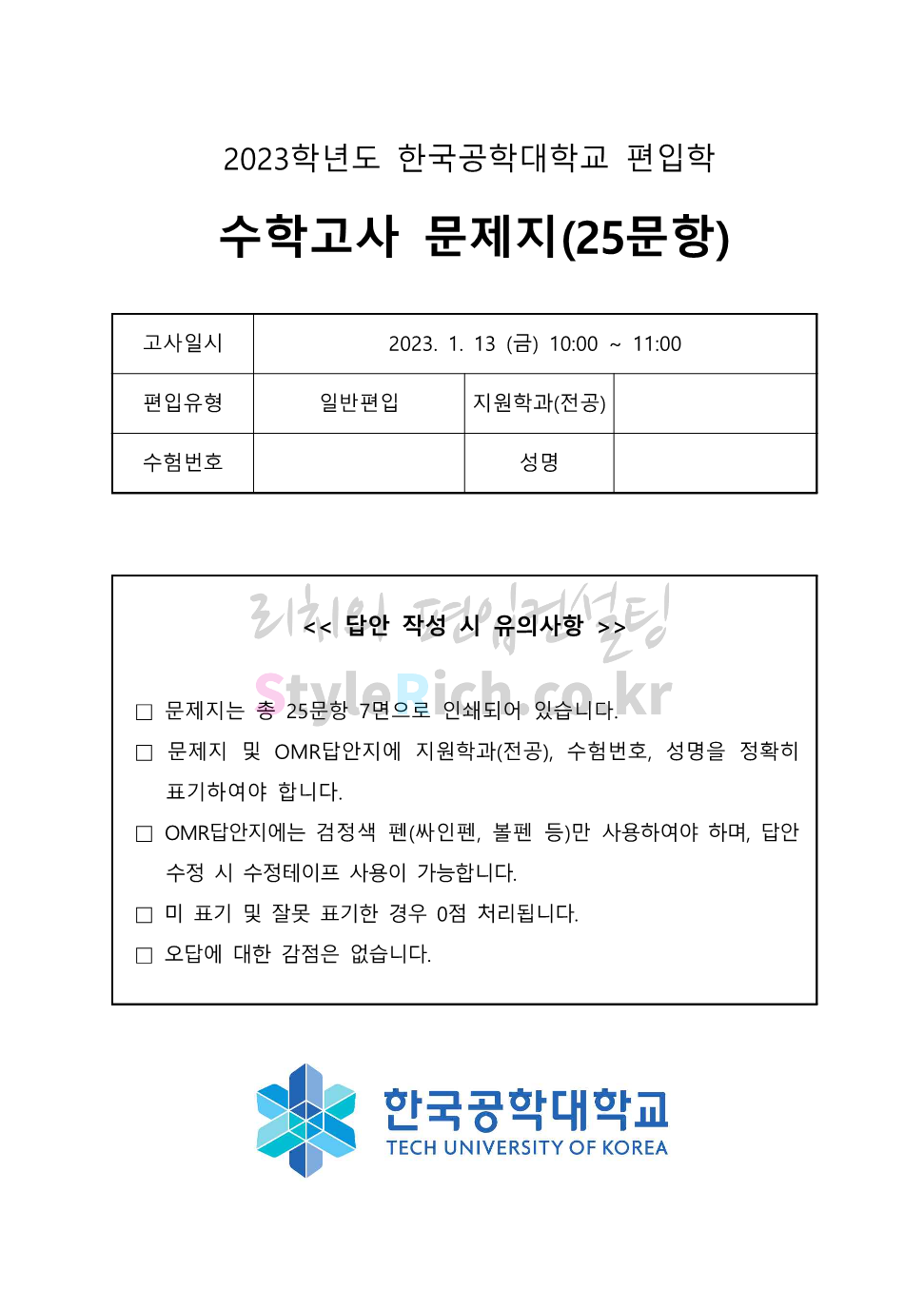 2023학년도 한국공학대 편입 기출문제 수학 25문항/60분, 객관식 4지선다형, 총점 100점 만점에 배점은 3점, 4점, 5점으로 문항마다 다릅니다.