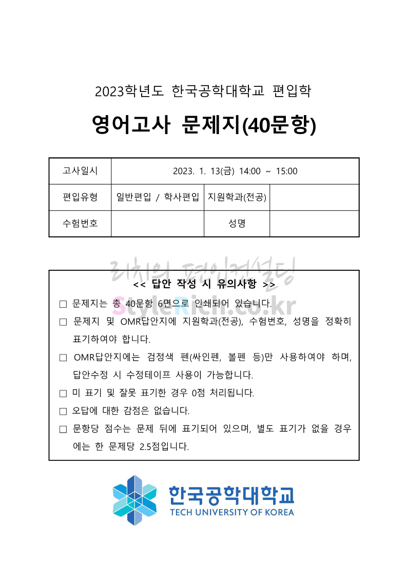 2023학년도 한국공학대 편입 기출문제 영어는 40문항/60분, 객관식 4지선다형, 총점 100점 만점에 배점은 2점, 2.5점, 3점으로 문항마다 다릅니다.