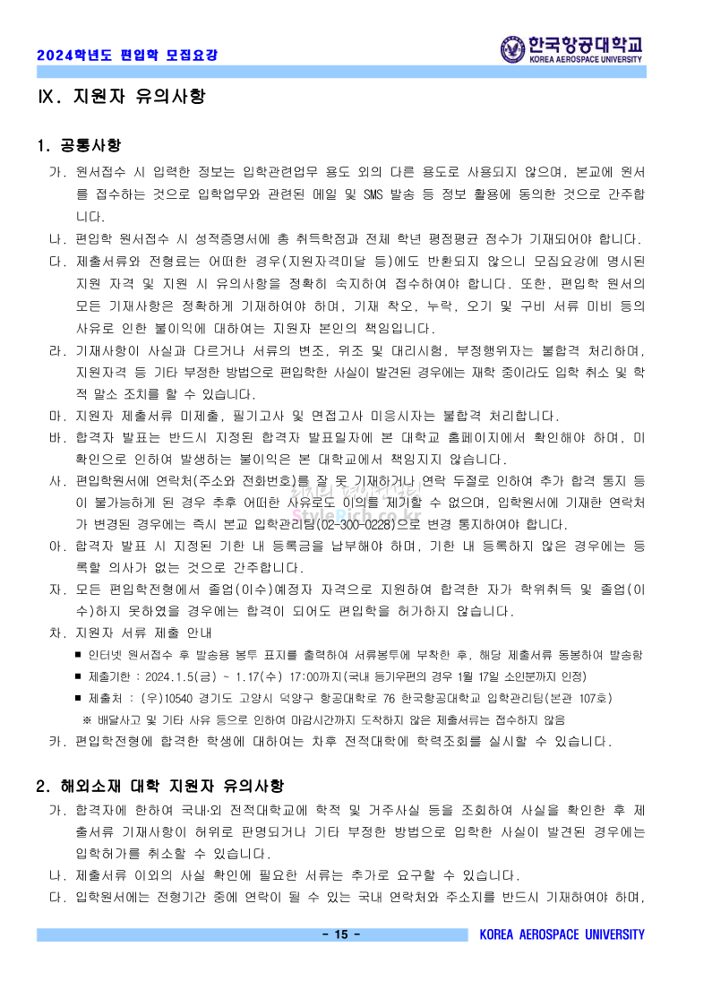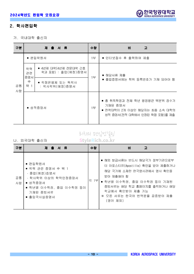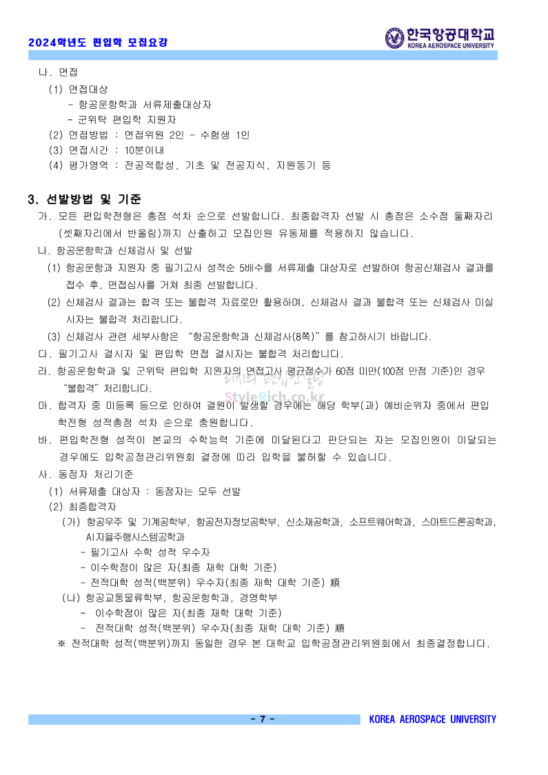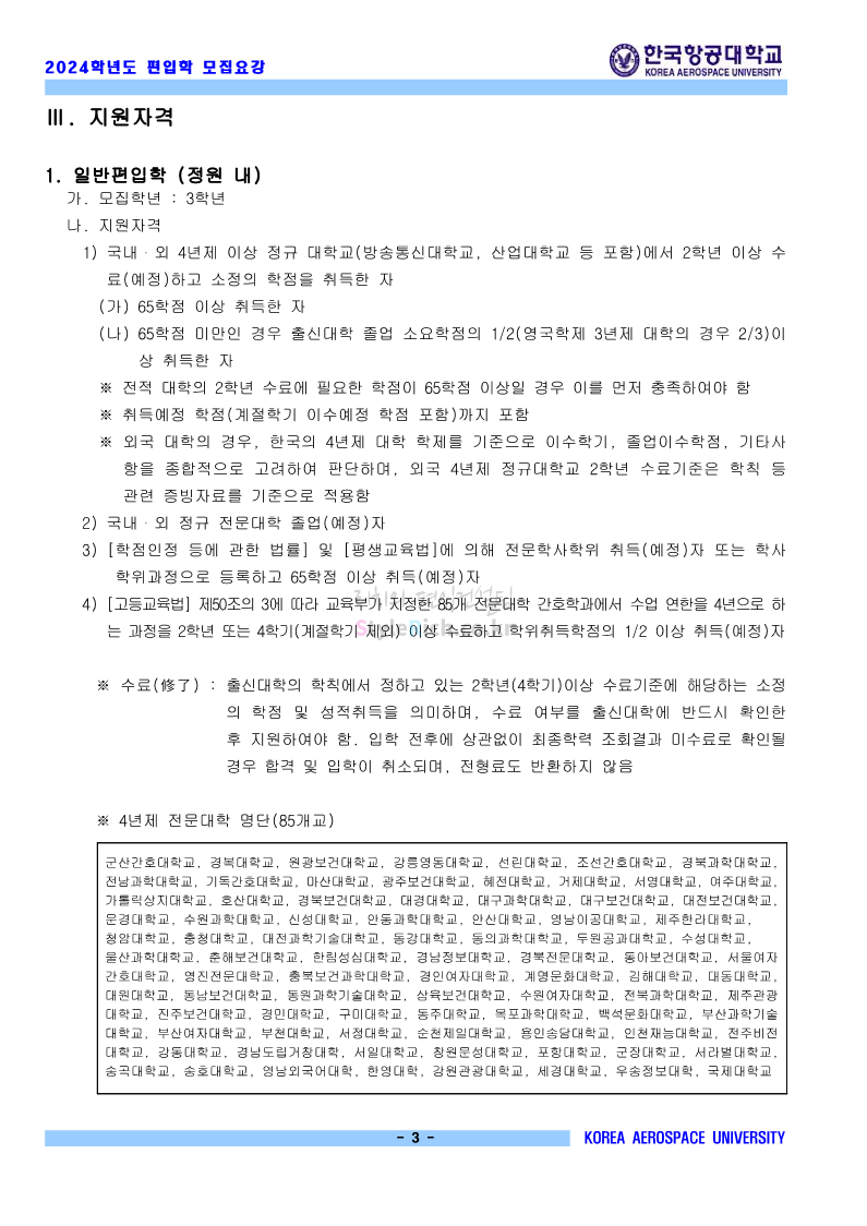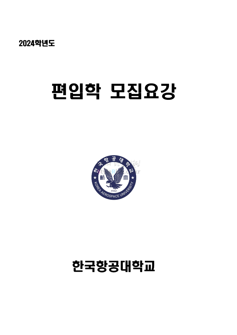 한국항공대 편입 2024학년도 모집요강 간편하게 보자! 2023.11.23 20:28 편입 모집요강/2024학년도 모집요강 2024학년도 한국항공대 편입 모집요강(2023.11.22 기준)을 간편하게 확인하세요. * 최종 모집요강 발표 이후에도 내용의 일부가 변경될 수 있으니 지원 전 반드시 한국항공대 입학처에서 확인하세요. ☞한국항공대 편입 최신 모집요강 확인하기☜ <출처: 한국항공대> 체험 삶의 현장 | 경의중앙선 통학러 편 공유하기 게시글 관리 리치의 편입컨설팅 저작자표시 비영리 변경금지 (새창열림) '편입 모집요강 > 2024학년도 모집요강' 카테고리의 다른 글 명지대 편입 2024학년도 모집요강 간편하게 보자! (0) 2023.11.25 국민대 편입 2024학년도 모집요강 간편하게 보자! (0) 2023.11.25 단국대(죽전) 편입 2024학년도 모집요강 간편하게 보자! (0) 2023.11.23 고려대 편입 2024학년도 자연계 필기고사 출제범위 및 참고도서를 알아보자! (0) 2023.11.23 가천대 편입 2024학년도 모집요강 간편하게 보자! (0) 2023.11.23 댓글 공유하기 다른 글 댓글 이 글 공유하기 구독하기 구독하기 카카오톡 카카오톡 라인 라인 트위터 트위터 Facebook Facebook 카카오스토리 카카오스토리 밴드 밴드 네이버 블로그 네이버 블로그 Pocket Pocket Evernote Evernote 다른 글 명지대 편입 2024학년도 모집요강 간편하게 보자! 명지대 편입 2024학년도 모집요강 간편하게 보자! 2023.11.25 국민대 편입 2024학년도 모집요강 간편하게 보자! 국민대 편입 2024학년도 모집요강 간편하게 보자! 2023.11.25 단국대(죽전) 편입 2024학년도 모집요강 간편하게 보자! 단국대(죽전) 편입 2024학년도 모집요강 간편하게 보자! 2023.11.23 고려대 편입 2024학년도 자연계 필기고사 출제범위 및 참고도서를 알아보자! 고려대 편입 2024학년도 자연계 필기고사 출제범위 및 참고도서를 알아보자! 2023.11.23 다른 글 더 둘러보기