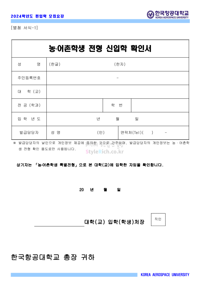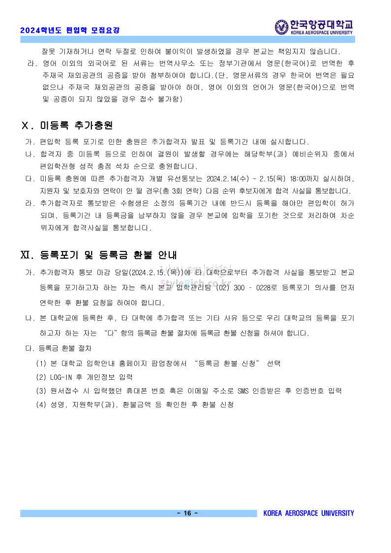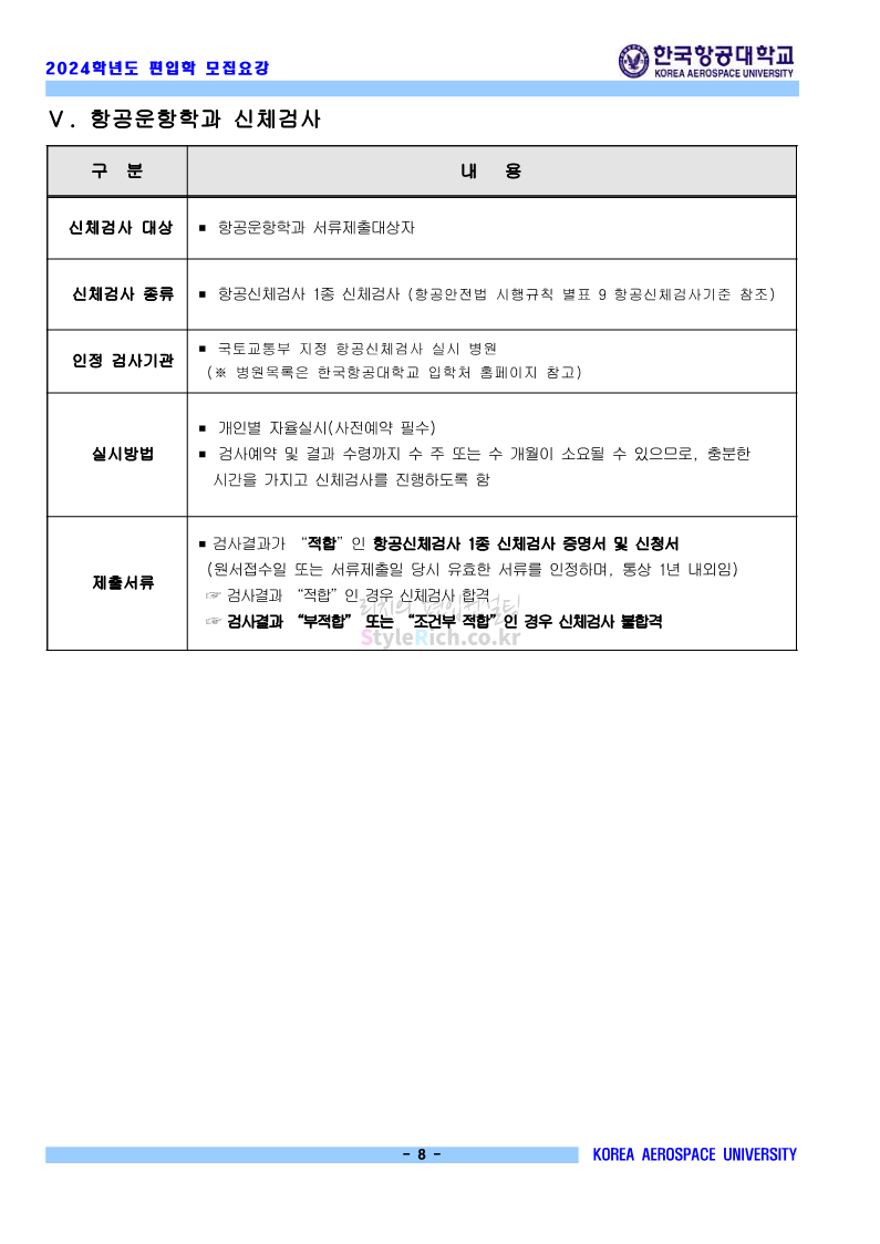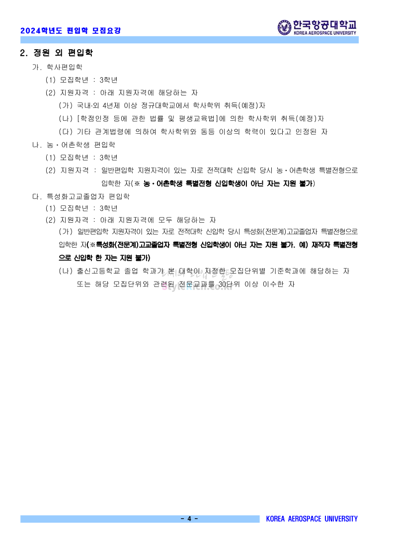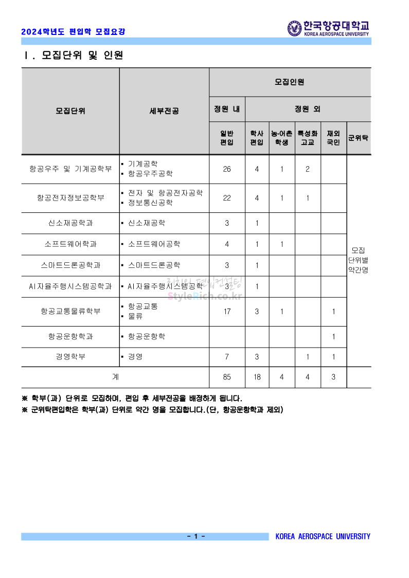 한국항공대 편입 2024학년도 모집요강 간편하게 보자! 2023.11.23 20:28 편입 모집요강/2024학년도 모집요강 2024학년도 한국항공대 편입 모집요강(2023.11.22 기준)을 간편하게 확인하세요. * 최종 모집요강 발표 이후에도 내용의 일부가 변경될 수 있으니 지원 전 반드시 한국항공대 입학처에서 확인하세요. ☞한국항공대 편입 최신 모집요강 확인하기☜ <출처: 한국항공대> 체험 삶의 현장 | 경의중앙선 통학러 편 공유하기 게시글 관리 리치의 편입컨설팅 저작자표시 비영리 변경금지 (새창열림) '편입 모집요강 > 2024학년도 모집요강' 카테고리의 다른 글 명지대 편입 2024학년도 모집요강 간편하게 보자! (0) 2023.11.25 국민대 편입 2024학년도 모집요강 간편하게 보자! (0) 2023.11.25 단국대(죽전) 편입 2024학년도 모집요강 간편하게 보자! (0) 2023.11.23 고려대 편입 2024학년도 자연계 필기고사 출제범위 및 참고도서를 알아보자! (0) 2023.11.23 가천대 편입 2024학년도 모집요강 간편하게 보자! (0) 2023.11.23 댓글 공유하기 다른 글 댓글 이 글 공유하기 구독하기 구독하기 카카오톡 카카오톡 라인 라인 트위터 트위터 Facebook Facebook 카카오스토리 카카오스토리 밴드 밴드 네이버 블로그 네이버 블로그 Pocket Pocket Evernote Evernote 다른 글 명지대 편입 2024학년도 모집요강 간편하게 보자! 명지대 편입 2024학년도 모집요강 간편하게 보자! 2023.11.25 국민대 편입 2024학년도 모집요강 간편하게 보자! 국민대 편입 2024학년도 모집요강 간편하게 보자! 2023.11.25 단국대(죽전) 편입 2024학년도 모집요강 간편하게 보자! 단국대(죽전) 편입 2024학년도 모집요강 간편하게 보자! 2023.11.23 고려대 편입 2024학년도 자연계 필기고사 출제범위 및 참고도서를 알아보자! 고려대 편입 2024학년도 자연계 필기고사 출제범위 및 참고도서를 알아보자! 2023.11.23 다른 글 더 둘러보기
