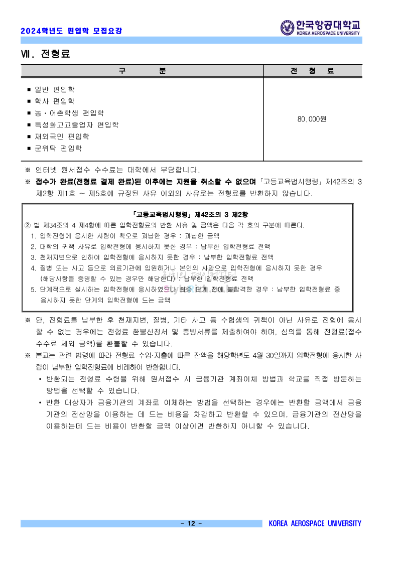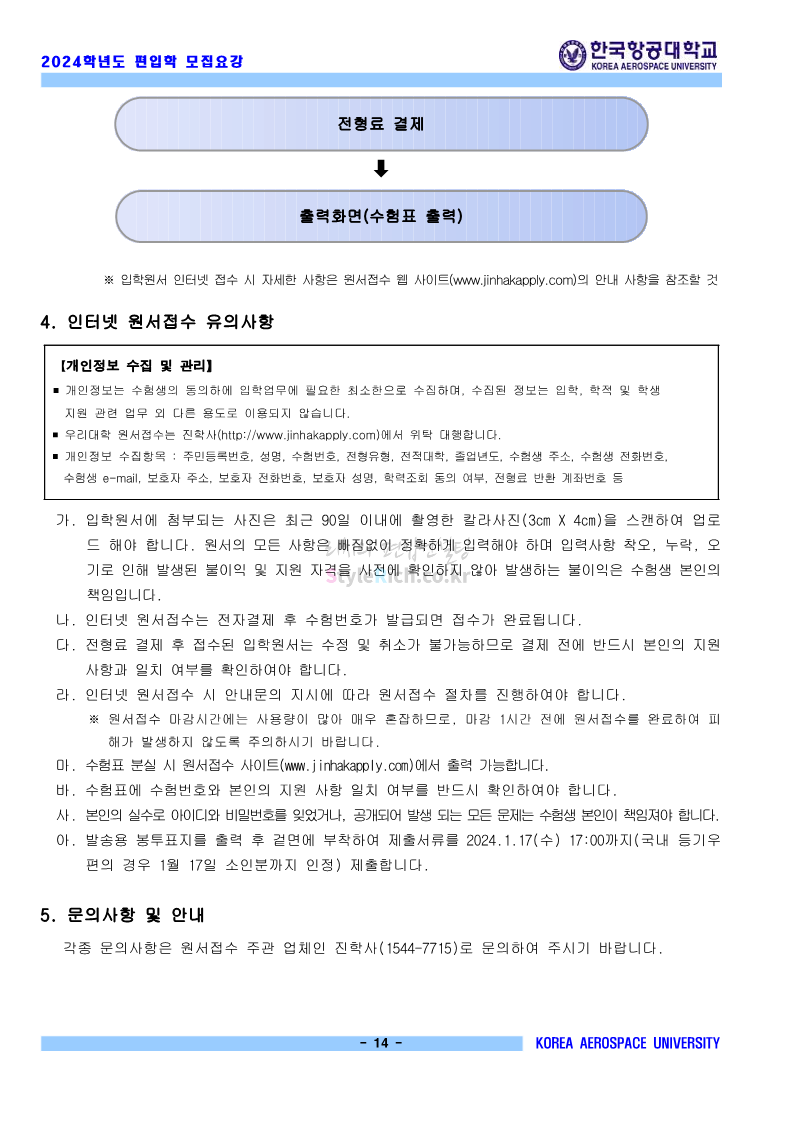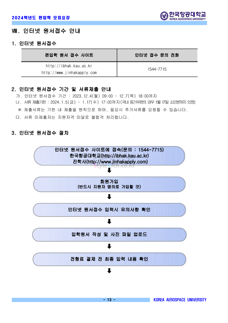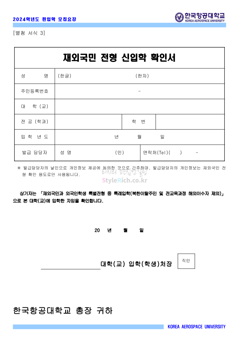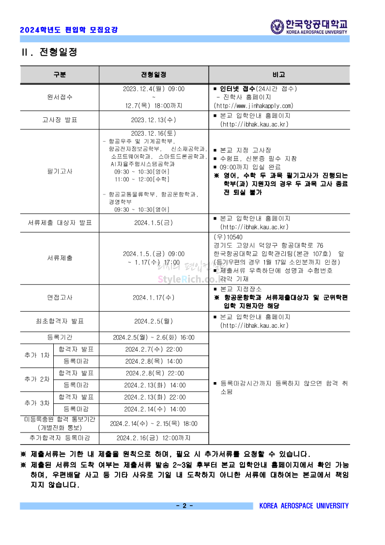 한국항공대 편입 2024학년도 모집요강 간편하게 보자! 2023.11.23 20:28 편입 모집요강/2024학년도 모집요강 2024학년도 한국항공대 편입 모집요강(2023.11.22 기준)을 간편하게 확인하세요. * 최종 모집요강 발표 이후에도 내용의 일부가 변경될 수 있으니 지원 전 반드시 한국항공대 입학처에서 확인하세요. ☞한국항공대 편입 최신 모집요강 확인하기☜ <출처: 한국항공대> 체험 삶의 현장 | 경의중앙선 통학러 편 공유하기 게시글 관리 리치의 편입컨설팅 저작자표시 비영리 변경금지 (새창열림) '편입 모집요강 > 2024학년도 모집요강' 카테고리의 다른 글 명지대 편입 2024학년도 모집요강 간편하게 보자! (0) 2023.11.25 국민대 편입 2024학년도 모집요강 간편하게 보자! (0) 2023.11.25 단국대(죽전) 편입 2024학년도 모집요강 간편하게 보자! (0) 2023.11.23 고려대 편입 2024학년도 자연계 필기고사 출제범위 및 참고도서를 알아보자! (0) 2023.11.23 가천대 편입 2024학년도 모집요강 간편하게 보자! (0) 2023.11.23 댓글 공유하기 다른 글 댓글 이 글 공유하기 구독하기 구독하기 카카오톡 카카오톡 라인 라인 트위터 트위터 Facebook Facebook 카카오스토리 카카오스토리 밴드 밴드 네이버 블로그 네이버 블로그 Pocket Pocket Evernote Evernote 다른 글 명지대 편입 2024학년도 모집요강 간편하게 보자! 명지대 편입 2024학년도 모집요강 간편하게 보자! 2023.11.25 국민대 편입 2024학년도 모집요강 간편하게 보자! 국민대 편입 2024학년도 모집요강 간편하게 보자! 2023.11.25 단국대(죽전) 편입 2024학년도 모집요강 간편하게 보자! 단국대(죽전) 편입 2024학년도 모집요강 간편하게 보자! 2023.11.23 고려대 편입 2024학년도 자연계 필기고사 출제범위 및 참고도서를 알아보자! 고려대 편입 2024학년도 자연계 필기고사 출제범위 및 참고도서를 알아보자! 2023.11.23 다른 글 더 둘러보기