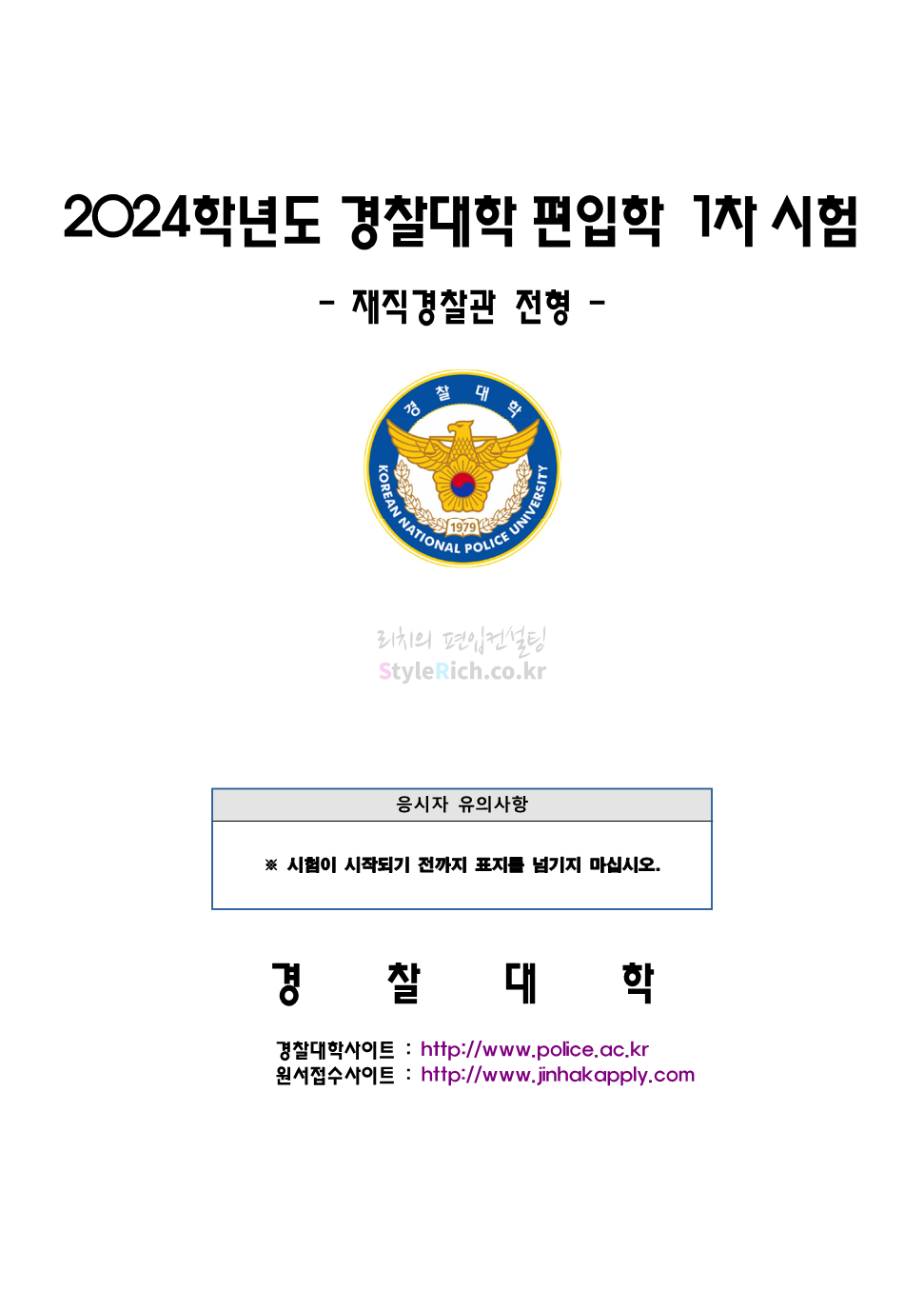 재직경찰관 전형 형사법은 40문항/60분, 객관식 5지선다형, 총점 100점 만점에 문항 당 배점은 2.5점으로 형법, 형사소송법, 형사특별법 문제로 구성되어 있습니다.