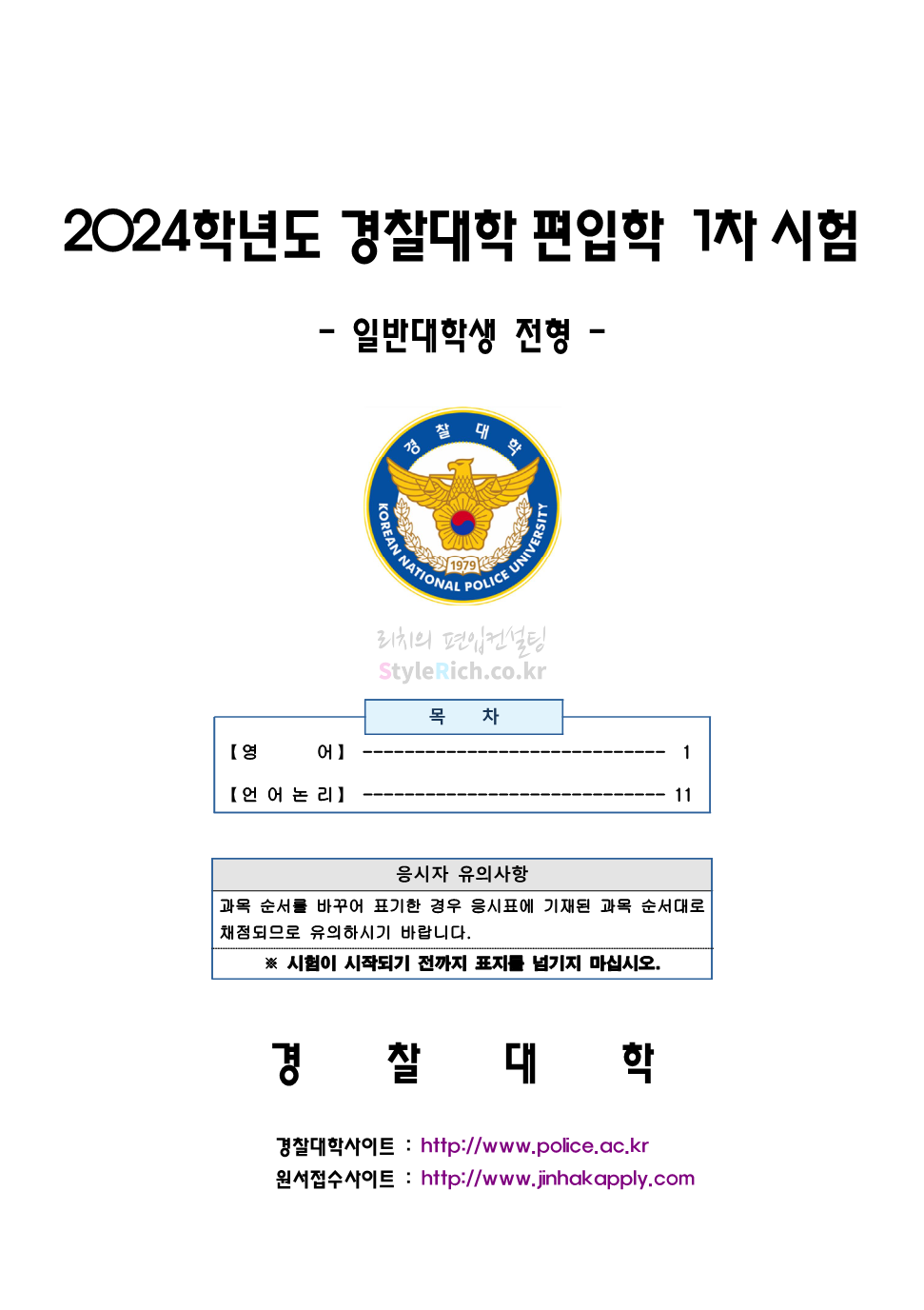 2024학년도 경찰대 편입 1차시험 기출문제 일반대학생 전형 영어는 40문항/60분, 객관식 5지선다형, 총점 100점 만점에 문항 당 배점은 2.5점입니다. 언어논리는 25문항/60분, 객관식 5지선다형, 총점 100점 만점에 문항 당 배점은 4점으로 인문사회·과학기술·문화예술 영역 등 폭넓은 분야에서 사실적·추론적·비판적 사고력을 평가하는 문제로 구성되어 있습니다.