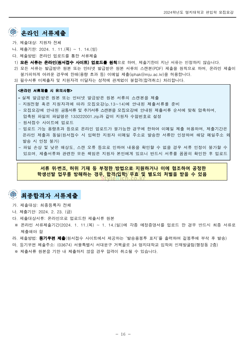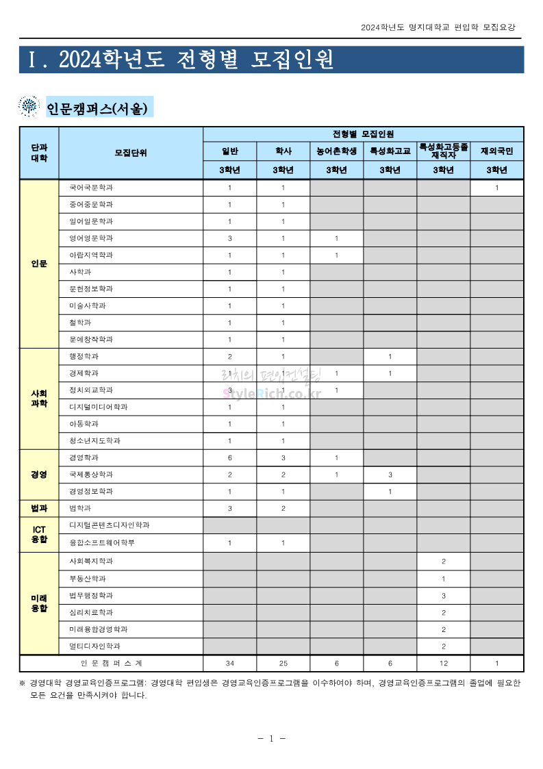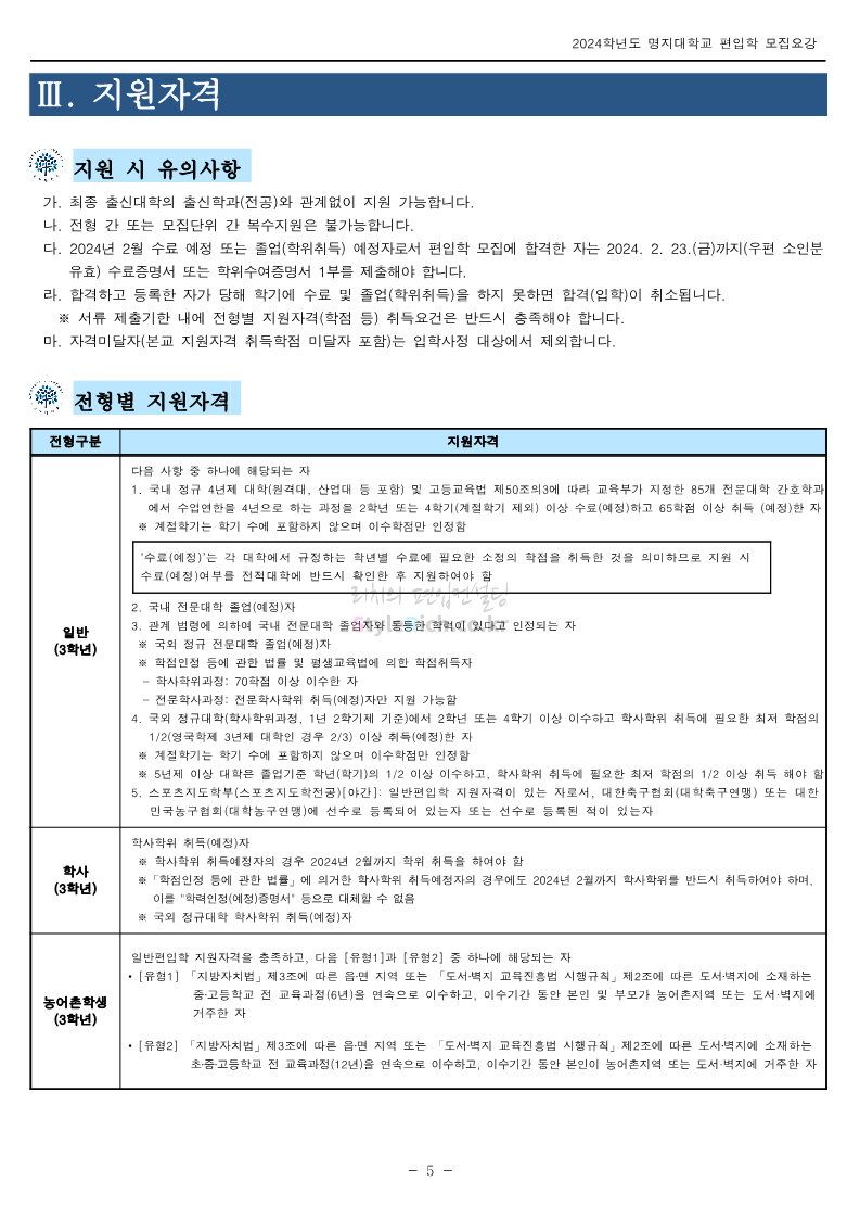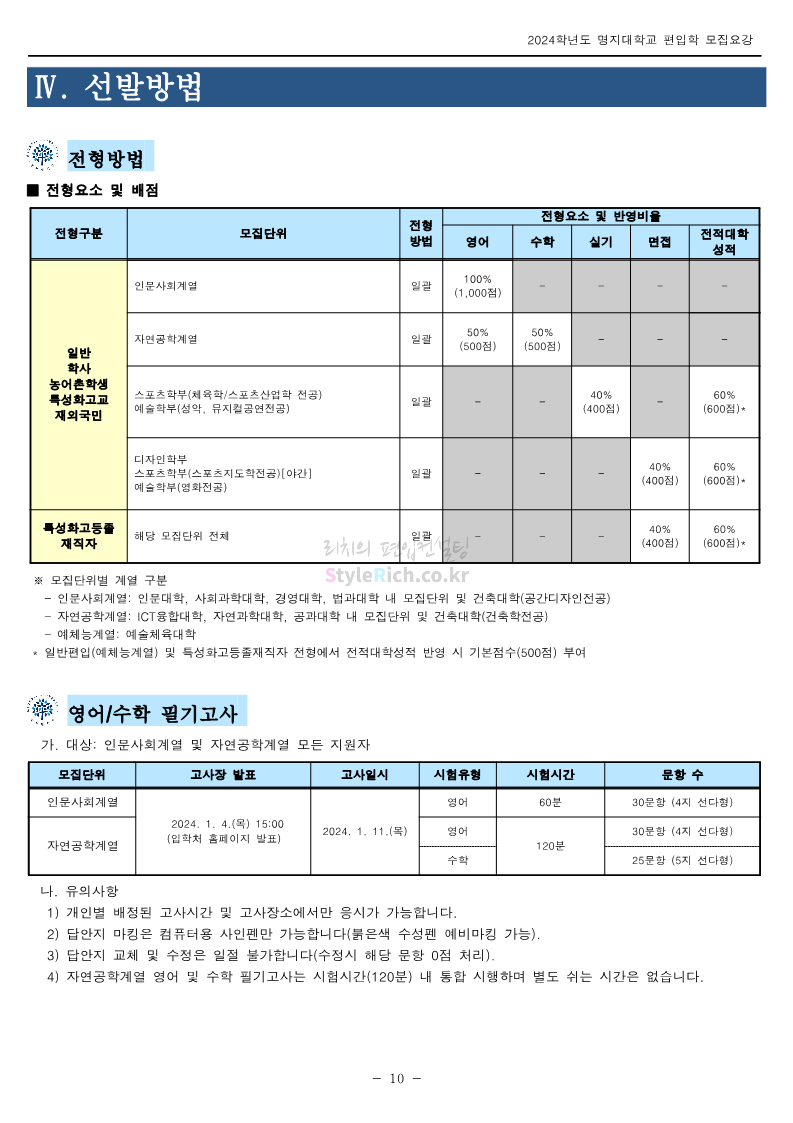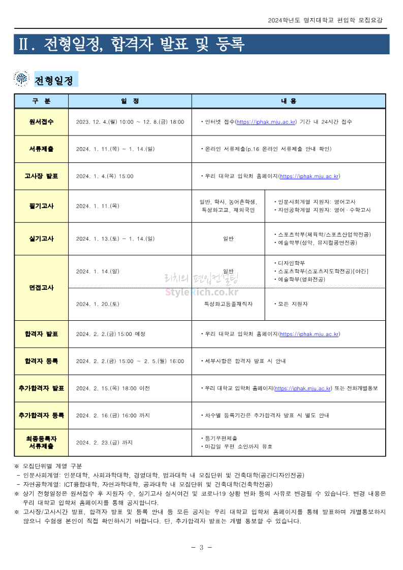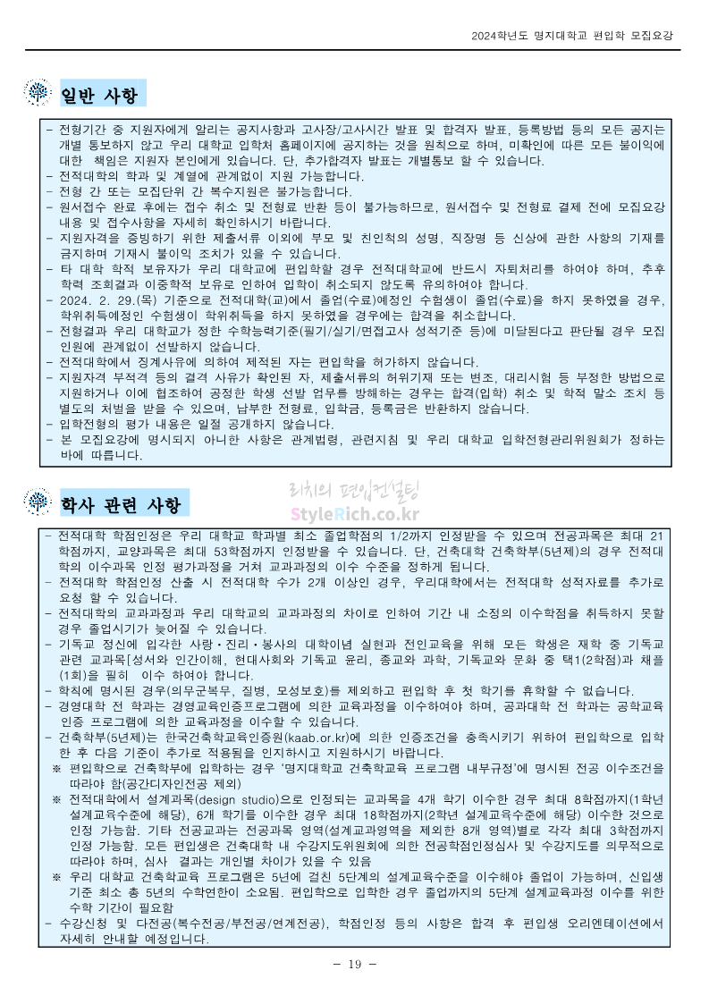 명지대 편입 2024학년도 모집요강 간편하게 보자! 2023.11.25 02:17 편입 모집요강/2024학년도 모집요강 2024학년도 명지대 편입 모집요강(2023.11.28 수정 기준)을 간편하게 확인하세요. * 최종 모집요강 발표 이후에도 내용의 일부가 변경될 수 있으니 지원 전 반드시 명지대 입학처에서 확인하세요. ☞명지대 편입 최신 모집요강 확인하기☜ <출처: 명지대> 공유하기 게시글 관리 리치의 편입컨설팅 저작자표시 비영리 변경금지 (새창열림) '편입 모집요강 > 2024학년도 모집요강' 카테고리의 다른 글 경기대 편입 2024학년도 모집요강 간편하게 보자! (0) 2023.11.27 한국항공대 편입 2024학년도 모집요강 간편하게 보자! (0) 2023.11.25 국민대 편입 2024학년도 모집요강 간편하게 보자! (0) 2023.11.25 한국항공대 편입 2024학년도 모집요강 간편하게 보자! (0) 2023.11.23 단국대(죽전) 편입 2024학년도 모집요강 간편하게 보자! (0) 2023.11.23 댓글 공유하기 다른 글 댓글 이 글 공유하기 구독하기 구독하기 카카오톡 카카오톡 라인 라인 트위터 트위터 Facebook Facebook 카카오스토리 카카오스토리 밴드 밴드 네이버 블로그 네이버 블로그 Pocket Pocket Evernote Evernote 다른 글 경기대 편입 2024학년도 모집요강 간편하게 보자! 경기대 편입 2024학년도 모집요강 간편하게 보자! 2023.11.27 한국항공대 편입 2024학년도 모집요강 간편하게 보자! 한국항공대 편입 2024학년도 모집요강 간편하게 보자! 2023.11.25 국민대 편입 2024학년도 모집요강 간편하게 보자! 국민대 편입 2024학년도 모집요강 간편하게 보자! 2023.11.25 한국항공대 편입 2024학년도 모집요강 간편하게 보자! 한국항공대 편입 2024학년도 모집요강 간편하게 보자! 2023.11.23 다른 글 더 둘러보기