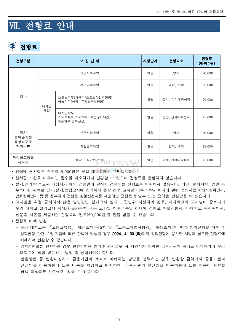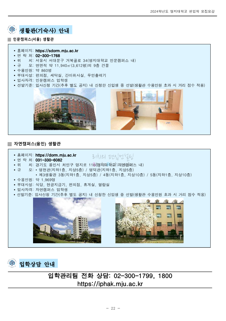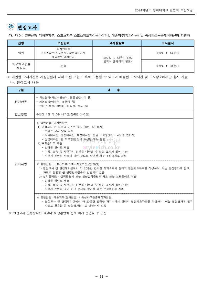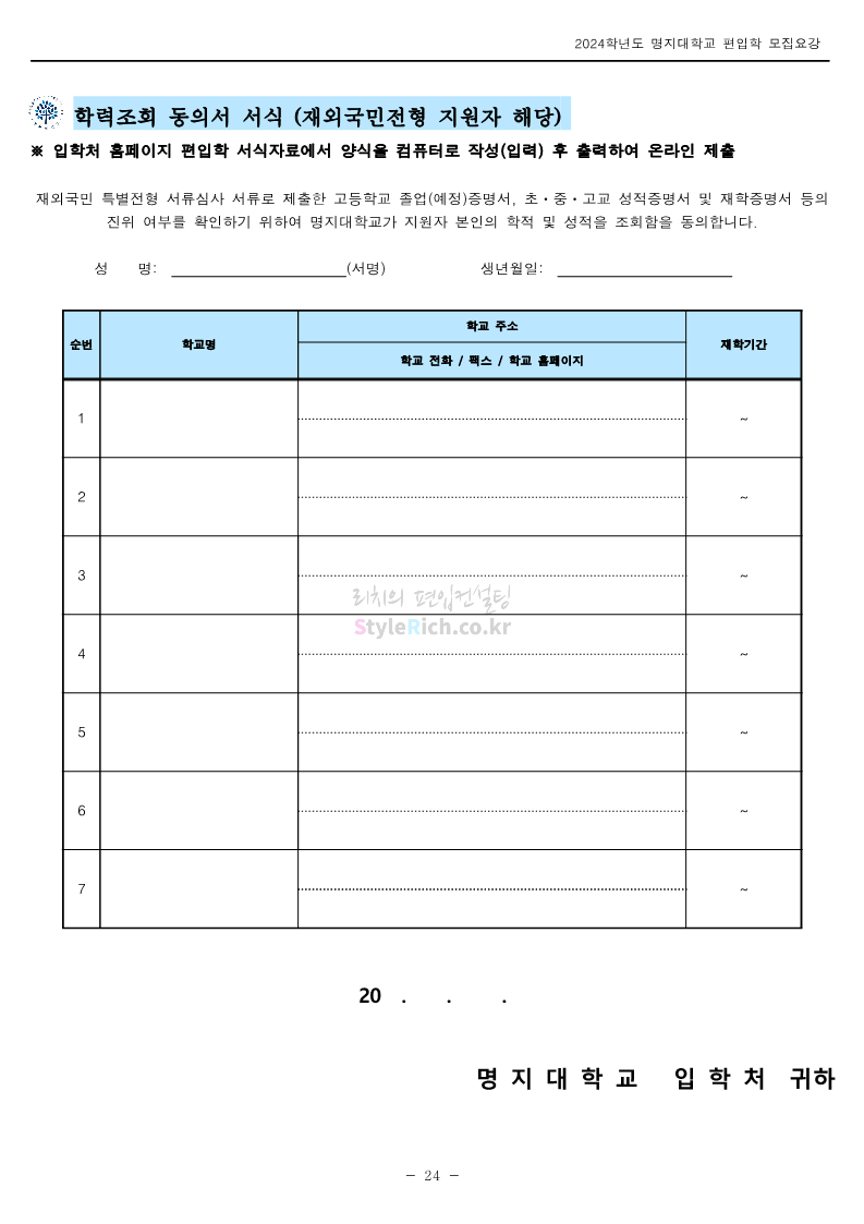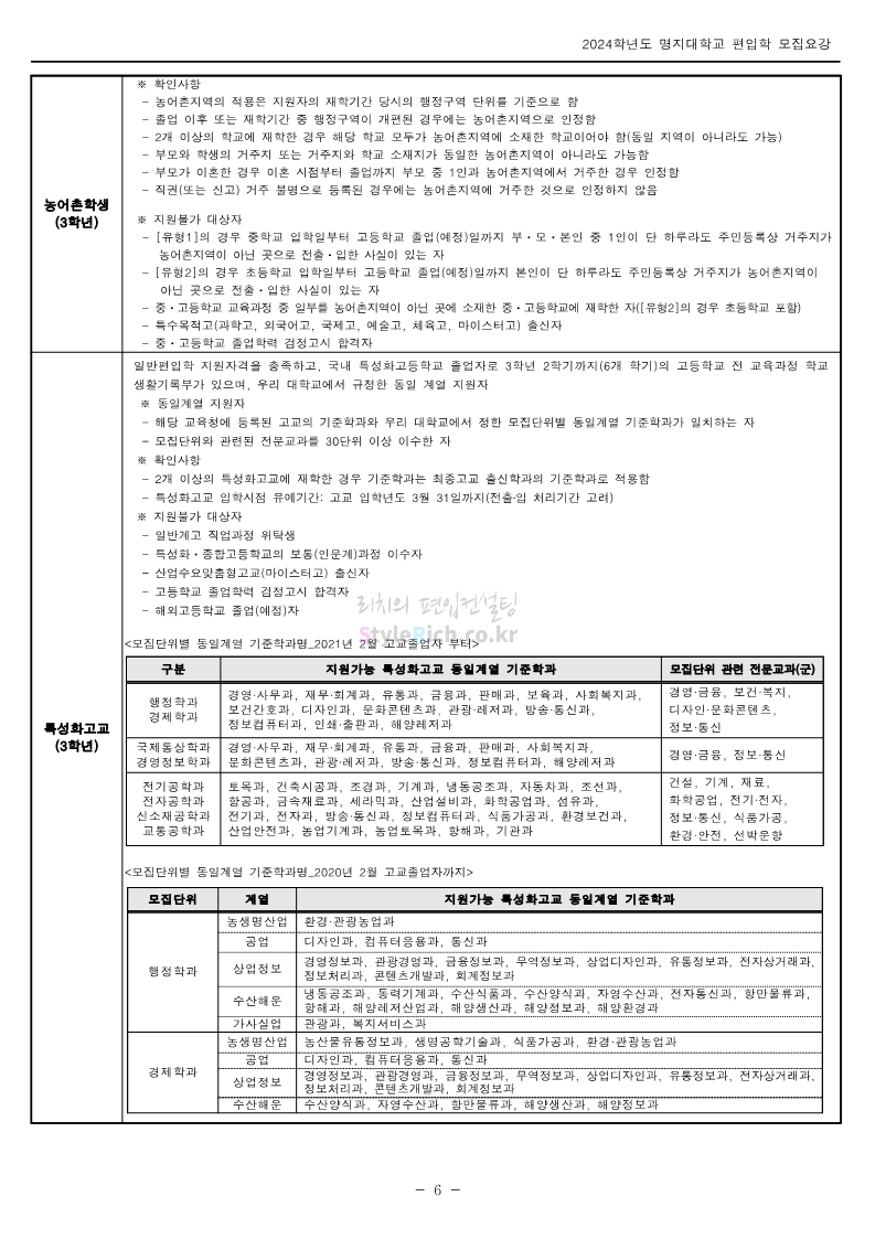 명지대 편입 2024학년도 모집요강 간편하게 보자! 2023.11.25 02:17 편입 모집요강/2024학년도 모집요강 2024학년도 명지대 편입 모집요강(2023.11.28 수정 기준)을 간편하게 확인하세요. * 최종 모집요강 발표 이후에도 내용의 일부가 변경될 수 있으니 지원 전 반드시 명지대 입학처에서 확인하세요. ☞명지대 편입 최신 모집요강 확인하기☜ <출처: 명지대> 공유하기 게시글 관리 리치의 편입컨설팅 저작자표시 비영리 변경금지 (새창열림) '편입 모집요강 > 2024학년도 모집요강' 카테고리의 다른 글 경기대 편입 2024학년도 모집요강 간편하게 보자! (0) 2023.11.27 한국항공대 편입 2024학년도 모집요강 간편하게 보자! (0) 2023.11.25 국민대 편입 2024학년도 모집요강 간편하게 보자! (0) 2023.11.25 한국항공대 편입 2024학년도 모집요강 간편하게 보자! (0) 2023.11.23 단국대(죽전) 편입 2024학년도 모집요강 간편하게 보자! (0) 2023.11.23 댓글 공유하기 다른 글 댓글 이 글 공유하기 구독하기 구독하기 카카오톡 카카오톡 라인 라인 트위터 트위터 Facebook Facebook 카카오스토리 카카오스토리 밴드 밴드 네이버 블로그 네이버 블로그 Pocket Pocket Evernote Evernote 다른 글 경기대 편입 2024학년도 모집요강 간편하게 보자! 경기대 편입 2024학년도 모집요강 간편하게 보자! 2023.11.27 한국항공대 편입 2024학년도 모집요강 간편하게 보자! 한국항공대 편입 2024학년도 모집요강 간편하게 보자! 2023.11.25 국민대 편입 2024학년도 모집요강 간편하게 보자! 국민대 편입 2024학년도 모집요강 간편하게 보자! 2023.11.25 한국항공대 편입 2024학년도 모집요강 간편하게 보자! 한국항공대 편입 2024학년도 모집요강 간편하게 보자! 2023.11.23 다른 글 더 둘러보기