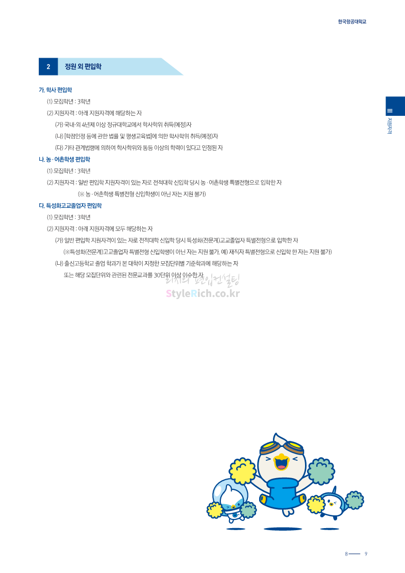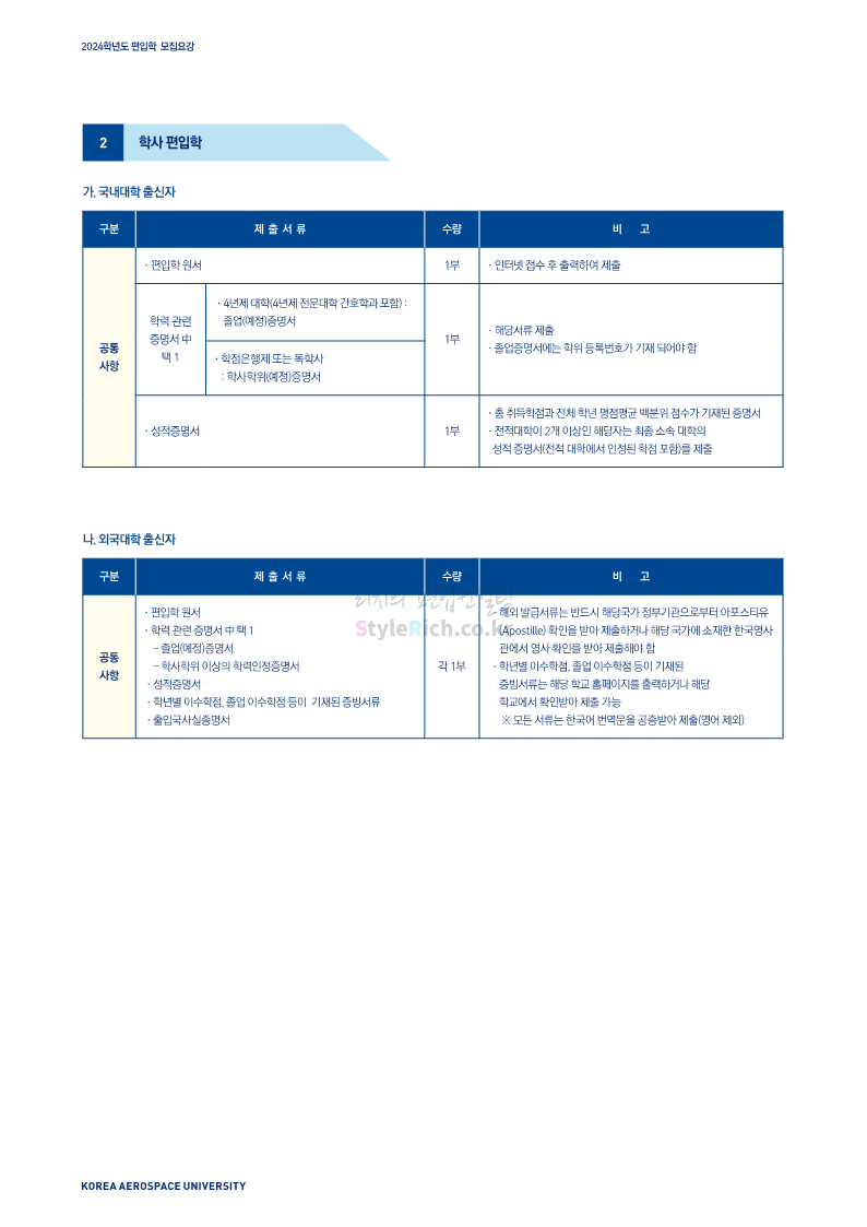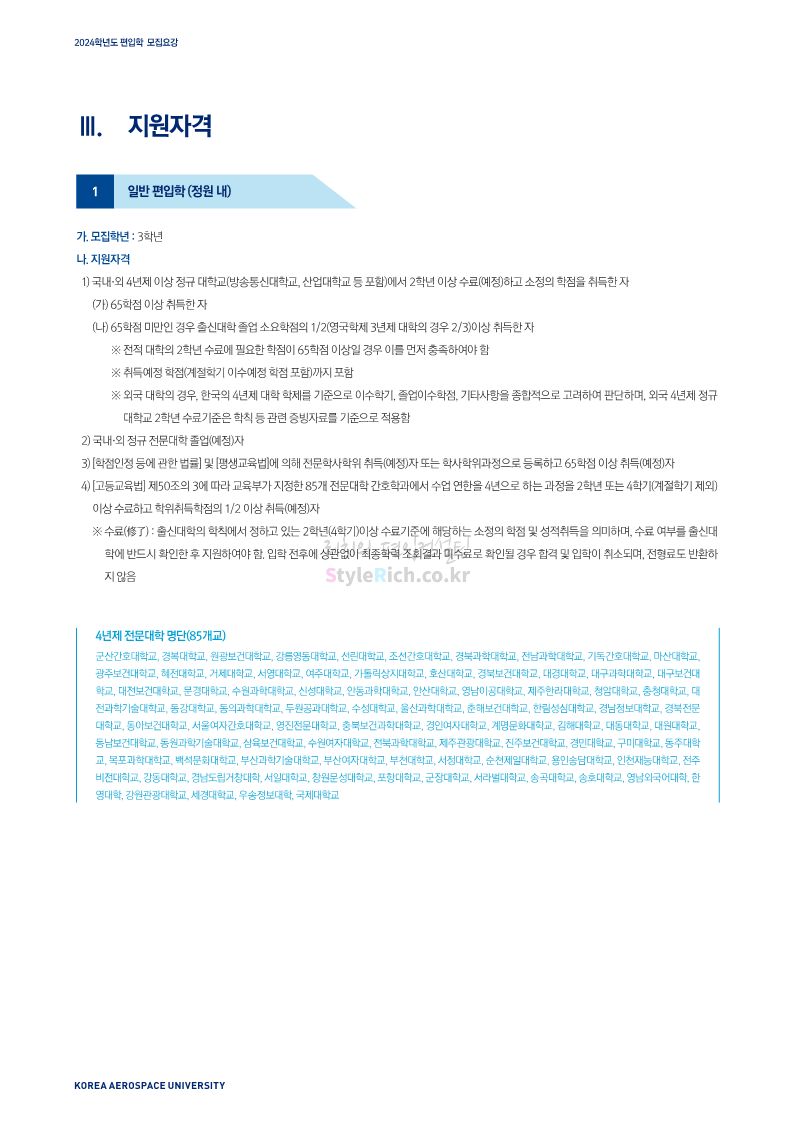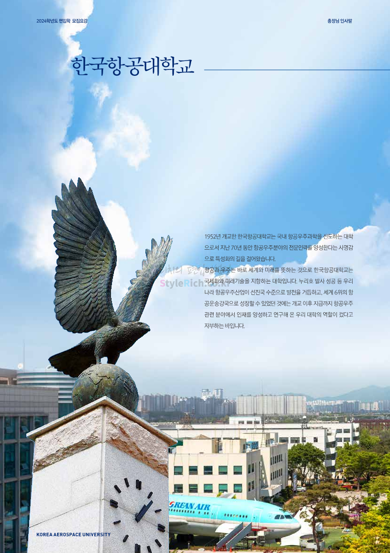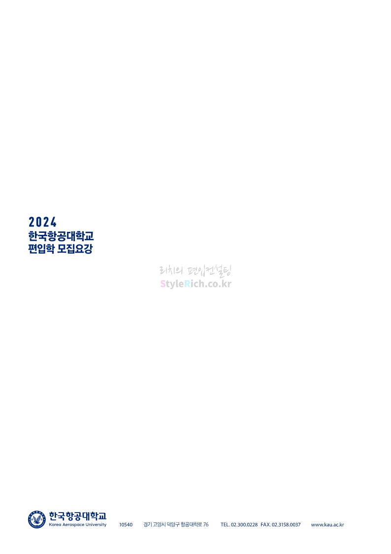 한국항공대 편입 2024학년도 모집요강 간편하게 보자! 2023.11.25 08:37 편입 모집요강/2024학년도 모집요강 2024학년도 한국항공대 편입 모집요강(2023.11.24 기준)을 간편하게 확인하세요. * 최종 모집요강 발표 이후에도 내용의 일부가 변경될 수 있으니 지원 전 반드시 한국항공대 입학처에서 확인하세요. ☞한국항공대 편입 최신 모집요강 확인하기☜ <출처: 한국항공대> 공유하기 게시글 관리 리치의 편입컨설팅 저작자표시 비영리 변경금지 (새창열림) '편입 모집요강 > 2024학년도 모집요강' 카테고리의 다른 글 수원대 편입 2024학년도 모집요강 간편하게 보자! (0) 2023.11.27 경기대 편입 2024학년도 모집요강 간편하게 보자! (0) 2023.11.27 명지대 편입 2024학년도 모집요강 간편하게 보자! (0) 2023.11.25 국민대 편입 2024학년도 모집요강 간편하게 보자! (0) 2023.11.25 한국항공대 편입 2024학년도 모집요강 간편하게 보자! (0) 2023.11.23 댓글 공유하기 다른 글 댓글 이 글 공유하기 구독하기 구독하기 카카오톡 카카오톡 라인 라인 트위터 트위터 Facebook Facebook 카카오스토리 카카오스토리 밴드 밴드 네이버 블로그 네이버 블로그 Pocket Pocket Evernote Evernote 다른 글 수원대 편입 2024학년도 모집요강 간편하게 보자! 수원대 편입 2024학년도 모집요강 간편하게 보자! 2023.11.27 경기대 편입 2024학년도 모집요강 간편하게 보자! 경기대 편입 2024학년도 모집요강 간편하게 보자! 2023.11.27 명지대 편입 2024학년도 모집요강 간편하게 보자! 명지대 편입 2024학년도 모집요강 간편하게 보자! 2023.11.25 국민대 편입 2024학년도 모집요강 간편하게 보자! 국민대 편입 2024학년도 모집요강 간편하게 보자! 2023.11.25 다른 글 더 둘러보기
