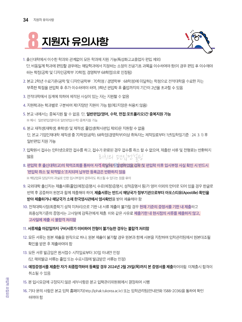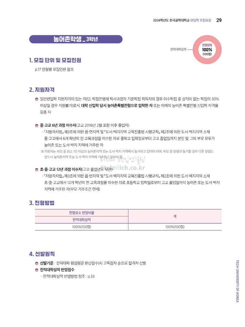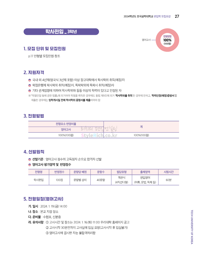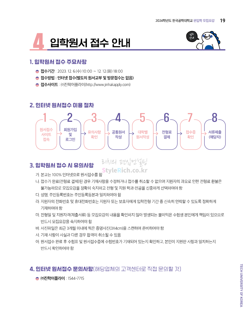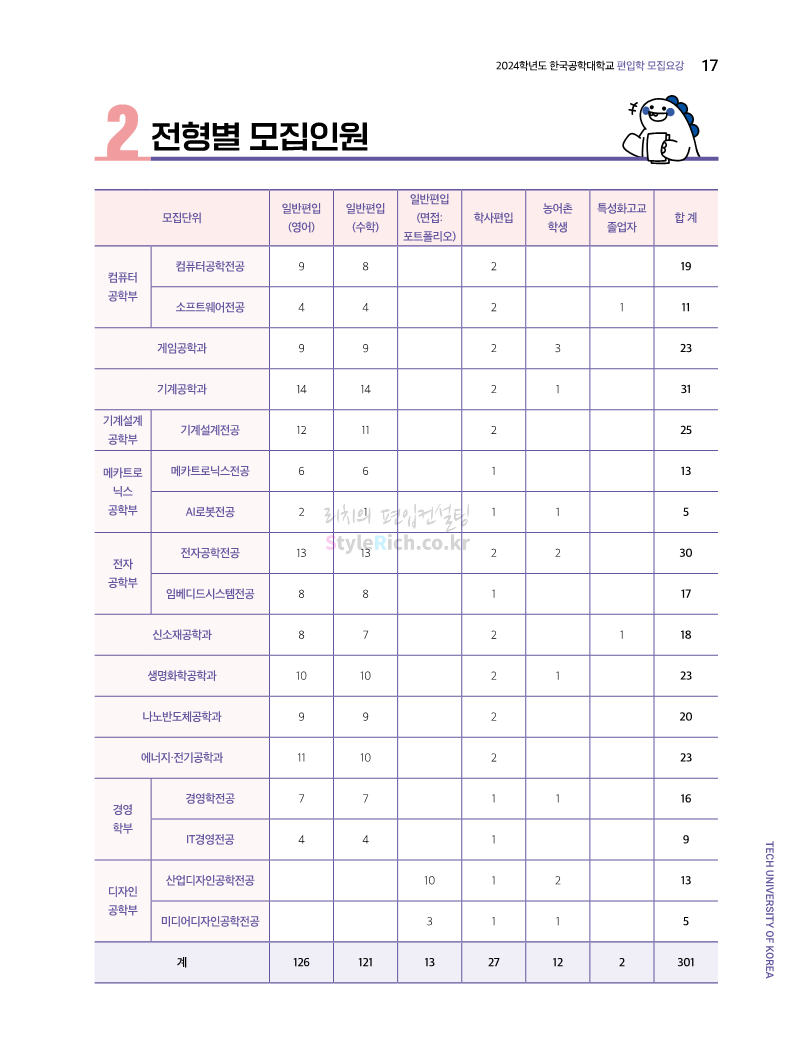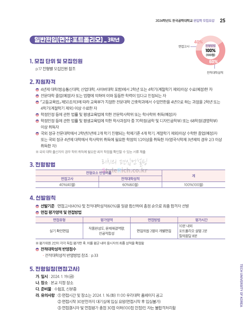 한국공학대 편입 2024학년도 모집요강 간편하게 보자! 2023.11.27 23:45 편입 모집요강/2024학년도 모집요강 2024학년도 한국공학대 편입 모집요강(2023.11.27 기준)을 간편하게 확인하세요. * 최종 모집요강 발표 이후에도 내용의 일부가 변경될 수 있으니 지원 전 반드시 한국공학대 입학처에서 확인하세요. ☞한국공학대 편입 최신 모집요강 확인하기 ☜ <출처: 한국공학대> 공유하기 게시글 관리 리치의 편입컨설팅 저작자표시 비영리 변경금지 (새창열림) '편입 모집요강 > 2024학년도 모집요강' 카테고리의 다른 글 아주대 편입 2024학년도 모집요강 간편하게 보자! (0) 2023.11.29 고려대 편입 2024학년도 모집요강 간편하게 보자! (0) 2023.11.29 수원대 편입 2024학년도 모집요강 간편하게 보자! (0) 2023.11.27 경기대 편입 2024학년도 모집요강 간편하게 보자! (0) 2023.11.27 한국항공대 편입 2024학년도 모집요강 간편하게 보자! (0) 2023.11.25 댓글 공유하기 다른 글 댓글 이 글 공유하기 구독하기 구독하기 카카오톡 카카오톡 라인 라인 트위터 트위터 Facebook Facebook 카카오스토리 카카오스토리 밴드 밴드 네이버 블로그 네이버 블로그 Pocket Pocket Evernote Evernote 다른 글 아주대 편입 2024학년도 모집요강 간편하게 보자! 아주대 편입 2024학년도 모집요강 간편하게 보자! 2023.11.29 고려대 편입 2024학년도 모집요강 간편하게 보자! 고려대 편입 2024학년도 모집요강 간편하게 보자! 2023.11.29 수원대 편입 2024학년도 모집요강 간편하게 보자! 수원대 편입 2024학년도 모집요강 간편하게 보자! 2023.11.27 경기대 편입 2024학년도 모집요강 간편하게 보자! 경기대 편입 2024학년도 모집요강 간편하게 보자! 2023.11.27 다른 글 더 둘러보기