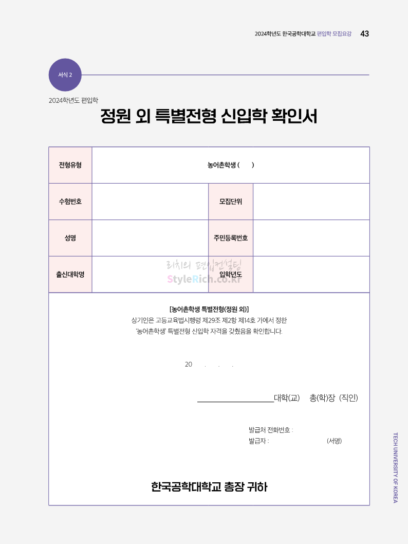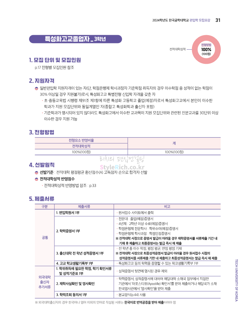 한국공학대 편입 2024학년도 모집요강 간편하게 보자! 2023.11.27 23:45 편입 모집요강/2024학년도 모집요강 2024학년도 한국공학대 편입 모집요강(2023.11.27 기준)을 간편하게 확인하세요. * 최종 모집요강 발표 이후에도 내용의 일부가 변경될 수 있으니 지원 전 반드시 한국공학대 입학처에서 확인하세요. ☞한국공학대 편입 최신 모집요강 확인하기 ☜ <출처: 한국공학대> 공유하기 게시글 관리 리치의 편입컨설팅 저작자표시 비영리 변경금지 (새창열림) '편입 모집요강 > 2024학년도 모집요강' 카테고리의 다른 글 아주대 편입 2024학년도 모집요강 간편하게 보자! (0) 2023.11.29 고려대 편입 2024학년도 모집요강 간편하게 보자! (0) 2023.11.29 수원대 편입 2024학년도 모집요강 간편하게 보자! (0) 2023.11.27 경기대 편입 2024학년도 모집요강 간편하게 보자! (0) 2023.11.27 한국항공대 편입 2024학년도 모집요강 간편하게 보자! (0) 2023.11.25 댓글 공유하기 다른 글 댓글 이 글 공유하기 구독하기 구독하기 카카오톡 카카오톡 라인 라인 트위터 트위터 Facebook Facebook 카카오스토리 카카오스토리 밴드 밴드 네이버 블로그 네이버 블로그 Pocket Pocket Evernote Evernote 다른 글 아주대 편입 2024학년도 모집요강 간편하게 보자! 아주대 편입 2024학년도 모집요강 간편하게 보자! 2023.11.29 고려대 편입 2024학년도 모집요강 간편하게 보자! 고려대 편입 2024학년도 모집요강 간편하게 보자! 2023.11.29 수원대 편입 2024학년도 모집요강 간편하게 보자! 수원대 편입 2024학년도 모집요강 간편하게 보자! 2023.11.27 경기대 편입 2024학년도 모집요강 간편하게 보자! 경기대 편입 2024학년도 모집요강 간편하게 보자! 2023.11.27 다른 글 더 둘러보기