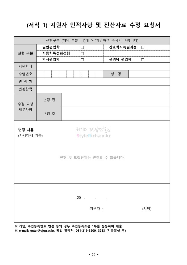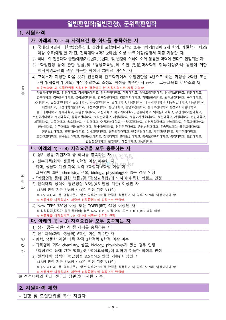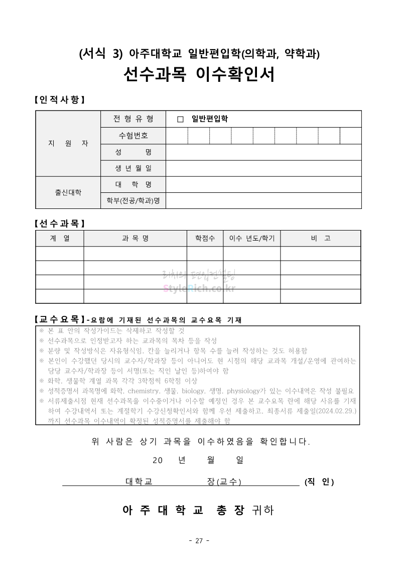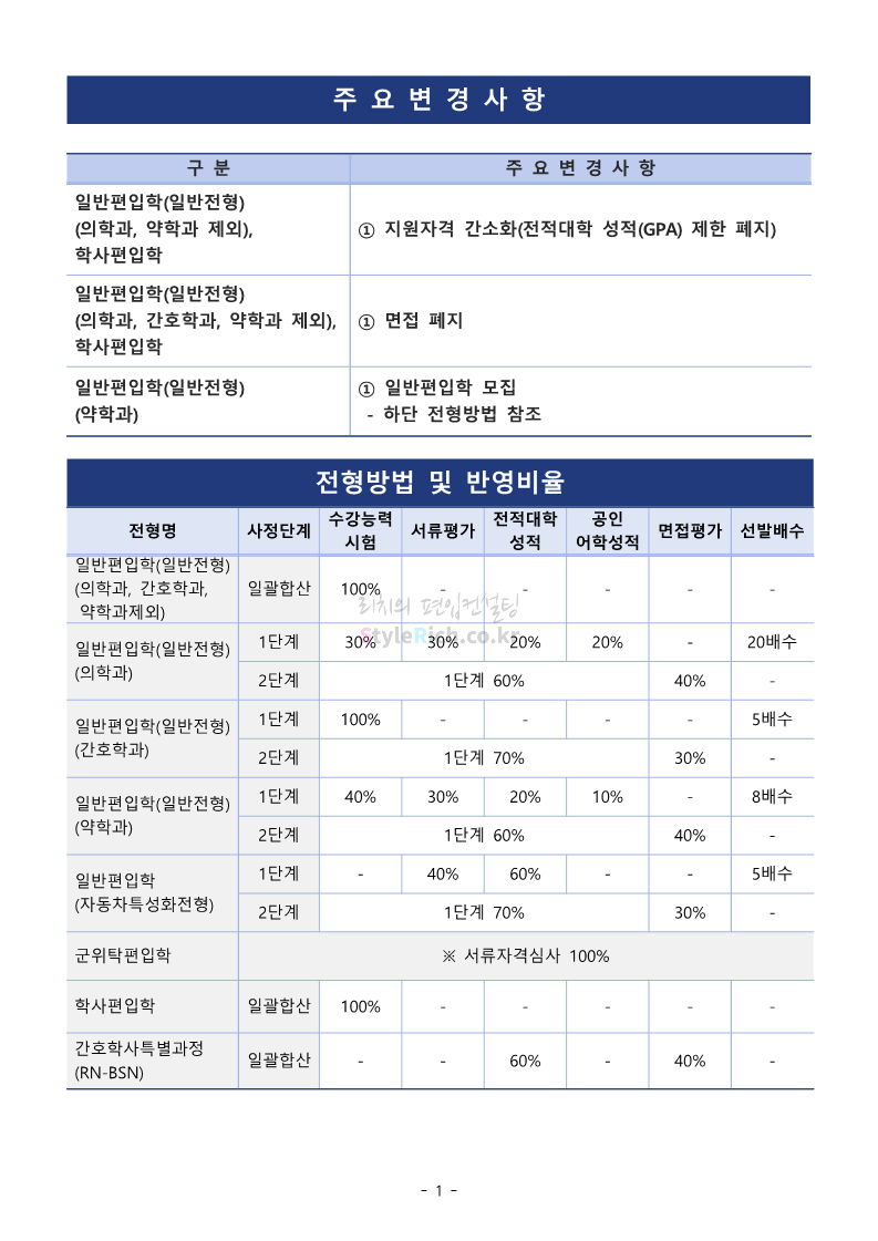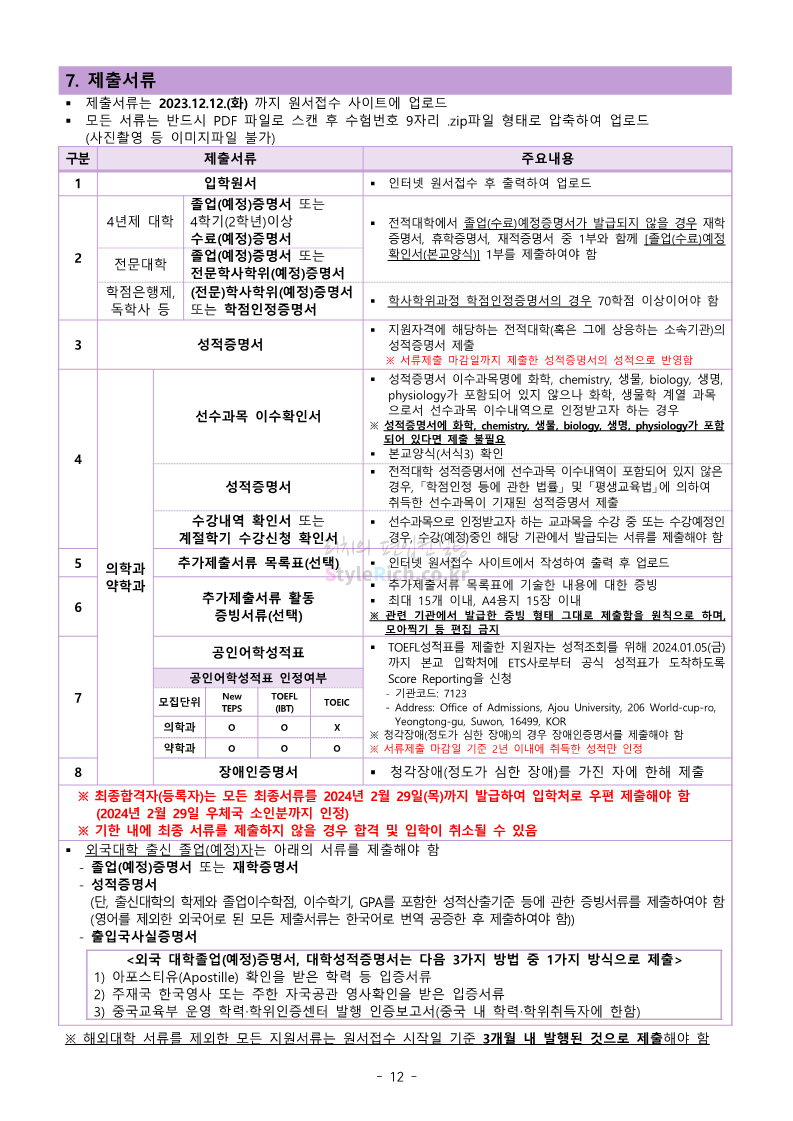 아주대 편입 2024학년도 모집요강 간편하게 보자! 2023.11.29 02:29 편입 모집요강/2024학년도 모집요강 2024학년도 아주대 편입 모집요강(2023.11.28 기준)을 간편하게 확인하세요. * 최종 모집요강 발표 이후에도 내용의 일부가 변경될 수 있으니 지원 전 반드시 아주대 입학처에서 확인하세요. ☞아주대 편입 최신 모집요강 확인하기☜ <출처: 아주대> 공유하기 게시글 관리 리치의 편입컨설팅 저작자표시 비영리 변경금지 (새창열림) '편입 모집요강 > 2024학년도 모집요강' 카테고리의 다른 글 경희대 편입 2024학년도 모집요강 간편하게 보자! (0) 2023.11.30 연세대 편입 2024학년도 모집요강 간편하게 보자! (0) 2023.11.29 고려대 편입 2024학년도 모집요강 간편하게 보자! (0) 2023.11.29 한국공학대 편입 2024학년도 모집요강 간편하게 보자! (0) 2023.11.27 수원대 편입 2024학년도 모집요강 간편하게 보자! (0) 2023.11.27 댓글 공유하기 다른 글 댓글 이 글 공유하기 구독하기 구독하기 카카오톡 카카오톡 라인 라인 트위터 트위터 Facebook Facebook 카카오스토리 카카오스토리 밴드 밴드 네이버 블로그 네이버 블로그 Pocket Pocket Evernote Evernote 다른 글 경희대 편입 2024학년도 모집요강 간편하게 보자! 경희대 편입 2024학년도 모집요강 간편하게 보자! 2023.11.30 연세대 편입 2024학년도 모집요강 간편하게 보자! 연세대 편입 2024학년도 모집요강 간편하게 보자! 2023.11.29 고려대 편입 2024학년도 모집요강 간편하게 보자! 고려대 편입 2024학년도 모집요강 간편하게 보자! 2023.11.29 한국공학대 편입 2024학년도 모집요강 간편하게 보자! 한국공학대 편입 2024학년도 모집요강 간편하게 보자! 2023.11.27 다른 글 더 둘러보기