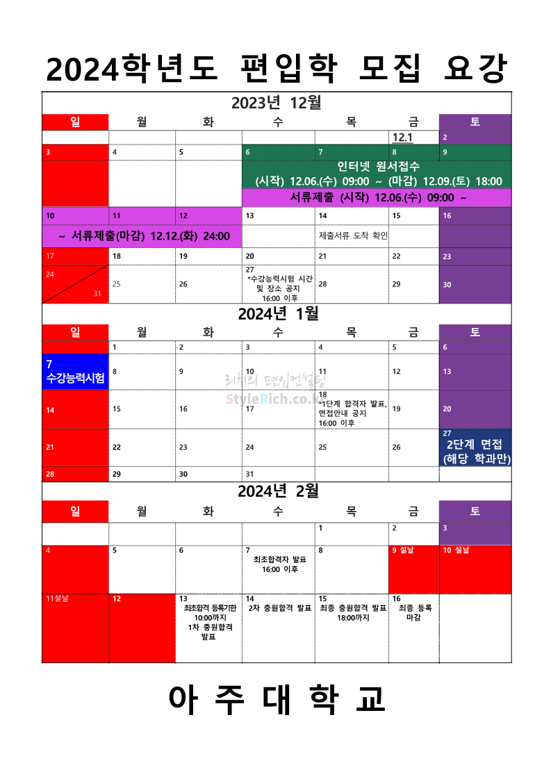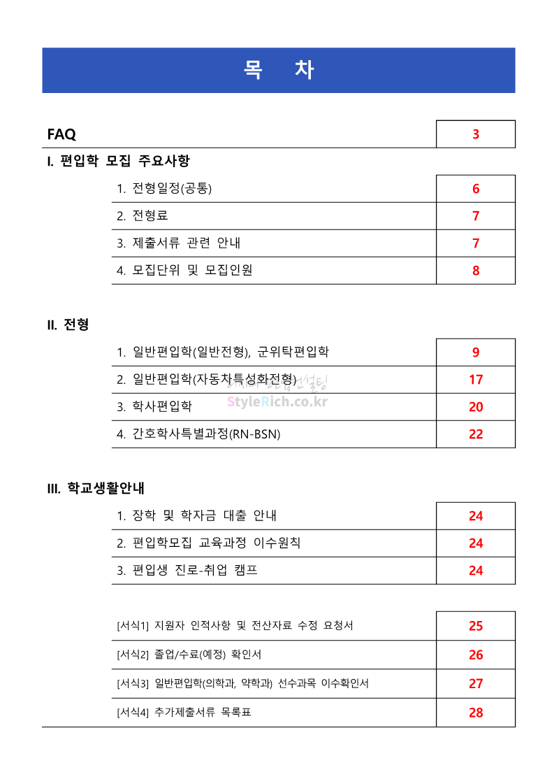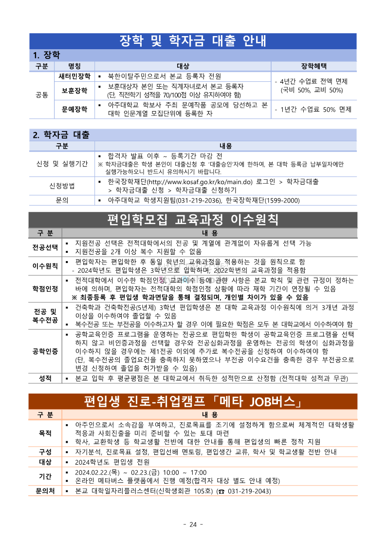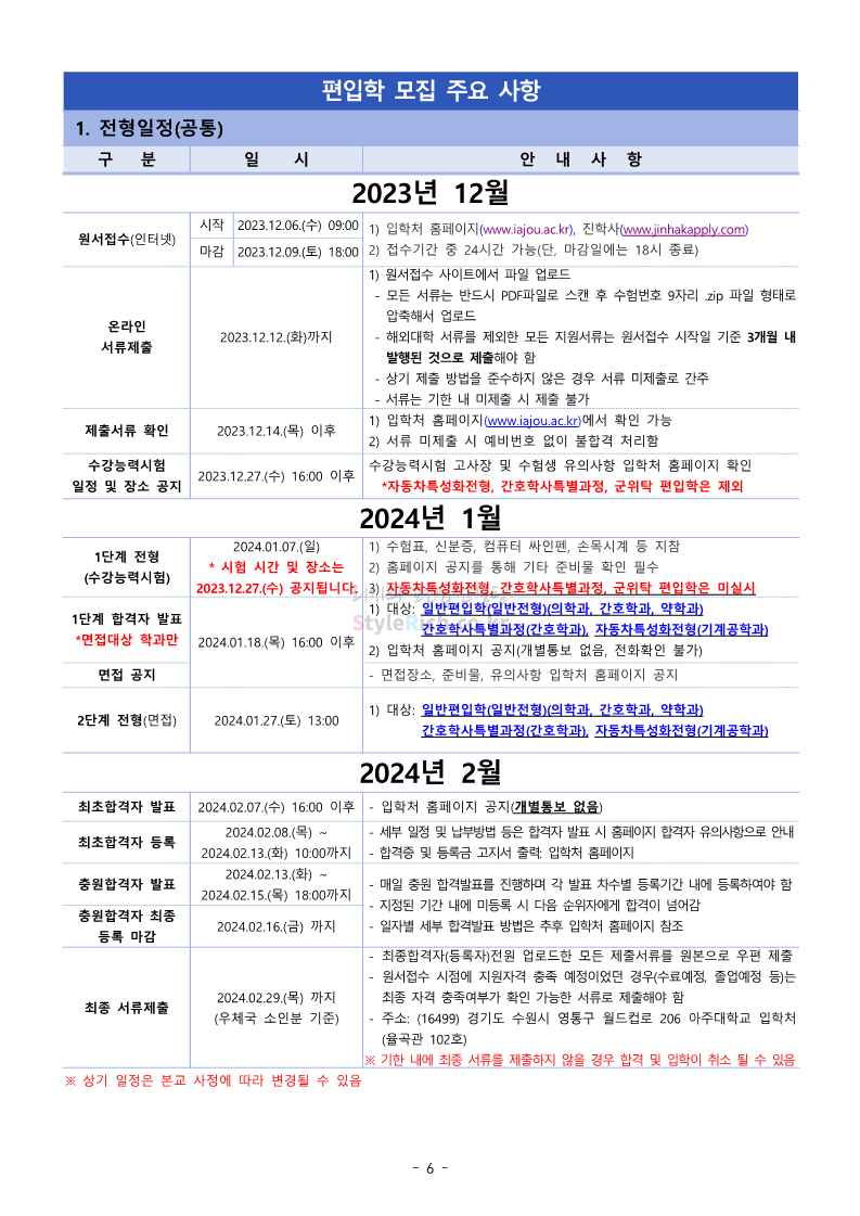 아주대 편입 2024학년도 모집요강 간편하게 보자! 2023.11.29 02:29 편입 모집요강/2024학년도 모집요강 2024학년도 아주대 편입 모집요강(2023.11.28 기준)을 간편하게 확인하세요. * 최종 모집요강 발표 이후에도 내용의 일부가 변경될 수 있으니 지원 전 반드시 아주대 입학처에서 확인하세요. ☞아주대 편입 최신 모집요강 확인하기☜ <출처: 아주대> 공유하기 게시글 관리 리치의 편입컨설팅 저작자표시 비영리 변경금지 (새창열림) '편입 모집요강 > 2024학년도 모집요강' 카테고리의 다른 글 경희대 편입 2024학년도 모집요강 간편하게 보자! (0) 2023.11.30 연세대 편입 2024학년도 모집요강 간편하게 보자! (0) 2023.11.29 고려대 편입 2024학년도 모집요강 간편하게 보자! (0) 2023.11.29 한국공학대 편입 2024학년도 모집요강 간편하게 보자! (0) 2023.11.27 수원대 편입 2024학년도 모집요강 간편하게 보자! (0) 2023.11.27 댓글 공유하기 다른 글 댓글 이 글 공유하기 구독하기 구독하기 카카오톡 카카오톡 라인 라인 트위터 트위터 Facebook Facebook 카카오스토리 카카오스토리 밴드 밴드 네이버 블로그 네이버 블로그 Pocket Pocket Evernote Evernote 다른 글 경희대 편입 2024학년도 모집요강 간편하게 보자! 경희대 편입 2024학년도 모집요강 간편하게 보자! 2023.11.30 연세대 편입 2024학년도 모집요강 간편하게 보자! 연세대 편입 2024학년도 모집요강 간편하게 보자! 2023.11.29 고려대 편입 2024학년도 모집요강 간편하게 보자! 고려대 편입 2024학년도 모집요강 간편하게 보자! 2023.11.29 한국공학대 편입 2024학년도 모집요강 간편하게 보자! 한국공학대 편입 2024학년도 모집요강 간편하게 보자! 2023.11.27 다른 글 더 둘러보기