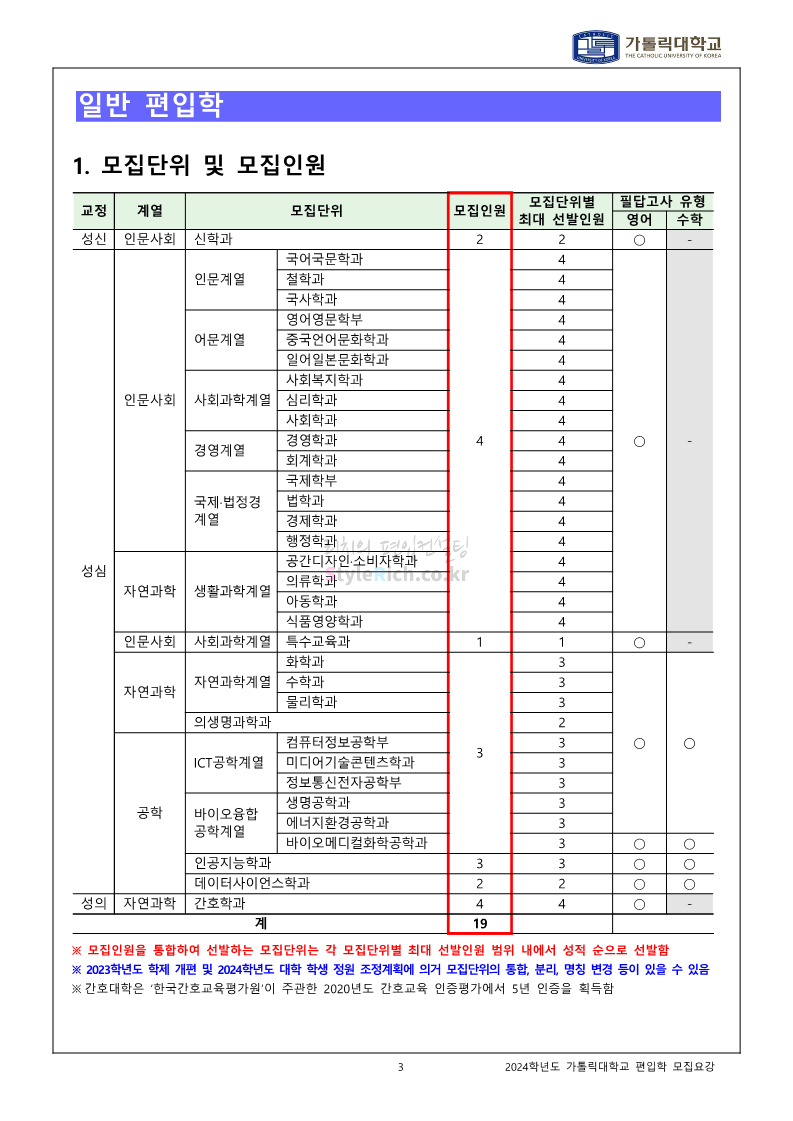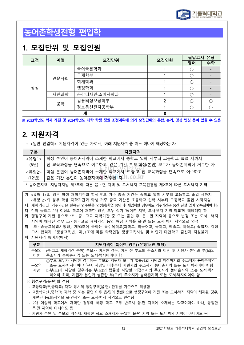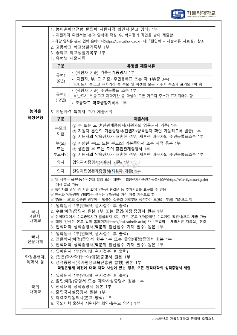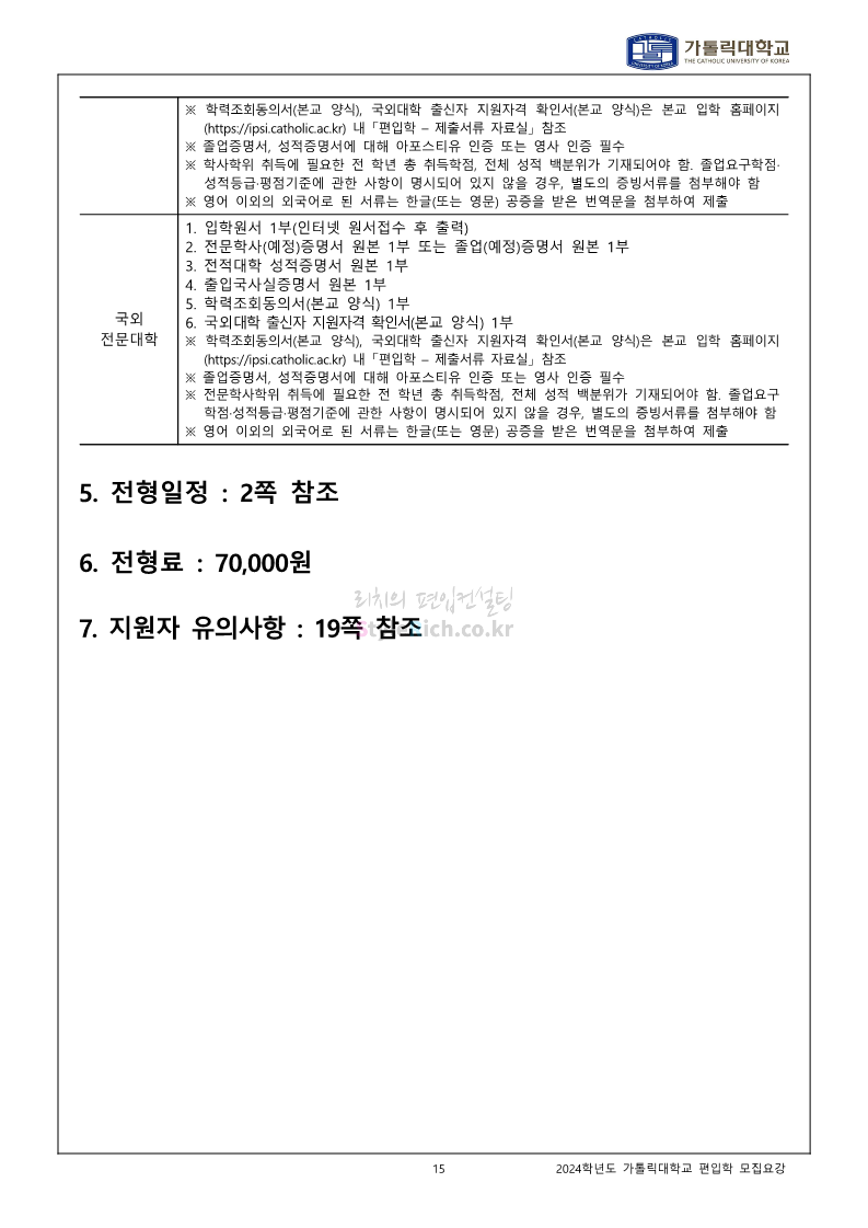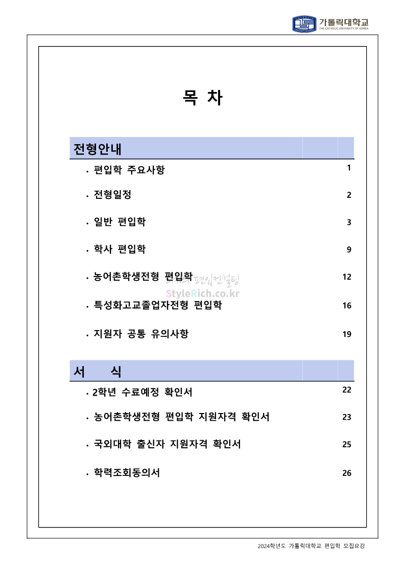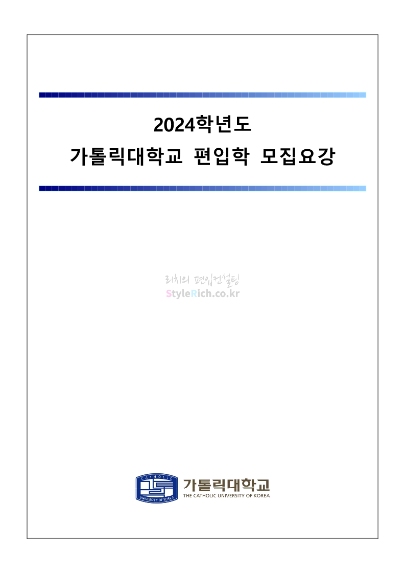 가톨릭대 편입 2024학년도 모집요강 간편하게 보자! 2023.12.02 00:30 편입 모집요강/2024학년도 모집요강 2024학년도 가톨릭대 편입 모집요강(2023.12.01 기준)을 간편하게 확인하세요. * 최종 모집요강 발표 이후에도 내용의 일부가 변경될 수 있으니 지원 전 반드시 가톨릭대 입학처에서 확인하세요. ☞가톨릭대 편입 최신 모집요강 확인하기☜ <출처: 가톨릭대> 공유하기 게시글 관리 리치의 편입컨설팅 저작자표시 비영리 변경금지 (새창열림) '편입 모집요강 > 2024학년도 모집요강' 카테고리의 다른 글 동국대 편입 2024학년도 모집요강 간편하게 보자! (0) 2023.12.02 광운대 편입 2024학년도 모집요강 간편하게 보자! (0) 2023.12.02 숭실대 편입 2024학년도 모집요강 간편하게 보자! (0) 2023.11.30 경희대 편입 2024학년도 모집요강 간편하게 보자! (0) 2023.11.30 연세대 편입 2024학년도 모집요강 간편하게 보자! (0) 2023.11.29 댓글 공유하기 다른 글 댓글 이 글 공유하기 구독하기 구독하기 카카오톡 카카오톡 라인 라인 트위터 트위터 Facebook Facebook 카카오스토리 카카오스토리 밴드 밴드 네이버 블로그 네이버 블로그 Pocket Pocket Evernote Evernote 다른 글 동국대 편입 2024학년도 모집요강 간편하게 보자! 동국대 편입 2024학년도 모집요강 간편하게 보자! 2023.12.02 광운대 편입 2024학년도 모집요강 간편하게 보자! 광운대 편입 2024학년도 모집요강 간편하게 보자! 2023.12.02 숭실대 편입 2024학년도 모집요강 간편하게 보자! 숭실대 편입 2024학년도 모집요강 간편하게 보자! 2023.11.30 경희대 편입 2024학년도 모집요강 간편하게 보자! 경희대 편입 2024학년도 모집요강 간편하게 보자! 2023.11.30 다른 글 더 둘러보기