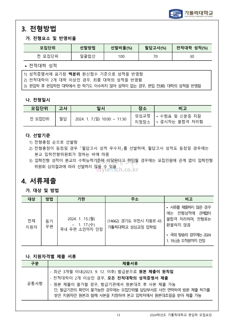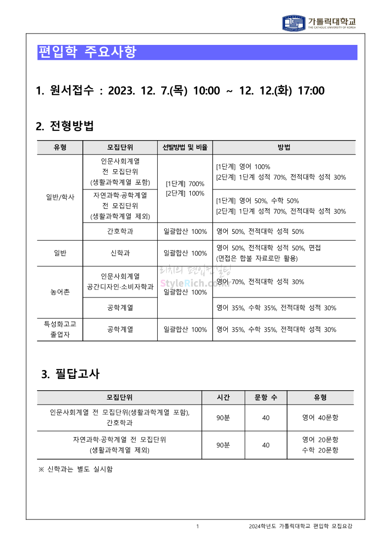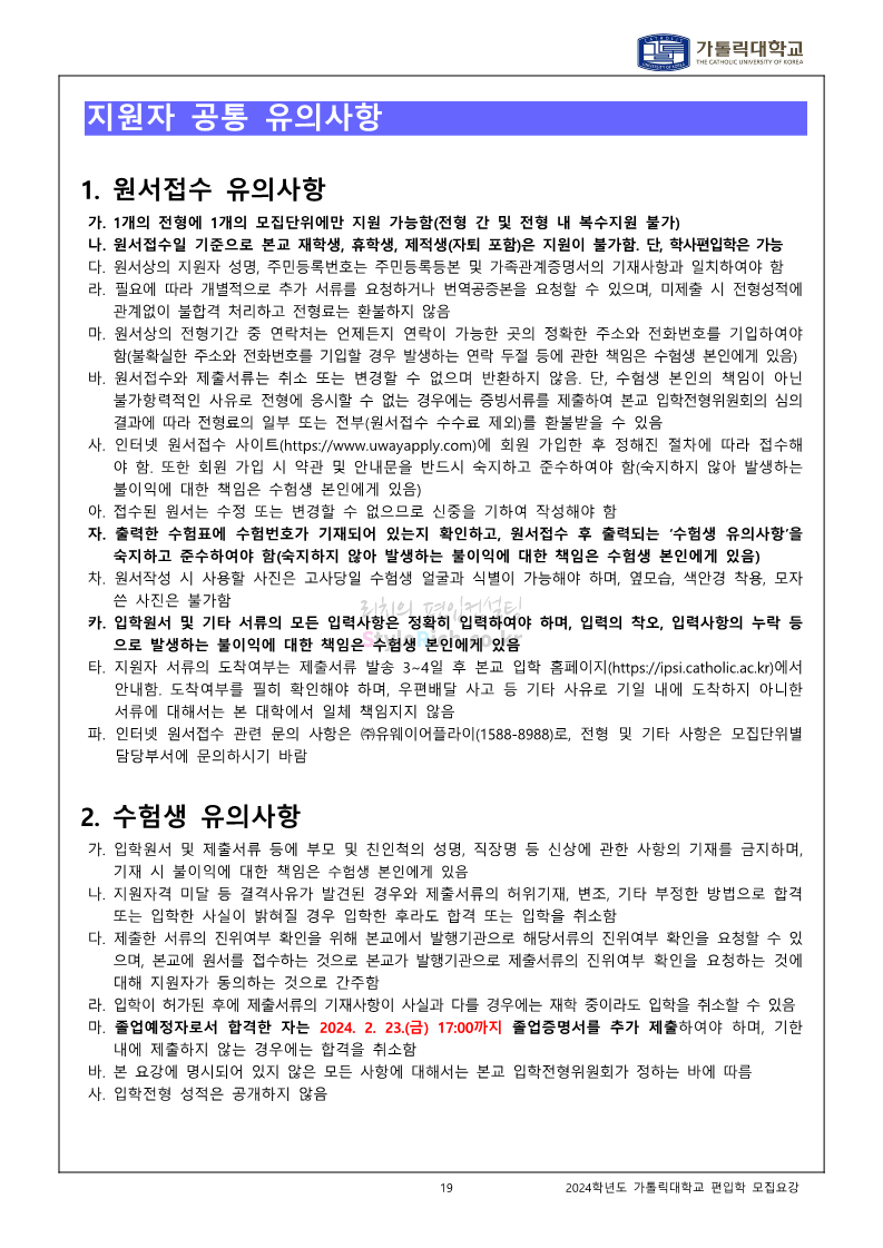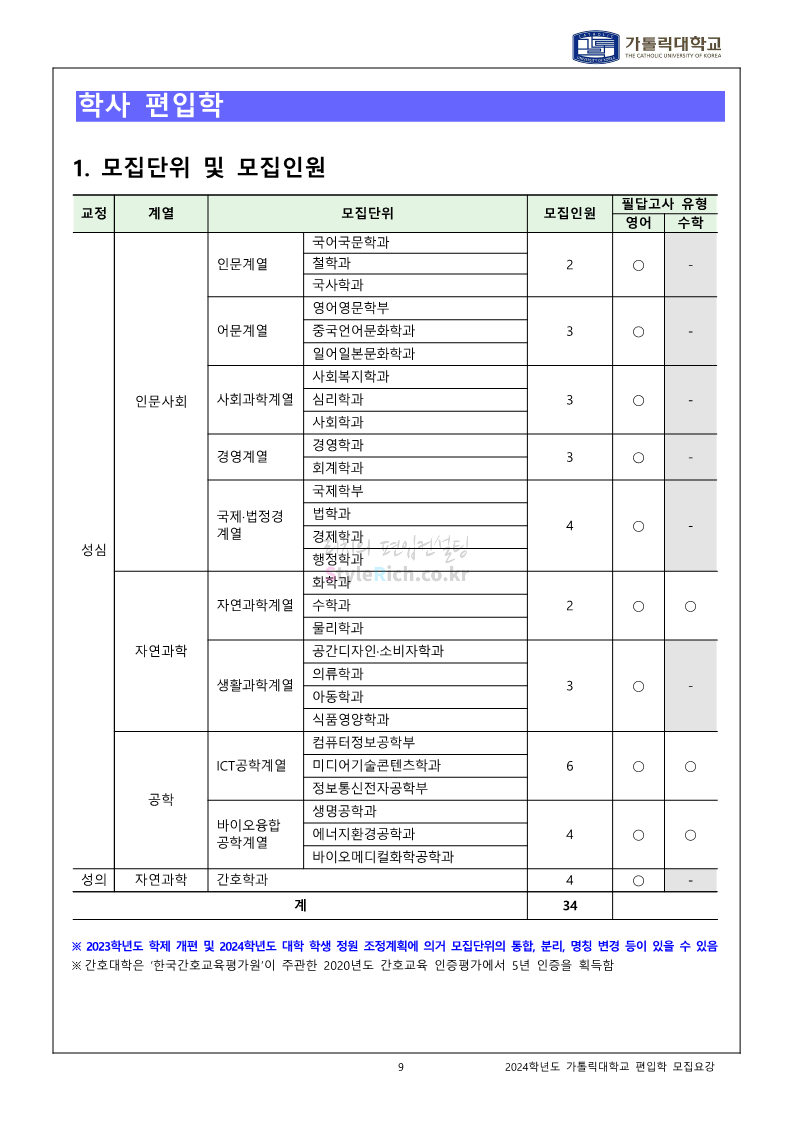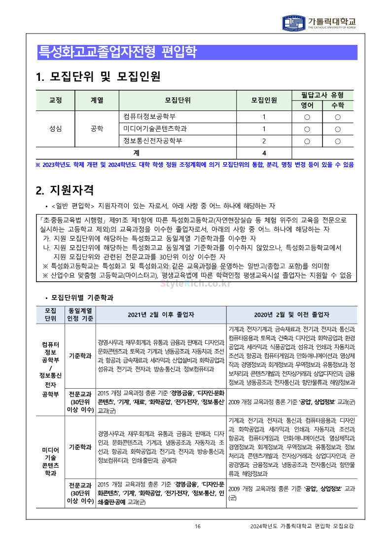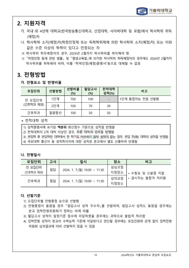 가톨릭대 편입 2024학년도 모집요강 간편하게 보자! 2023.12.02 00:30 편입 모집요강/2024학년도 모집요강 2024학년도 가톨릭대 편입 모집요강(2023.12.01 기준)을 간편하게 확인하세요. * 최종 모집요강 발표 이후에도 내용의 일부가 변경될 수 있으니 지원 전 반드시 가톨릭대 입학처에서 확인하세요. ☞가톨릭대 편입 최신 모집요강 확인하기☜ <출처: 가톨릭대> 공유하기 게시글 관리 리치의 편입컨설팅 저작자표시 비영리 변경금지 (새창열림) '편입 모집요강 > 2024학년도 모집요강' 카테고리의 다른 글 동국대 편입 2024학년도 모집요강 간편하게 보자! (0) 2023.12.02 광운대 편입 2024학년도 모집요강 간편하게 보자! (0) 2023.12.02 숭실대 편입 2024학년도 모집요강 간편하게 보자! (0) 2023.11.30 경희대 편입 2024학년도 모집요강 간편하게 보자! (0) 2023.11.30 연세대 편입 2024학년도 모집요강 간편하게 보자! (0) 2023.11.29 댓글 공유하기 다른 글 댓글 이 글 공유하기 구독하기 구독하기 카카오톡 카카오톡 라인 라인 트위터 트위터 Facebook Facebook 카카오스토리 카카오스토리 밴드 밴드 네이버 블로그 네이버 블로그 Pocket Pocket Evernote Evernote 다른 글 동국대 편입 2024학년도 모집요강 간편하게 보자! 동국대 편입 2024학년도 모집요강 간편하게 보자! 2023.12.02 광운대 편입 2024학년도 모집요강 간편하게 보자! 광운대 편입 2024학년도 모집요강 간편하게 보자! 2023.12.02 숭실대 편입 2024학년도 모집요강 간편하게 보자! 숭실대 편입 2024학년도 모집요강 간편하게 보자! 2023.11.30 경희대 편입 2024학년도 모집요강 간편하게 보자! 경희대 편입 2024학년도 모집요강 간편하게 보자! 2023.11.30 다른 글 더 둘러보기
