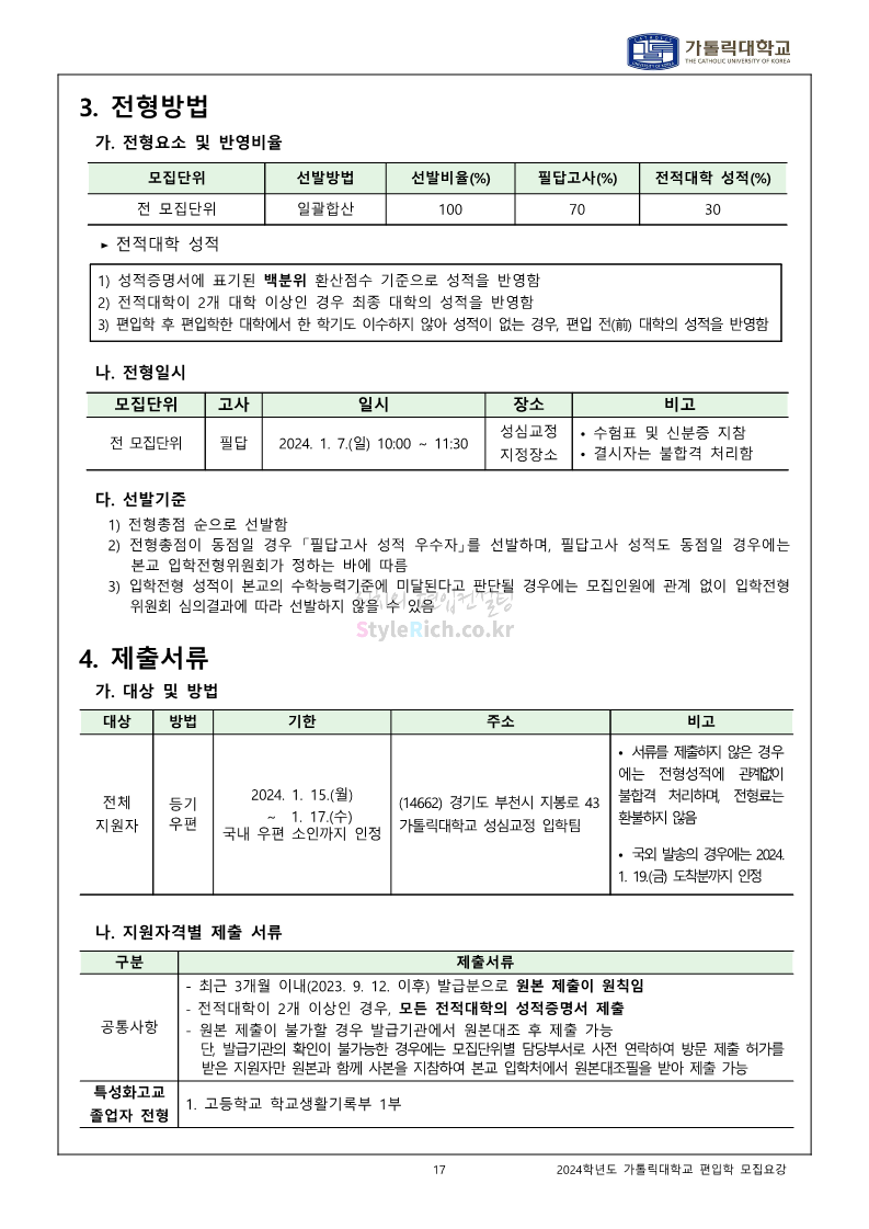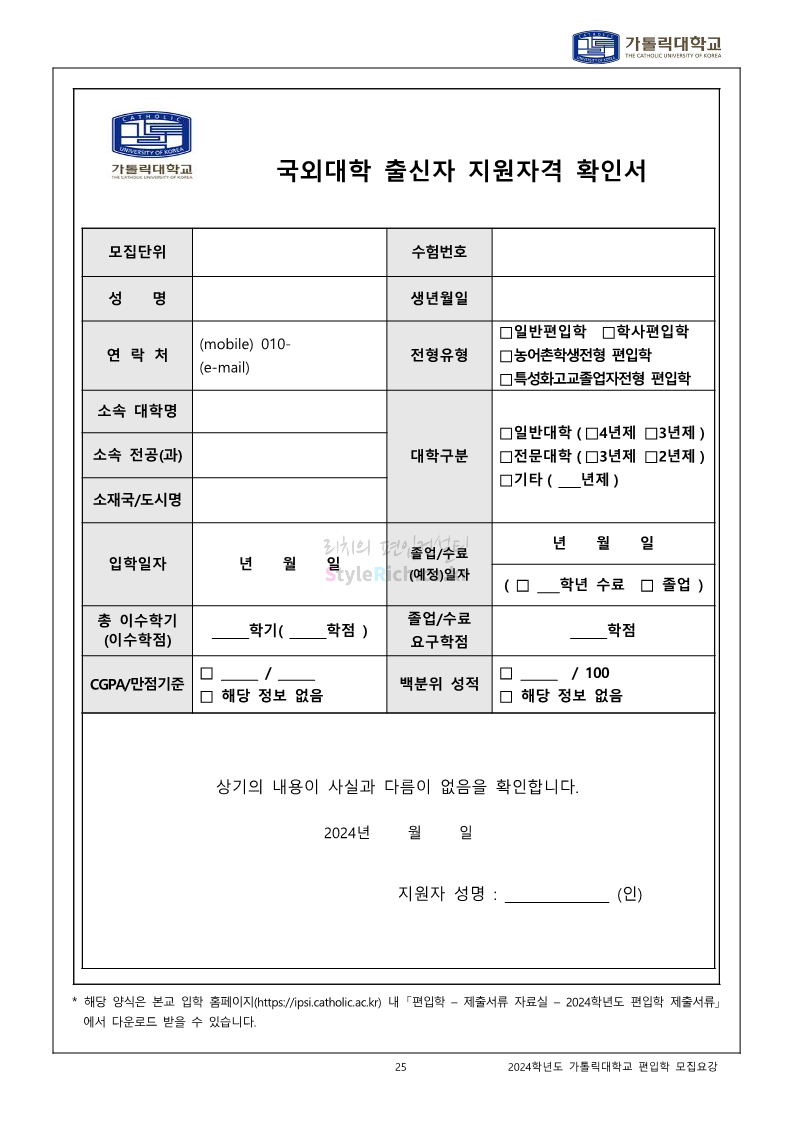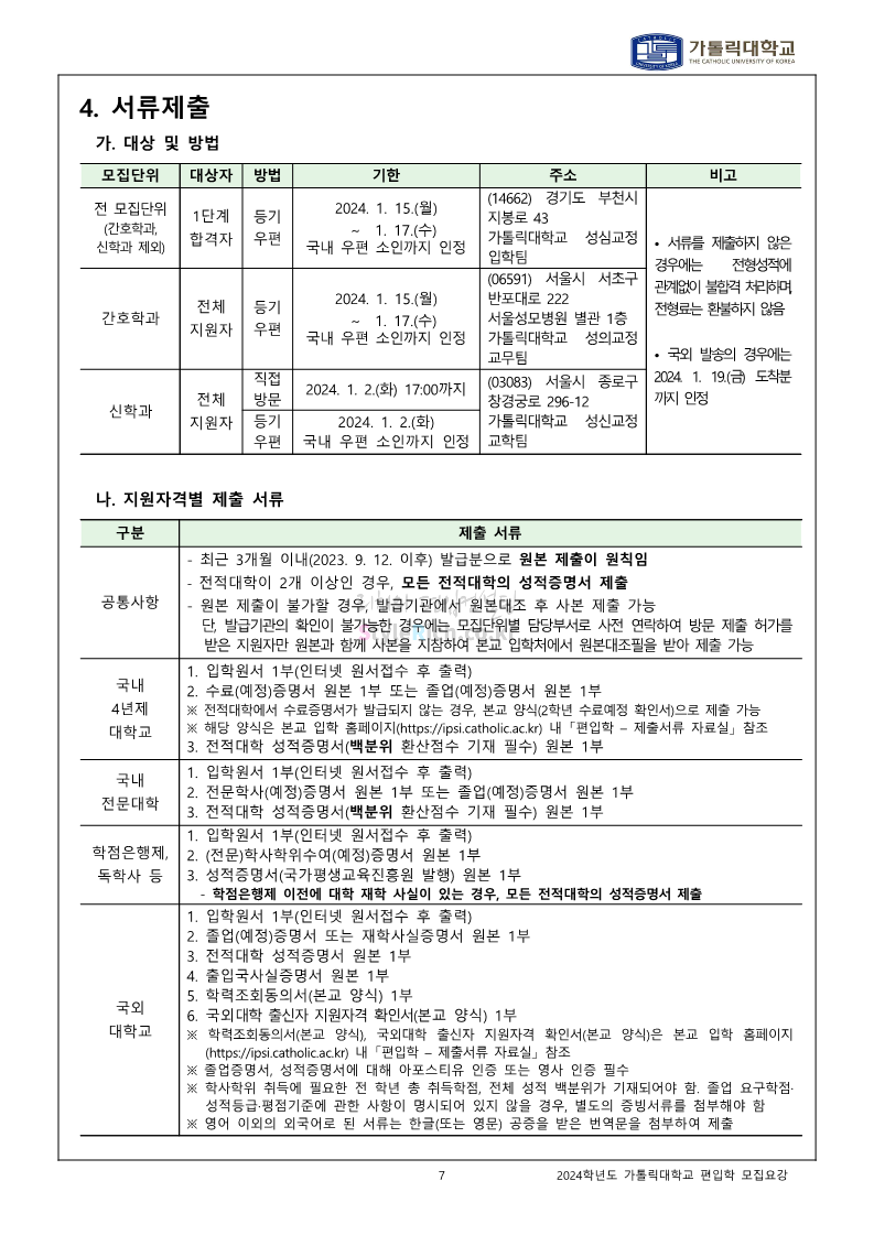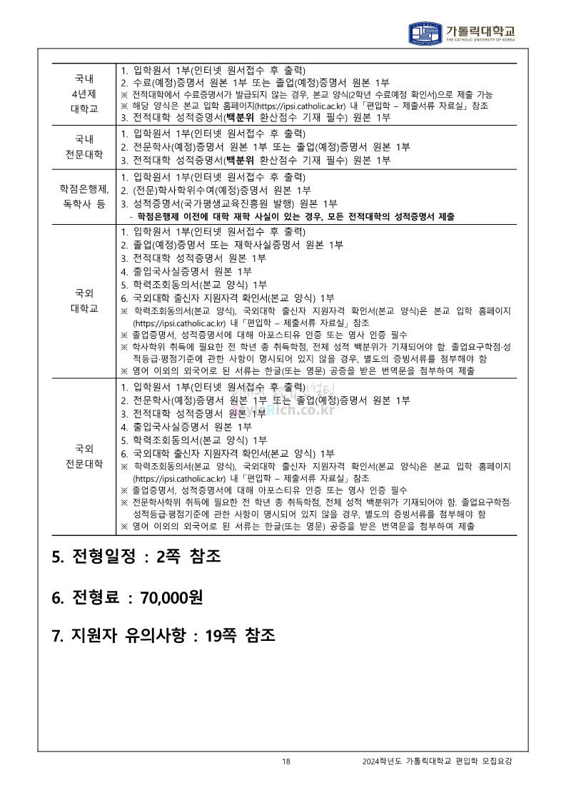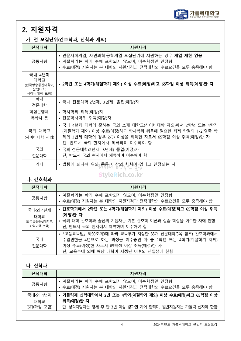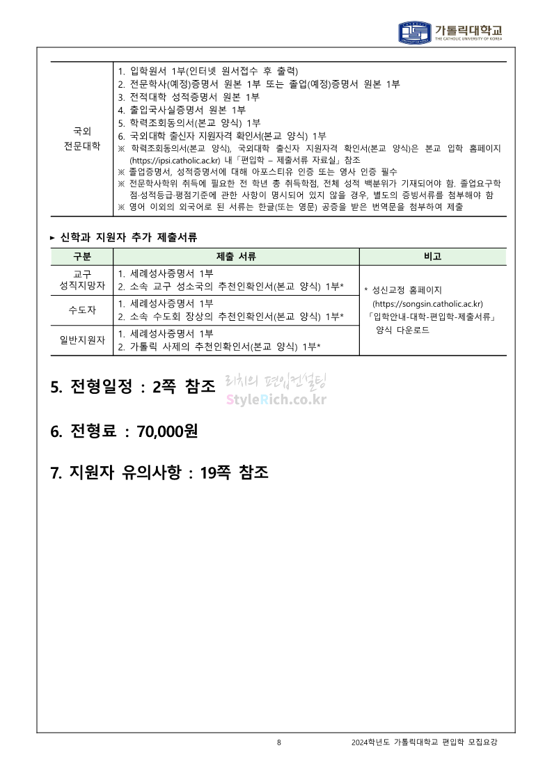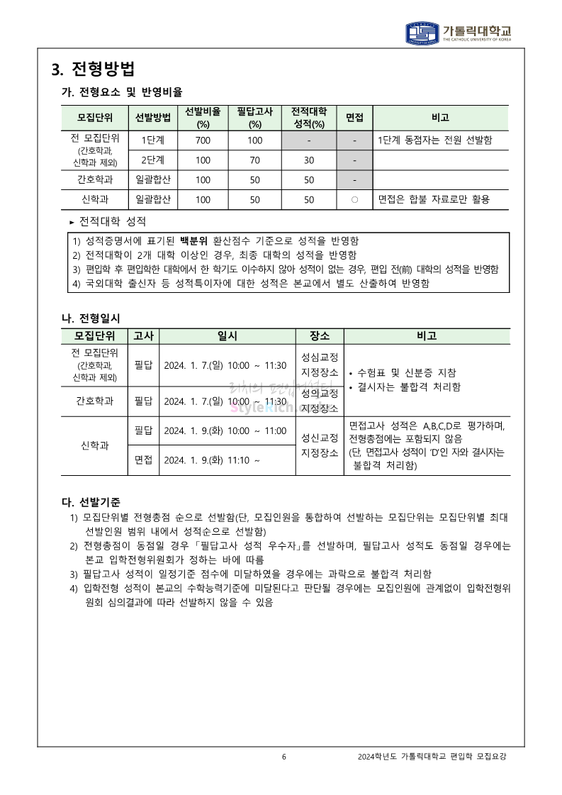 가톨릭대 편입 2024학년도 모집요강 간편하게 보자! 2023.12.02 00:30 편입 모집요강/2024학년도 모집요강 2024학년도 가톨릭대 편입 모집요강(2023.12.01 기준)을 간편하게 확인하세요. * 최종 모집요강 발표 이후에도 내용의 일부가 변경될 수 있으니 지원 전 반드시 가톨릭대 입학처에서 확인하세요. ☞가톨릭대 편입 최신 모집요강 확인하기☜ <출처: 가톨릭대> 공유하기 게시글 관리 리치의 편입컨설팅 저작자표시 비영리 변경금지 (새창열림) '편입 모집요강 > 2024학년도 모집요강' 카테고리의 다른 글 동국대 편입 2024학년도 모집요강 간편하게 보자! (0) 2023.12.02 광운대 편입 2024학년도 모집요강 간편하게 보자! (0) 2023.12.02 숭실대 편입 2024학년도 모집요강 간편하게 보자! (0) 2023.11.30 경희대 편입 2024학년도 모집요강 간편하게 보자! (0) 2023.11.30 연세대 편입 2024학년도 모집요강 간편하게 보자! (0) 2023.11.29 댓글 공유하기 다른 글 댓글 이 글 공유하기 구독하기 구독하기 카카오톡 카카오톡 라인 라인 트위터 트위터 Facebook Facebook 카카오스토리 카카오스토리 밴드 밴드 네이버 블로그 네이버 블로그 Pocket Pocket Evernote Evernote 다른 글 동국대 편입 2024학년도 모집요강 간편하게 보자! 동국대 편입 2024학년도 모집요강 간편하게 보자! 2023.12.02 광운대 편입 2024학년도 모집요강 간편하게 보자! 광운대 편입 2024학년도 모집요강 간편하게 보자! 2023.12.02 숭실대 편입 2024학년도 모집요강 간편하게 보자! 숭실대 편입 2024학년도 모집요강 간편하게 보자! 2023.11.30 경희대 편입 2024학년도 모집요강 간편하게 보자! 경희대 편입 2024학년도 모집요강 간편하게 보자! 2023.11.30 다른 글 더 둘러보기