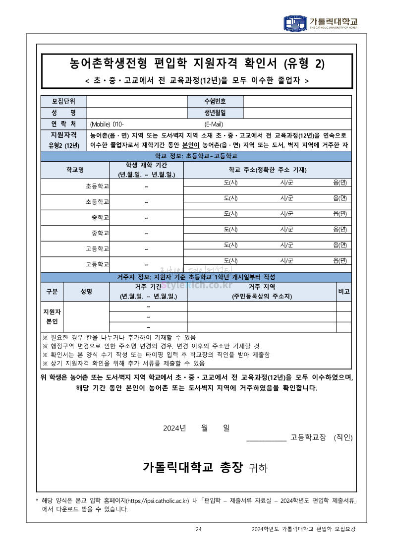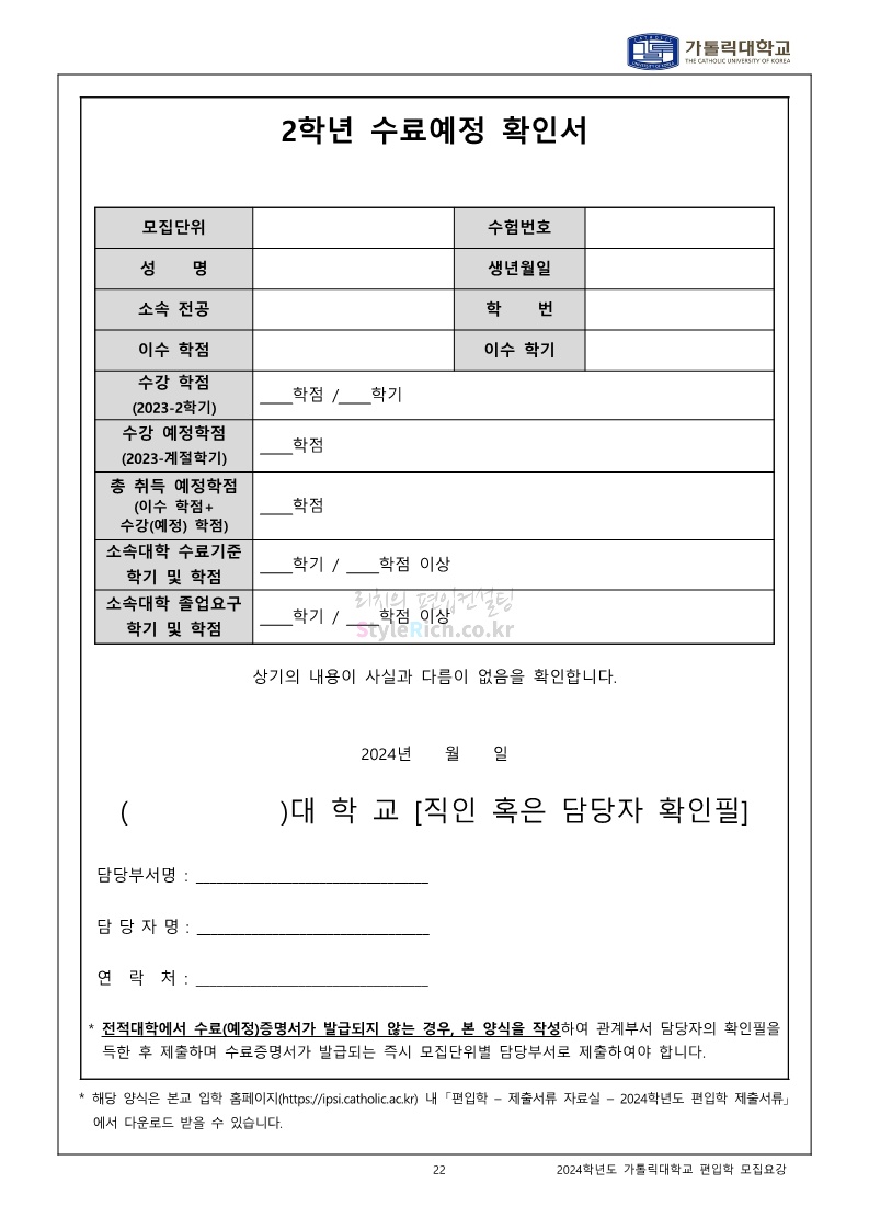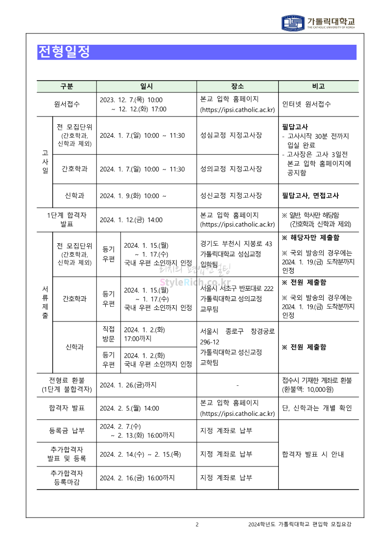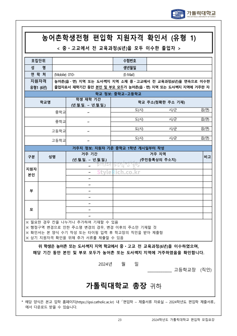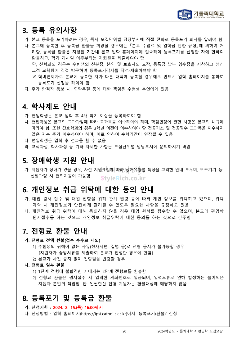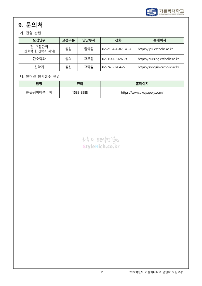 가톨릭대 편입 2024학년도 모집요강 간편하게 보자! 2023.12.02 00:30 편입 모집요강/2024학년도 모집요강 2024학년도 가톨릭대 편입 모집요강(2023.12.01 기준)을 간편하게 확인하세요. * 최종 모집요강 발표 이후에도 내용의 일부가 변경될 수 있으니 지원 전 반드시 가톨릭대 입학처에서 확인하세요. ☞가톨릭대 편입 최신 모집요강 확인하기☜ <출처: 가톨릭대> 공유하기 게시글 관리 리치의 편입컨설팅 저작자표시 비영리 변경금지 (새창열림) '편입 모집요강 > 2024학년도 모집요강' 카테고리의 다른 글 동국대 편입 2024학년도 모집요강 간편하게 보자! (0) 2023.12.02 광운대 편입 2024학년도 모집요강 간편하게 보자! (0) 2023.12.02 숭실대 편입 2024학년도 모집요강 간편하게 보자! (0) 2023.11.30 경희대 편입 2024학년도 모집요강 간편하게 보자! (0) 2023.11.30 연세대 편입 2024학년도 모집요강 간편하게 보자! (0) 2023.11.29 댓글 공유하기 다른 글 댓글 이 글 공유하기 구독하기 구독하기 카카오톡 카카오톡 라인 라인 트위터 트위터 Facebook Facebook 카카오스토리 카카오스토리 밴드 밴드 네이버 블로그 네이버 블로그 Pocket Pocket Evernote Evernote 다른 글 동국대 편입 2024학년도 모집요강 간편하게 보자! 동국대 편입 2024학년도 모집요강 간편하게 보자! 2023.12.02 광운대 편입 2024학년도 모집요강 간편하게 보자! 광운대 편입 2024학년도 모집요강 간편하게 보자! 2023.12.02 숭실대 편입 2024학년도 모집요강 간편하게 보자! 숭실대 편입 2024학년도 모집요강 간편하게 보자! 2023.11.30 경희대 편입 2024학년도 모집요강 간편하게 보자! 경희대 편입 2024학년도 모집요강 간편하게 보자! 2023.11.30 다른 글 더 둘러보기