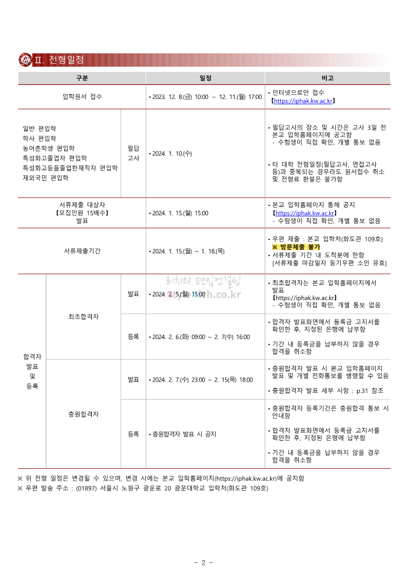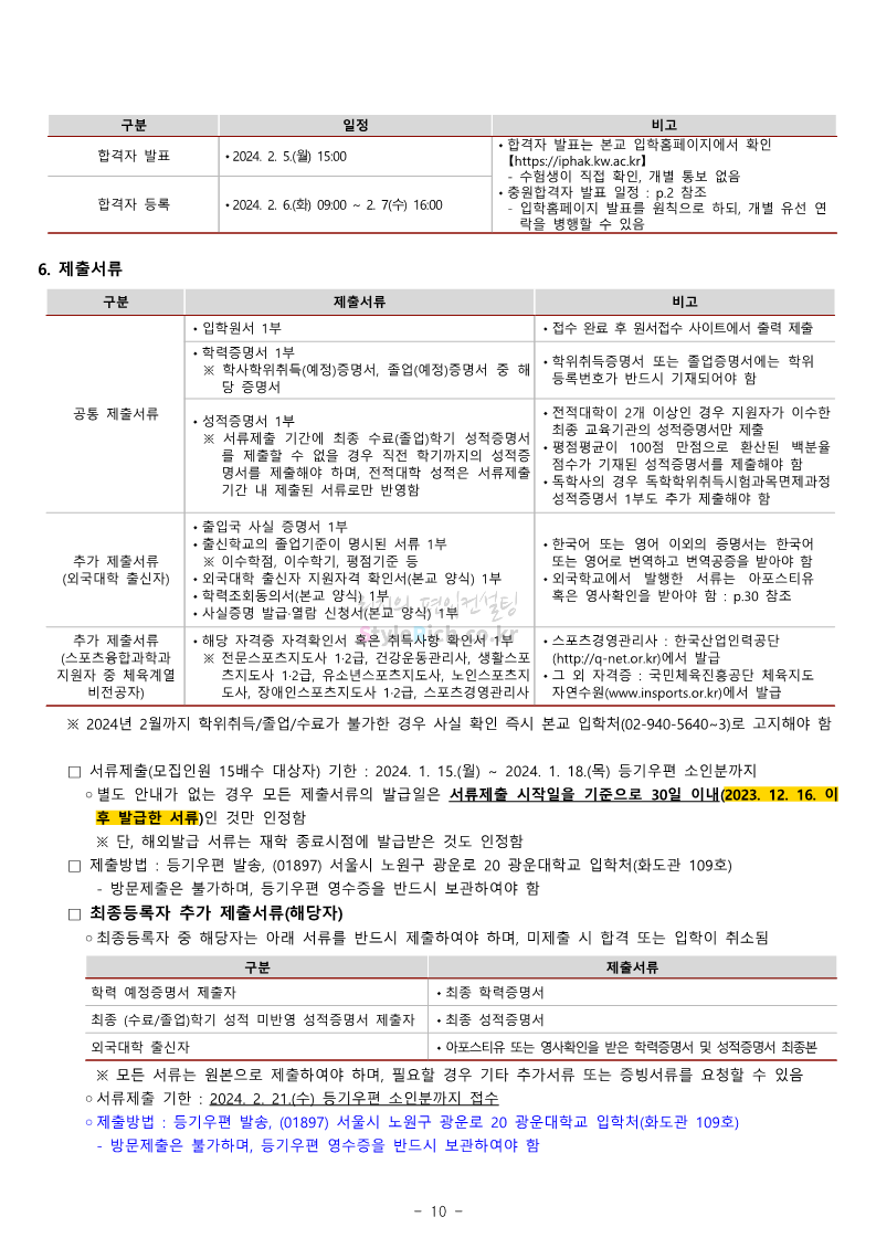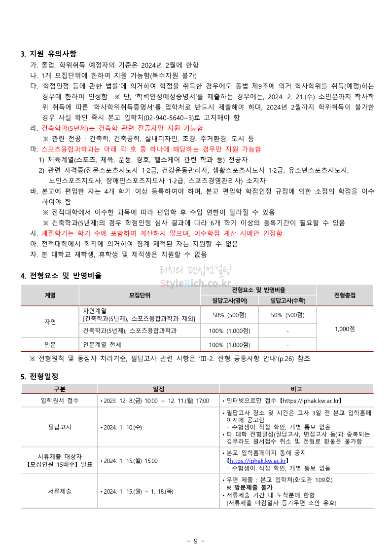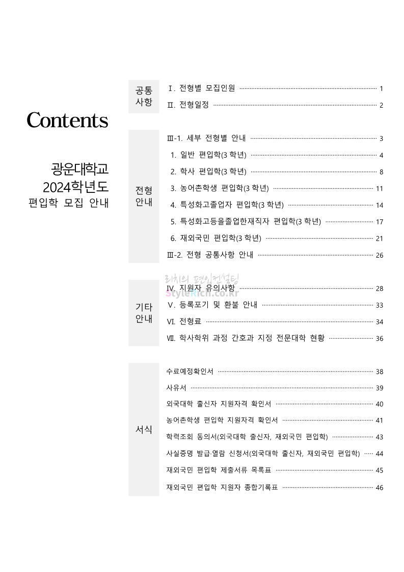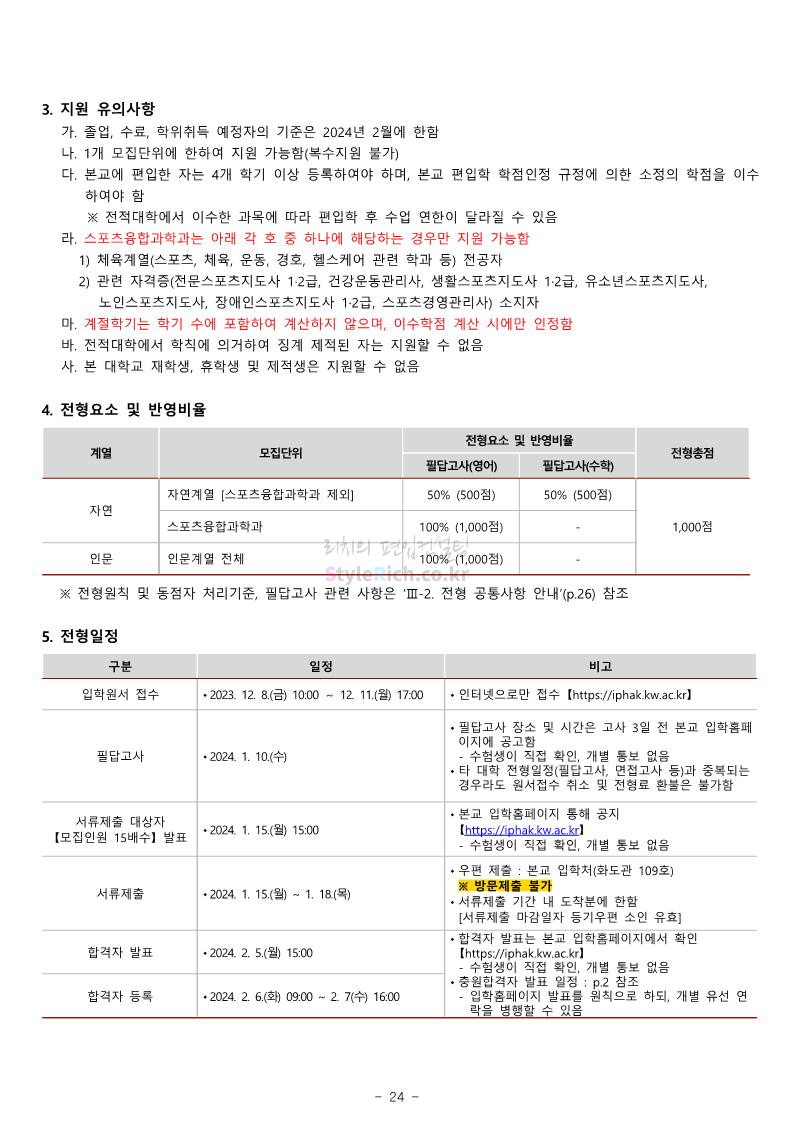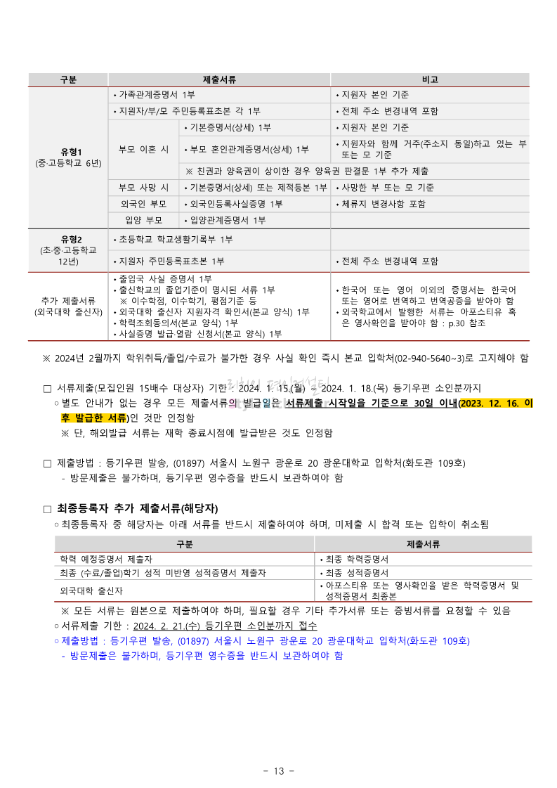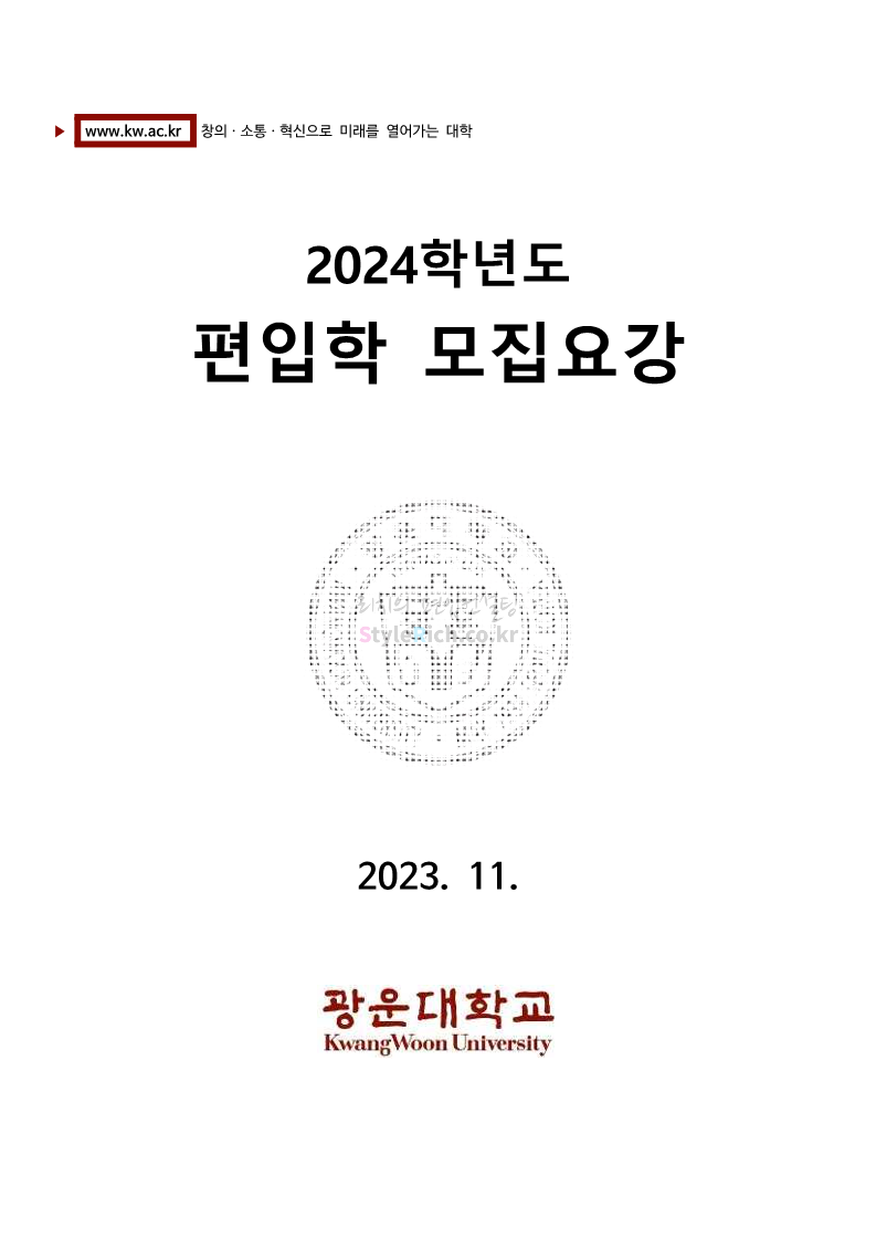 광운대 편입 2024학년도 모집요강 간편하게 보자! 2023.12.02 01:03 편입 모집요강/2024학년도 모집요강 2024학년도 광운대 편입 모집요강(2023.11.30 기준)을 간편하게 확인하세요. * 최종 모집요강 발표 이후에도 내용의 일부가 변경될 수 있으니 지원 전 반드시 광운대 입학처에서 확인하세요. ☞광운대 편입 최신 모집요강 확인하기 ☜ <출처: 광운대> 공유하기 게시글 관리 리치의 편입컨설팅 저작자표시 비영리 변경금지 (새창열림) '편입 모집요강 > 2024학년도 모집요강' 카테고리의 다른 글 상명대 편입 2024학년도 모집요강 간편하게 보자! (0) 2023.12.02 동국대 편입 2024학년도 모집요강 간편하게 보자! (0) 2023.12.02 가톨릭대 편입 2024학년도 모집요강 간편하게 보자! (0) 2023.12.02 숭실대 편입 2024학년도 모집요강 간편하게 보자! (0) 2023.11.30 경희대 편입 2024학년도 모집요강 간편하게 보자! (0) 2023.11.30 댓글 공유하기 다른 글 댓글 이 글 공유하기 구독하기 구독하기 카카오톡 카카오톡 라인 라인 트위터 트위터 Facebook Facebook 카카오스토리 카카오스토리 밴드 밴드 네이버 블로그 네이버 블로그 Pocket Pocket Evernote Evernote 다른 글 상명대 편입 2024학년도 모집요강 간편하게 보자! 상명대 편입 2024학년도 모집요강 간편하게 보자! 2023.12.02 동국대 편입 2024학년도 모집요강 간편하게 보자! 동국대 편입 2024학년도 모집요강 간편하게 보자! 2023.12.02 가톨릭대 편입 2024학년도 모집요강 간편하게 보자! 가톨릭대 편입 2024학년도 모집요강 간편하게 보자! 2023.12.02 숭실대 편입 2024학년도 모집요강 간편하게 보자! 숭실대 편입 2024학년도 모집요강 간편하게 보자! 2023.11.30 다른 글 더 둘러보기
