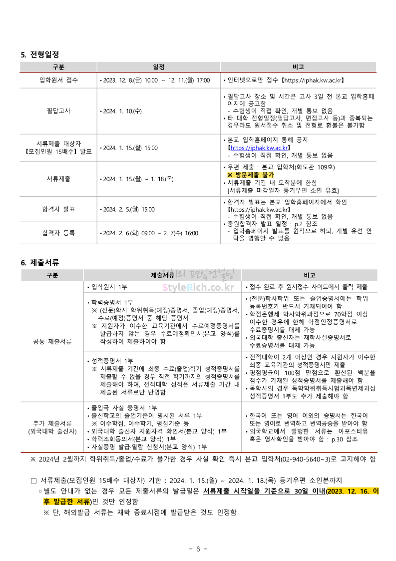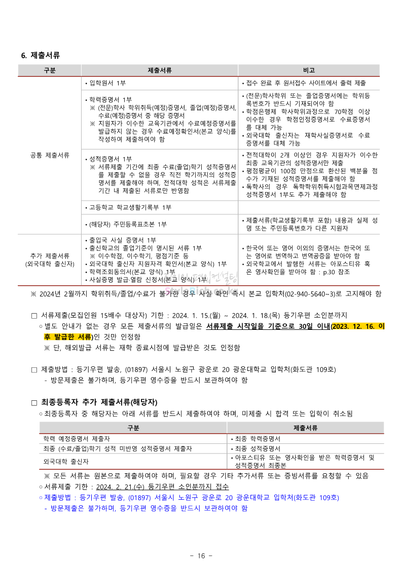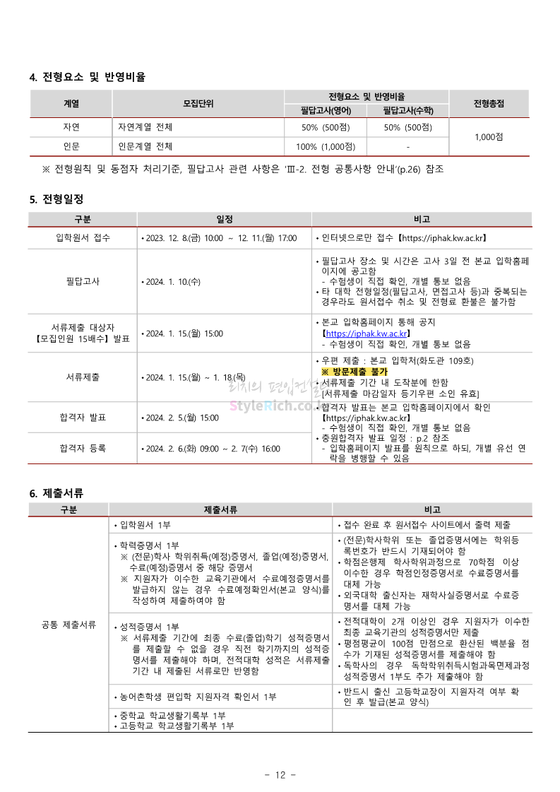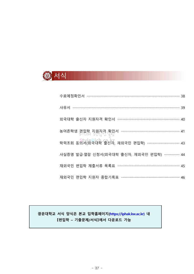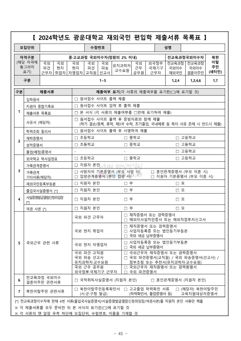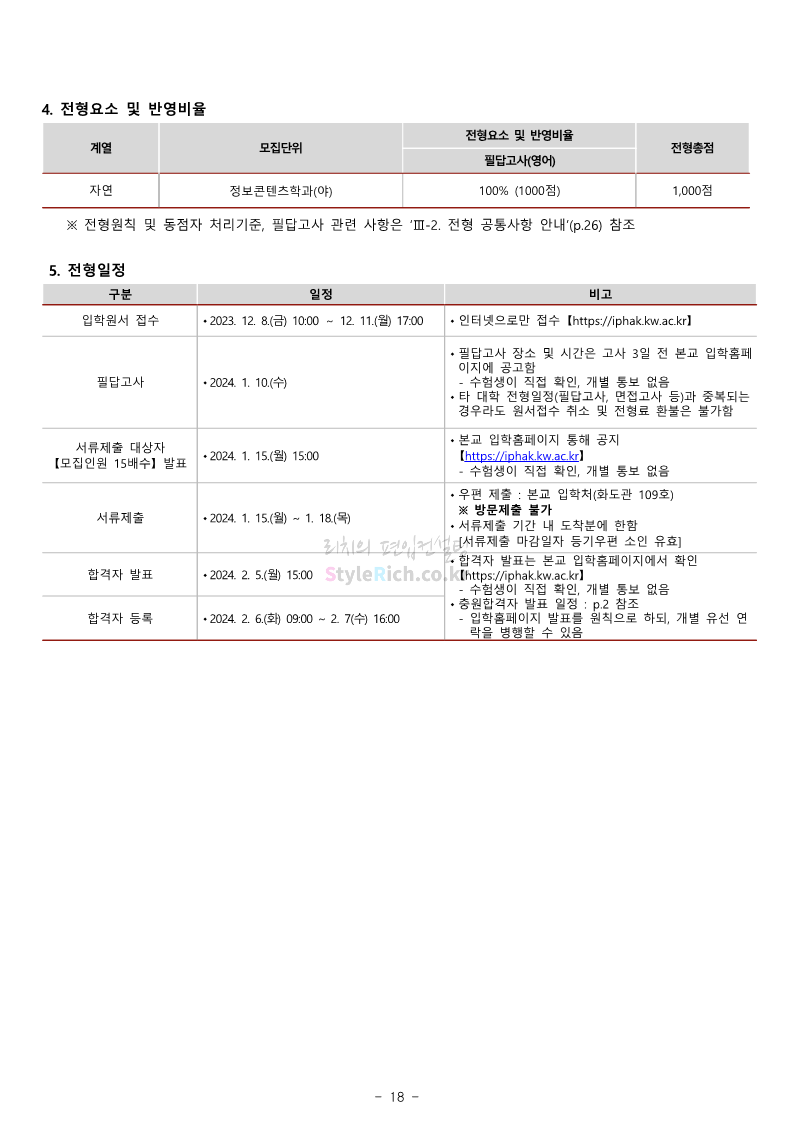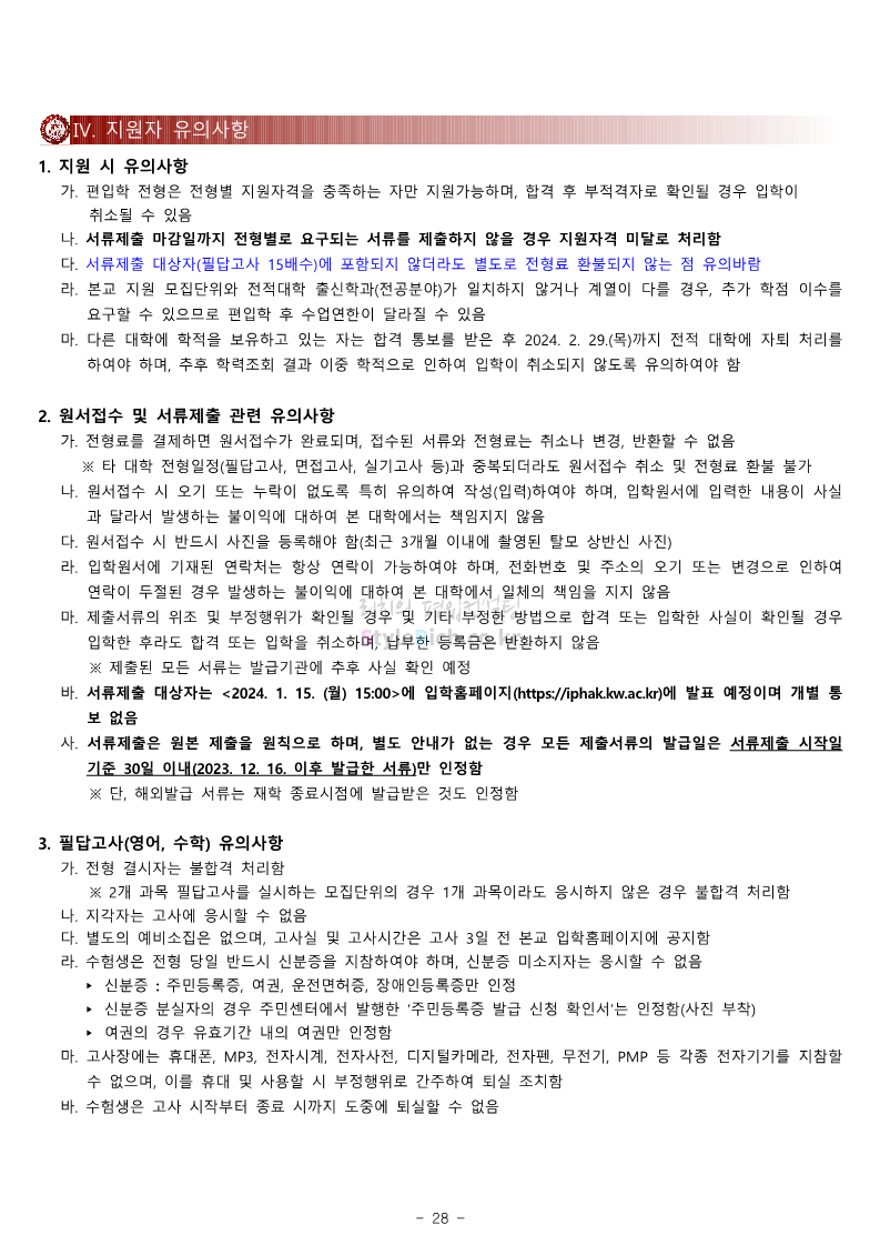 광운대 편입 2024학년도 모집요강 간편하게 보자! 2023.12.02 01:03 편입 모집요강/2024학년도 모집요강 2024학년도 광운대 편입 모집요강(2023.11.30 기준)을 간편하게 확인하세요. * 최종 모집요강 발표 이후에도 내용의 일부가 변경될 수 있으니 지원 전 반드시 광운대 입학처에서 확인하세요. ☞광운대 편입 최신 모집요강 확인하기 ☜ <출처: 광운대> 공유하기 게시글 관리 리치의 편입컨설팅 저작자표시 비영리 변경금지 (새창열림) '편입 모집요강 > 2024학년도 모집요강' 카테고리의 다른 글 상명대 편입 2024학년도 모집요강 간편하게 보자! (0) 2023.12.02 동국대 편입 2024학년도 모집요강 간편하게 보자! (0) 2023.12.02 가톨릭대 편입 2024학년도 모집요강 간편하게 보자! (0) 2023.12.02 숭실대 편입 2024학년도 모집요강 간편하게 보자! (0) 2023.11.30 경희대 편입 2024학년도 모집요강 간편하게 보자! (0) 2023.11.30 댓글 공유하기 다른 글 댓글 이 글 공유하기 구독하기 구독하기 카카오톡 카카오톡 라인 라인 트위터 트위터 Facebook Facebook 카카오스토리 카카오스토리 밴드 밴드 네이버 블로그 네이버 블로그 Pocket Pocket Evernote Evernote 다른 글 상명대 편입 2024학년도 모집요강 간편하게 보자! 상명대 편입 2024학년도 모집요강 간편하게 보자! 2023.12.02 동국대 편입 2024학년도 모집요강 간편하게 보자! 동국대 편입 2024학년도 모집요강 간편하게 보자! 2023.12.02 가톨릭대 편입 2024학년도 모집요강 간편하게 보자! 가톨릭대 편입 2024학년도 모집요강 간편하게 보자! 2023.12.02 숭실대 편입 2024학년도 모집요강 간편하게 보자! 숭실대 편입 2024학년도 모집요강 간편하게 보자! 2023.11.30 다른 글 더 둘러보기