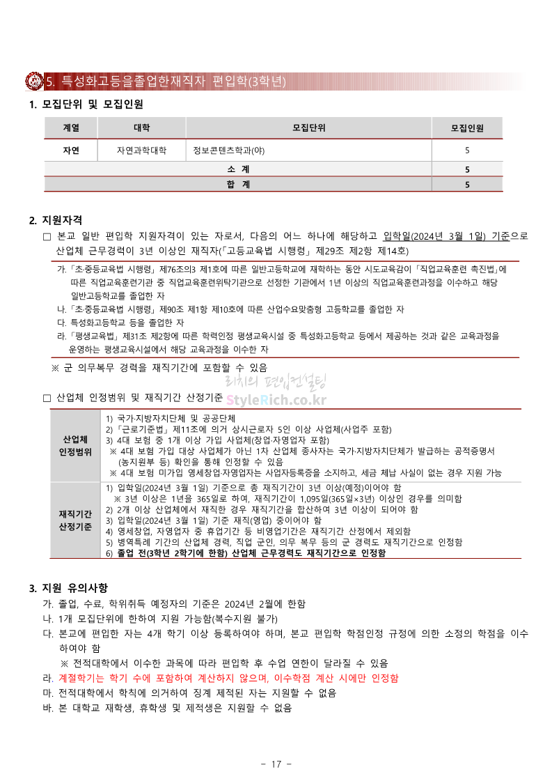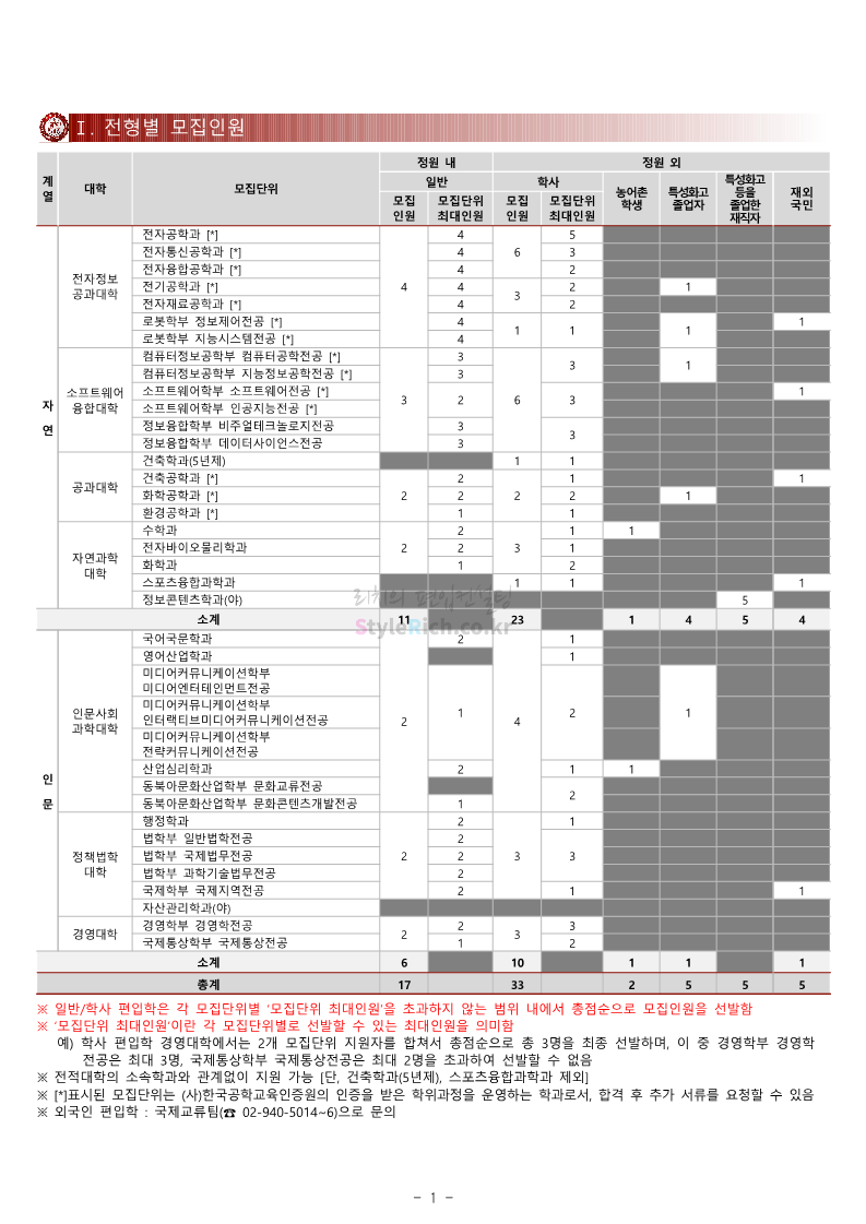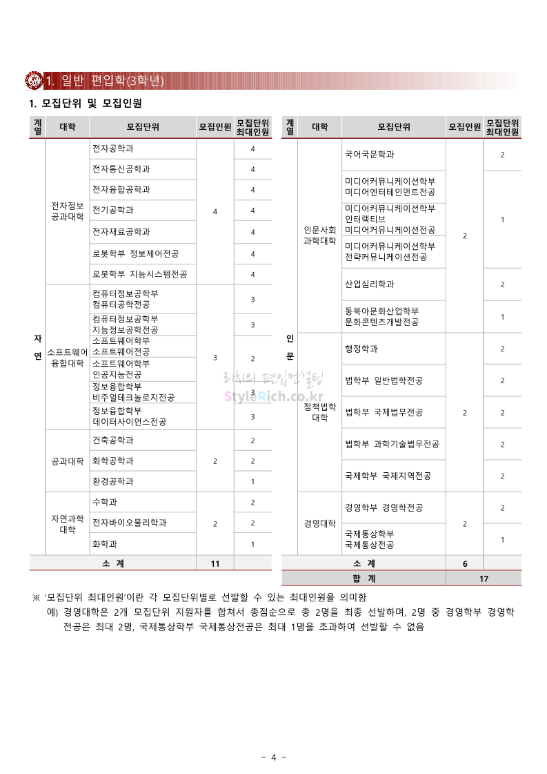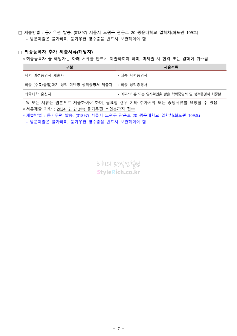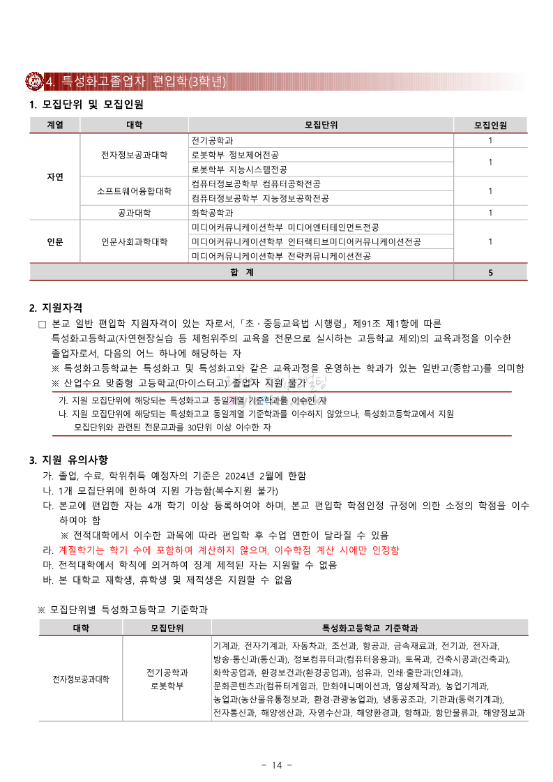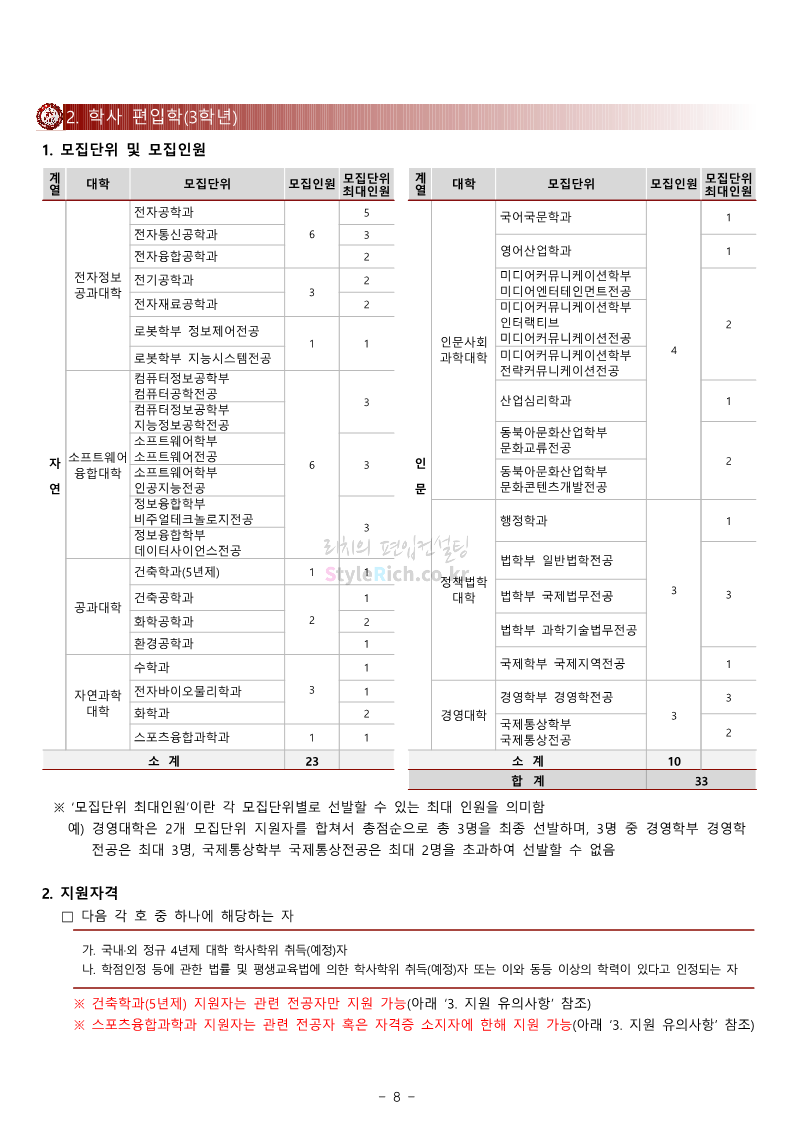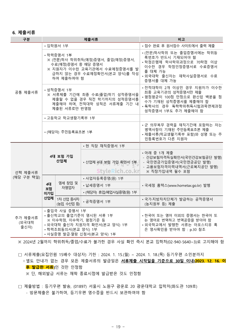 광운대 편입 2024학년도 모집요강 간편하게 보자! 2023.12.02 01:03 편입 모집요강/2024학년도 모집요강 2024학년도 광운대 편입 모집요강(2023.11.30 기준)을 간편하게 확인하세요. * 최종 모집요강 발표 이후에도 내용의 일부가 변경될 수 있으니 지원 전 반드시 광운대 입학처에서 확인하세요. ☞광운대 편입 최신 모집요강 확인하기 ☜ <출처: 광운대> 공유하기 게시글 관리 리치의 편입컨설팅 저작자표시 비영리 변경금지 (새창열림) '편입 모집요강 > 2024학년도 모집요강' 카테고리의 다른 글 상명대 편입 2024학년도 모집요강 간편하게 보자! (0) 2023.12.02 동국대 편입 2024학년도 모집요강 간편하게 보자! (0) 2023.12.02 가톨릭대 편입 2024학년도 모집요강 간편하게 보자! (0) 2023.12.02 숭실대 편입 2024학년도 모집요강 간편하게 보자! (0) 2023.11.30 경희대 편입 2024학년도 모집요강 간편하게 보자! (0) 2023.11.30 댓글 공유하기 다른 글 댓글 이 글 공유하기 구독하기 구독하기 카카오톡 카카오톡 라인 라인 트위터 트위터 Facebook Facebook 카카오스토리 카카오스토리 밴드 밴드 네이버 블로그 네이버 블로그 Pocket Pocket Evernote Evernote 다른 글 상명대 편입 2024학년도 모집요강 간편하게 보자! 상명대 편입 2024학년도 모집요강 간편하게 보자! 2023.12.02 동국대 편입 2024학년도 모집요강 간편하게 보자! 동국대 편입 2024학년도 모집요강 간편하게 보자! 2023.12.02 가톨릭대 편입 2024학년도 모집요강 간편하게 보자! 가톨릭대 편입 2024학년도 모집요강 간편하게 보자! 2023.12.02 숭실대 편입 2024학년도 모집요강 간편하게 보자! 숭실대 편입 2024학년도 모집요강 간편하게 보자! 2023.11.30 다른 글 더 둘러보기