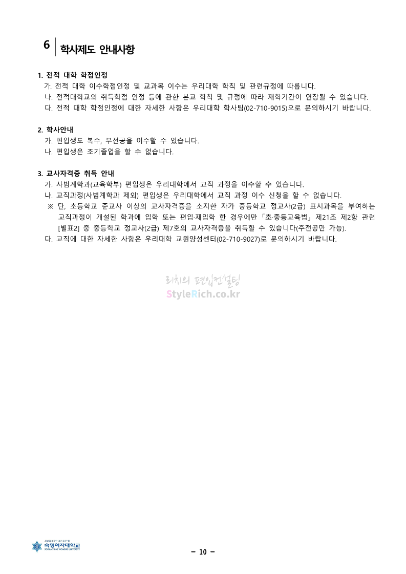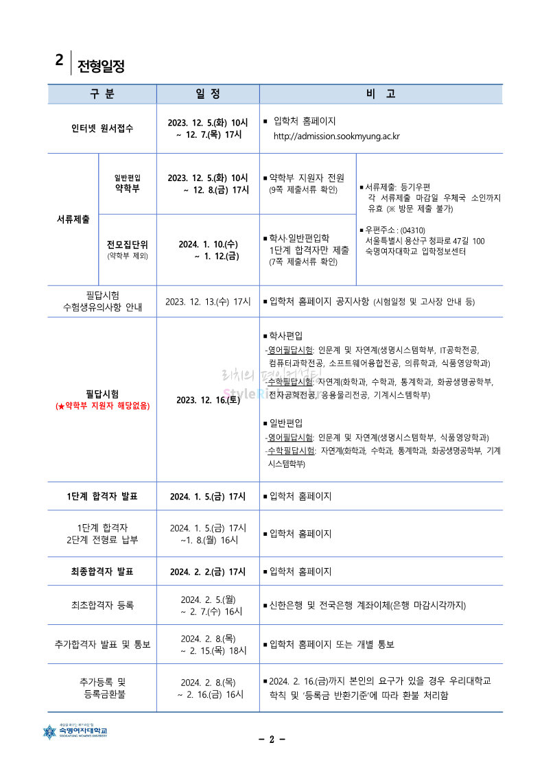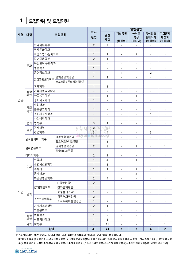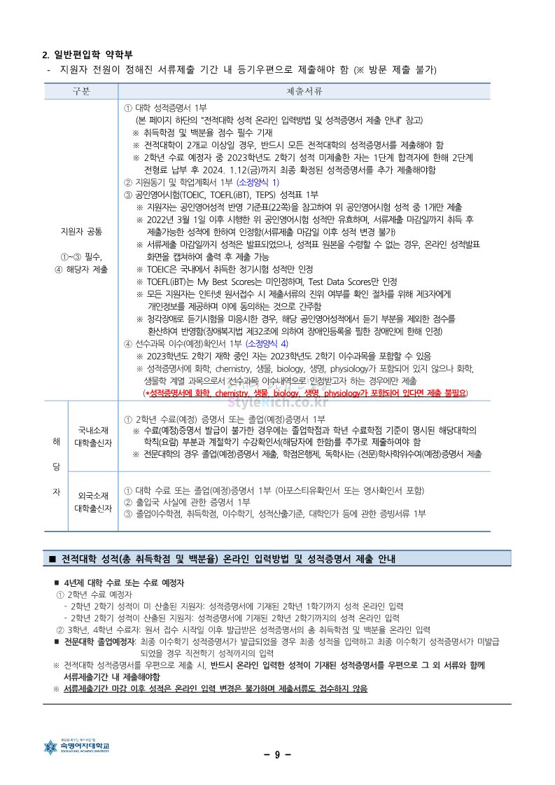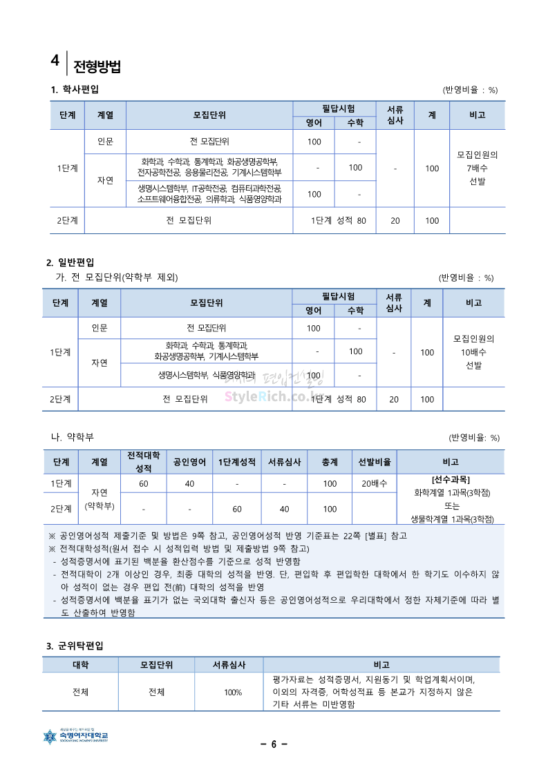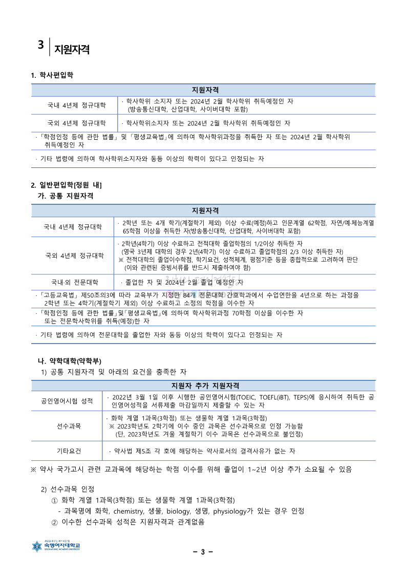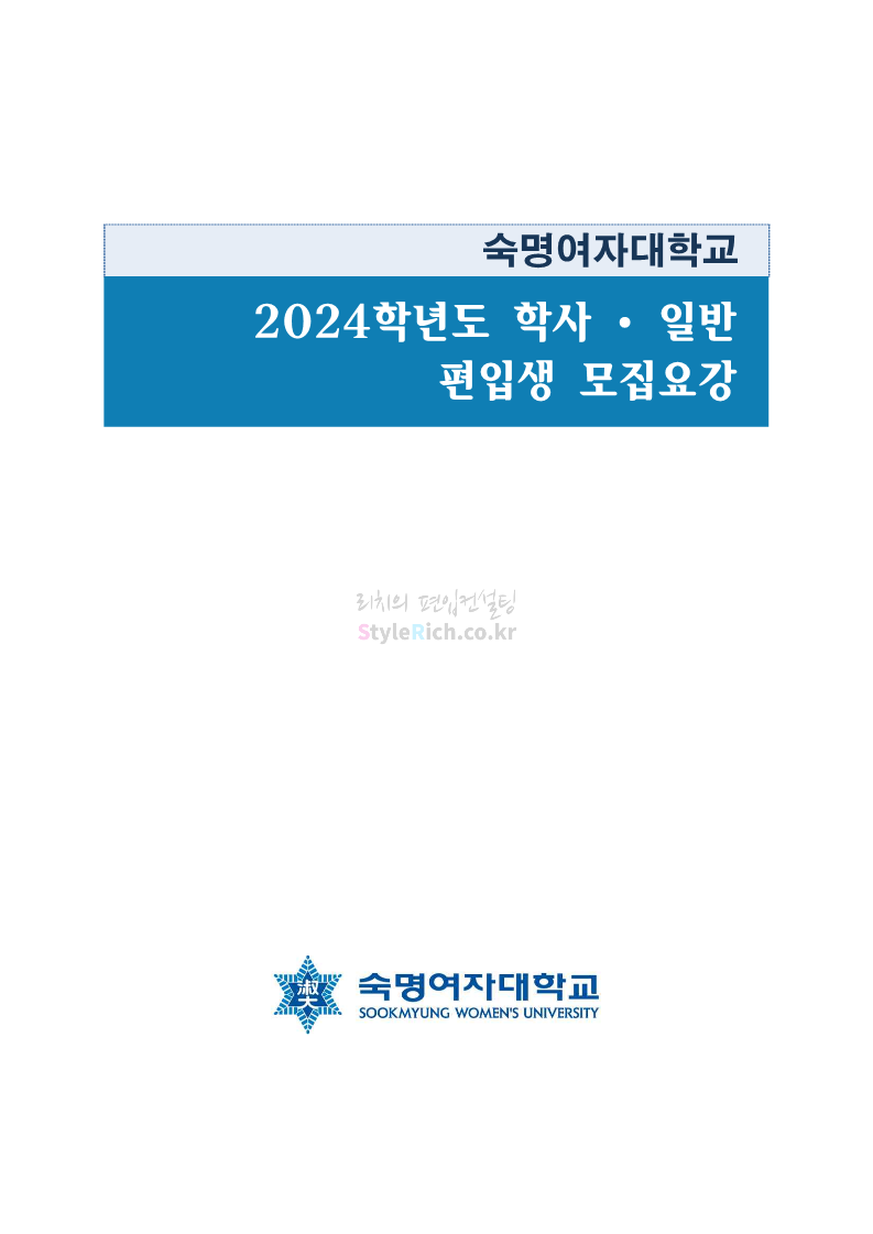 숙명여대 편입 2024학년도 편입 모집요강 간편하게 보자! 2023.12.02 11:53 편입 모집요강/2024학년도 모집요강 2024학년도 숙명여대 편입 모집요강(2023.12.01 기준)을 간편하게 확인하세요. * 최종 모집요강 발표 이후에도 내용의 일부가 변경될 수 있으니 지원 전 반드시 숙명여대 입학처에서 확인하세요. ☞숙명여대 편입 최신 모집요강 확인하기☜ <출처: 숙명여대> 공유하기 게시글 관리 리치의 편입컨설팅 저작자표시 비영리 변경금지 (새창열림) '편입 모집요강 > 2024학년도 모집요강' 카테고리의 다른 글 건국대 편입 2024학년도 모집요강 간편하게 보자! (0) 2023.12.04 이화여대 편입 2024학년도 모집요강 간편하게 보자! (0) 2023.12.02 서울과학기술대 편입 2024학년도 모집요강 간편하게 보자! (0) 2023.12.02 상명대 편입 2024학년도 모집요강 간편하게 보자! (0) 2023.12.02 동국대 편입 2024학년도 모집요강 간편하게 보자! (0) 2023.12.02 댓글 공유하기 다른 글 댓글 이 글 공유하기 구독하기 구독하기 카카오톡 카카오톡 라인 라인 트위터 트위터 Facebook Facebook 카카오스토리 카카오스토리 밴드 밴드 네이버 블로그 네이버 블로그 Pocket Pocket Evernote Evernote 다른 글 건국대 편입 2024학년도 모집요강 간편하게 보자! 건국대 편입 2024학년도 모집요강 간편하게 보자! 2023.12.04 이화여대 편입 2024학년도 모집요강 간편하게 보자! 이화여대 편입 2024학년도 모집요강 간편하게 보자! 2023.12.02 서울과학기술대 편입 2024학년도 모집요강 간편하게 보자! 서울과학기술대 편입 2024학년도 모집요강 간편하게 보자! 2023.12.02 상명대 편입 2024학년도 모집요강 간편하게 보자! 상명대 편입 2024학년도 모집요강 간편하게 보자! 2023.12.02 다른 글 더 둘러보기