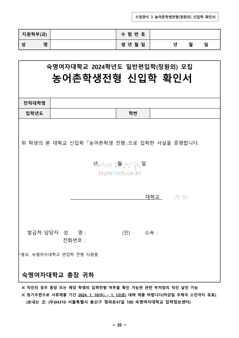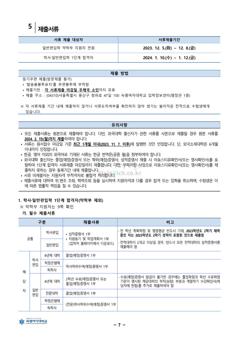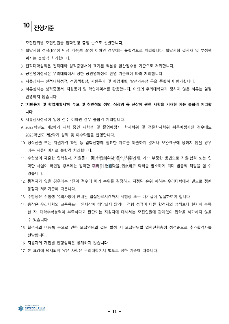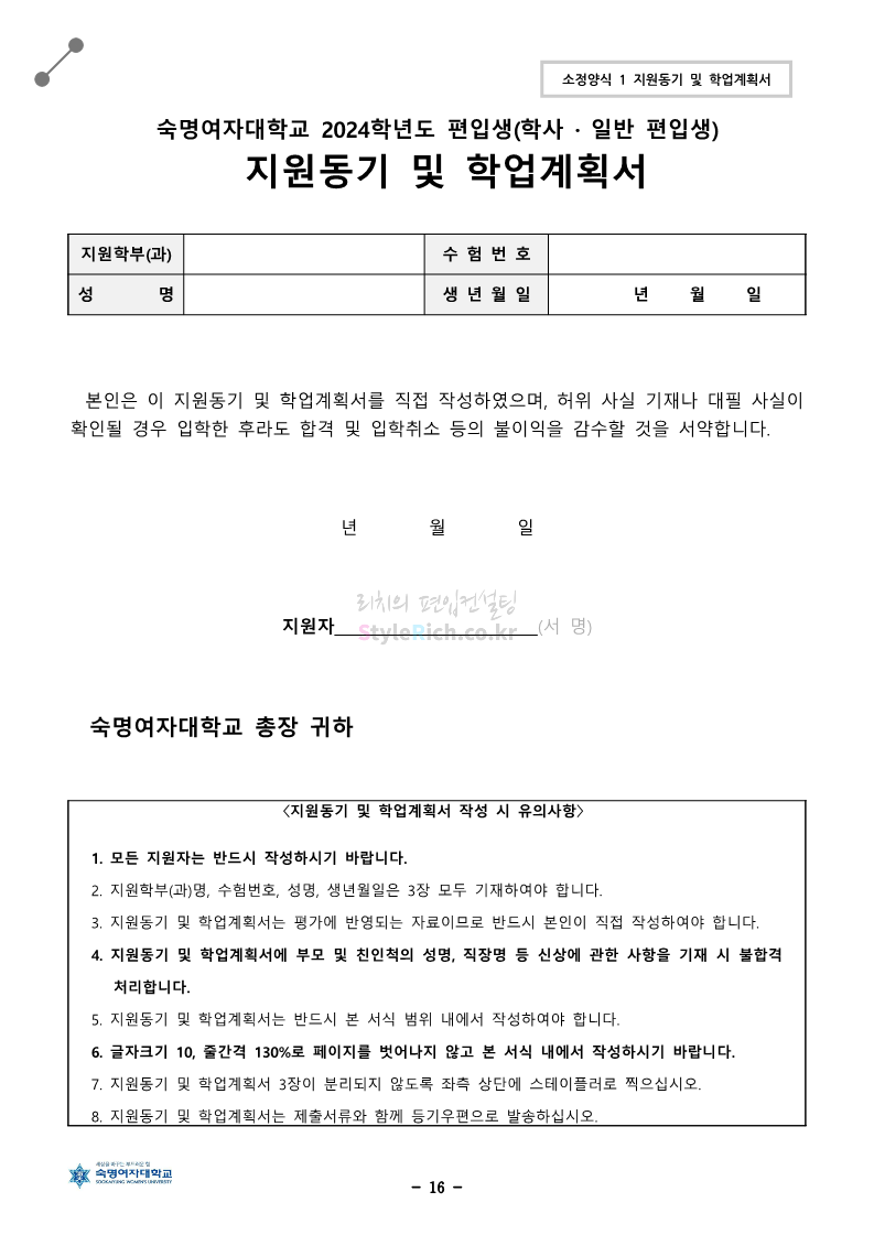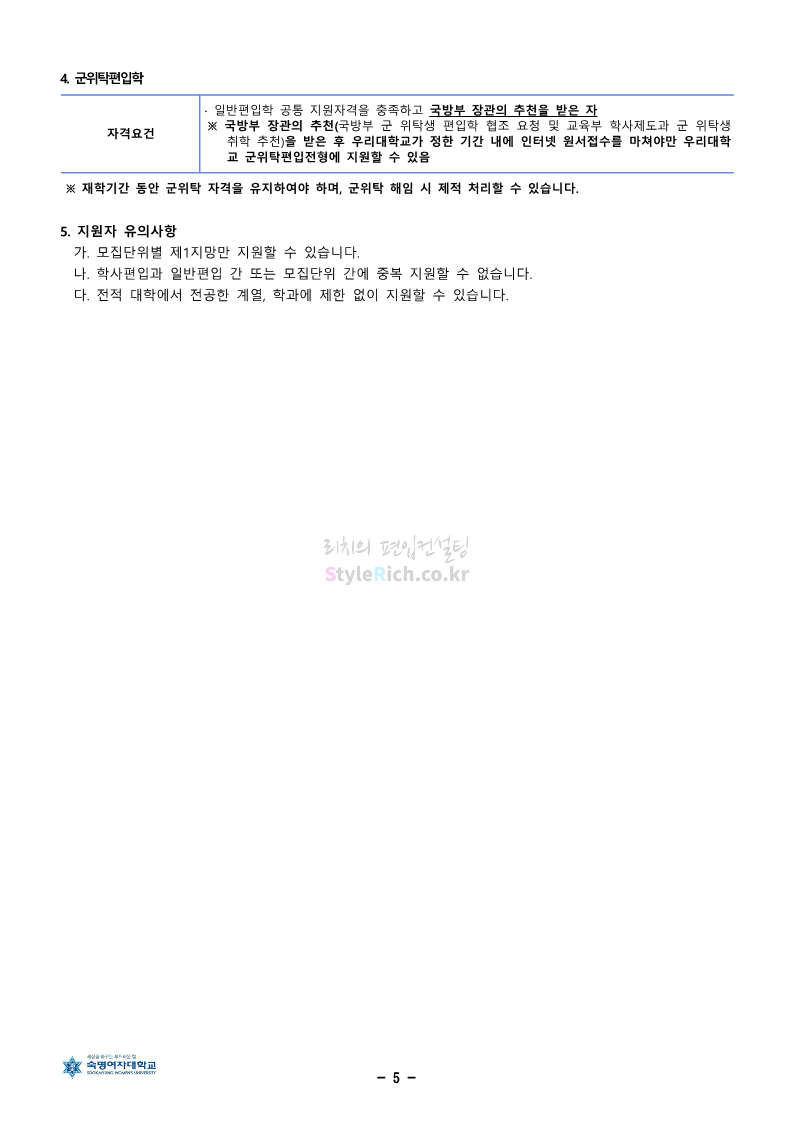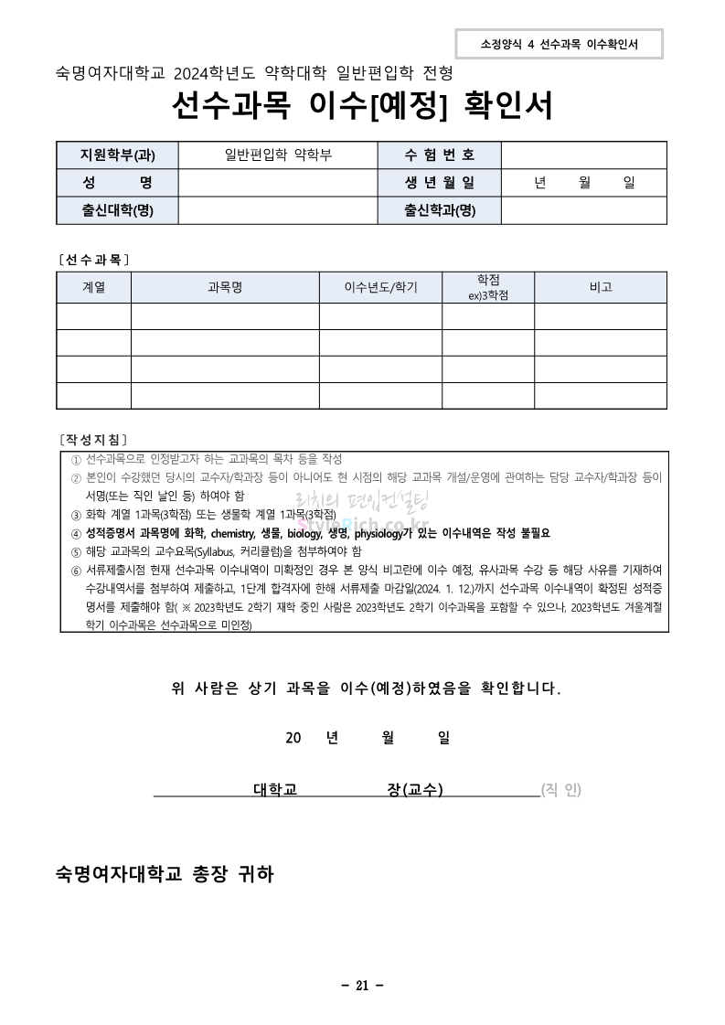 숙명여대 편입 2024학년도 편입 모집요강 간편하게 보자! 2023.12.02 11:53 편입 모집요강/2024학년도 모집요강 2024학년도 숙명여대 편입 모집요강(2023.12.01 기준)을 간편하게 확인하세요. * 최종 모집요강 발표 이후에도 내용의 일부가 변경될 수 있으니 지원 전 반드시 숙명여대 입학처에서 확인하세요. ☞숙명여대 편입 최신 모집요강 확인하기☜ <출처: 숙명여대> 공유하기 게시글 관리 리치의 편입컨설팅 저작자표시 비영리 변경금지 (새창열림) '편입 모집요강 > 2024학년도 모집요강' 카테고리의 다른 글 건국대 편입 2024학년도 모집요강 간편하게 보자! (0) 2023.12.04 이화여대 편입 2024학년도 모집요강 간편하게 보자! (0) 2023.12.02 서울과학기술대 편입 2024학년도 모집요강 간편하게 보자! (0) 2023.12.02 상명대 편입 2024학년도 모집요강 간편하게 보자! (0) 2023.12.02 동국대 편입 2024학년도 모집요강 간편하게 보자! (0) 2023.12.02 댓글 공유하기 다른 글 댓글 이 글 공유하기 구독하기 구독하기 카카오톡 카카오톡 라인 라인 트위터 트위터 Facebook Facebook 카카오스토리 카카오스토리 밴드 밴드 네이버 블로그 네이버 블로그 Pocket Pocket Evernote Evernote 다른 글 건국대 편입 2024학년도 모집요강 간편하게 보자! 건국대 편입 2024학년도 모집요강 간편하게 보자! 2023.12.04 이화여대 편입 2024학년도 모집요강 간편하게 보자! 이화여대 편입 2024학년도 모집요강 간편하게 보자! 2023.12.02 서울과학기술대 편입 2024학년도 모집요강 간편하게 보자! 서울과학기술대 편입 2024학년도 모집요강 간편하게 보자! 2023.12.02 상명대 편입 2024학년도 모집요강 간편하게 보자! 상명대 편입 2024학년도 모집요강 간편하게 보자! 2023.12.02 다른 글 더 둘러보기