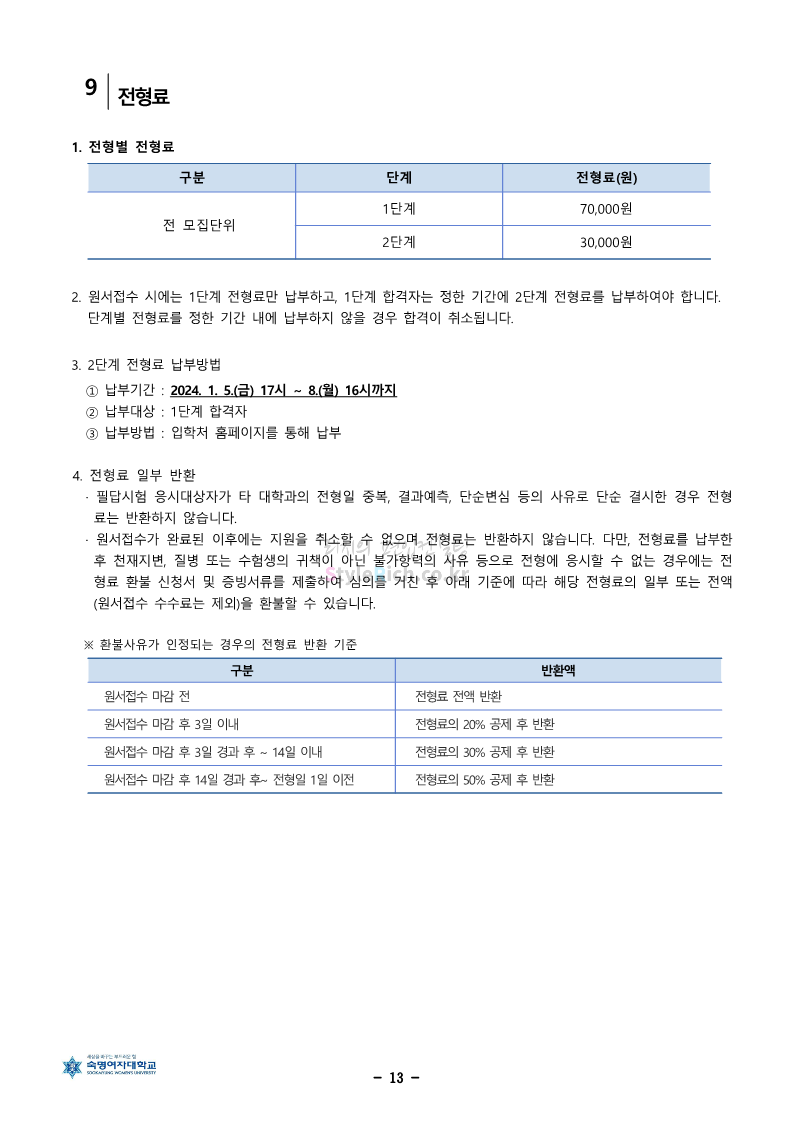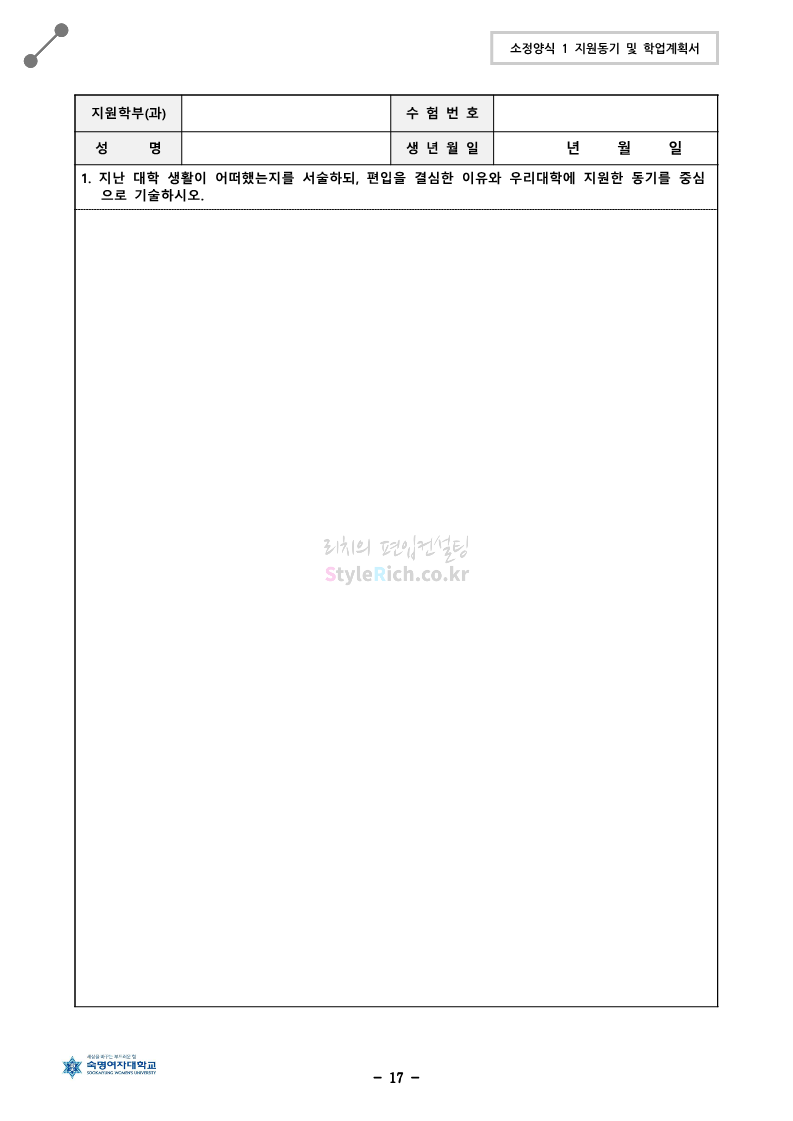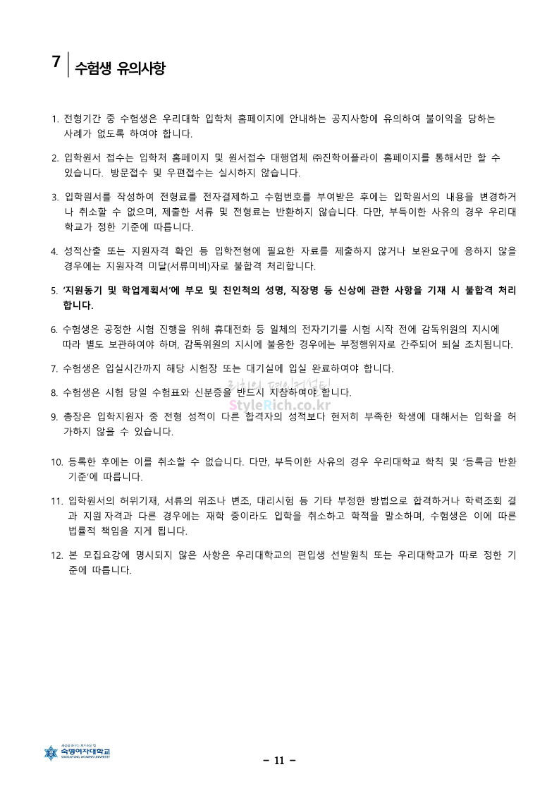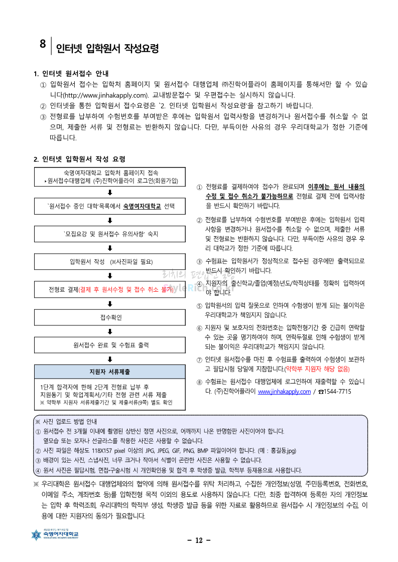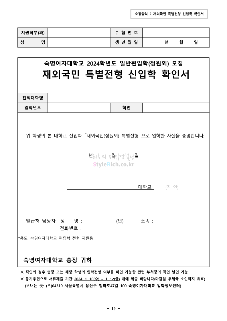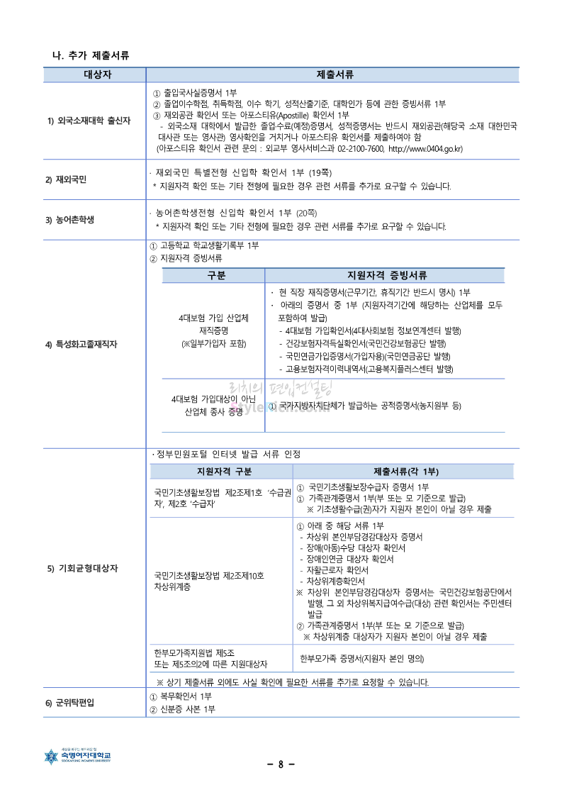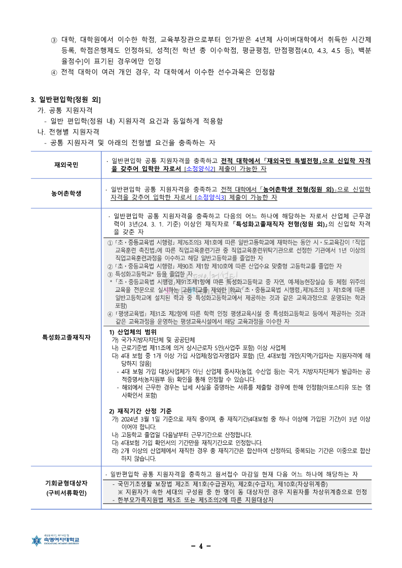 숙명여대 편입 2024학년도 편입 모집요강 간편하게 보자! 2023.12.02 11:53 편입 모집요강/2024학년도 모집요강 2024학년도 숙명여대 편입 모집요강(2023.12.01 기준)을 간편하게 확인하세요. * 최종 모집요강 발표 이후에도 내용의 일부가 변경될 수 있으니 지원 전 반드시 숙명여대 입학처에서 확인하세요. ☞숙명여대 편입 최신 모집요강 확인하기☜ <출처: 숙명여대> 공유하기 게시글 관리 리치의 편입컨설팅 저작자표시 비영리 변경금지 (새창열림) '편입 모집요강 > 2024학년도 모집요강' 카테고리의 다른 글 건국대 편입 2024학년도 모집요강 간편하게 보자! (0) 2023.12.04 이화여대 편입 2024학년도 모집요강 간편하게 보자! (0) 2023.12.02 서울과학기술대 편입 2024학년도 모집요강 간편하게 보자! (0) 2023.12.02 상명대 편입 2024학년도 모집요강 간편하게 보자! (0) 2023.12.02 동국대 편입 2024학년도 모집요강 간편하게 보자! (0) 2023.12.02 댓글 공유하기 다른 글 댓글 이 글 공유하기 구독하기 구독하기 카카오톡 카카오톡 라인 라인 트위터 트위터 Facebook Facebook 카카오스토리 카카오스토리 밴드 밴드 네이버 블로그 네이버 블로그 Pocket Pocket Evernote Evernote 다른 글 건국대 편입 2024학년도 모집요강 간편하게 보자! 건국대 편입 2024학년도 모집요강 간편하게 보자! 2023.12.04 이화여대 편입 2024학년도 모집요강 간편하게 보자! 이화여대 편입 2024학년도 모집요강 간편하게 보자! 2023.12.02 서울과학기술대 편입 2024학년도 모집요강 간편하게 보자! 서울과학기술대 편입 2024학년도 모집요강 간편하게 보자! 2023.12.02 상명대 편입 2024학년도 모집요강 간편하게 보자! 상명대 편입 2024학년도 모집요강 간편하게 보자! 2023.12.02 다른 글 더 둘러보기
