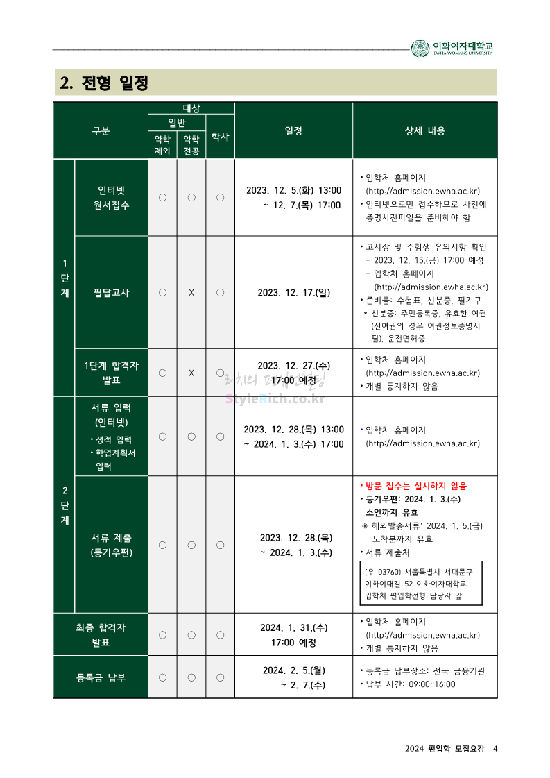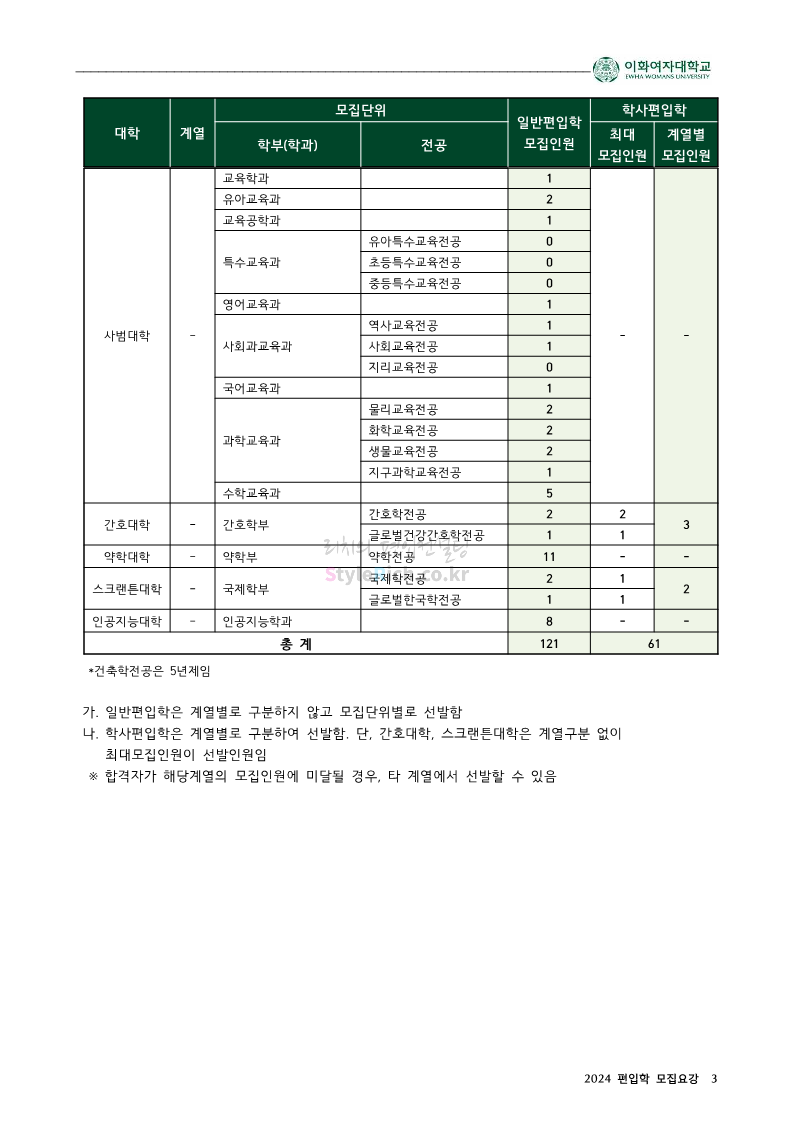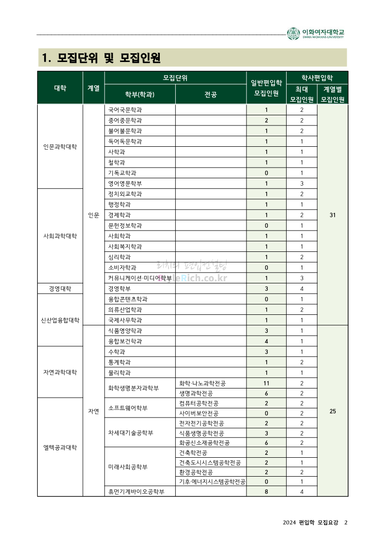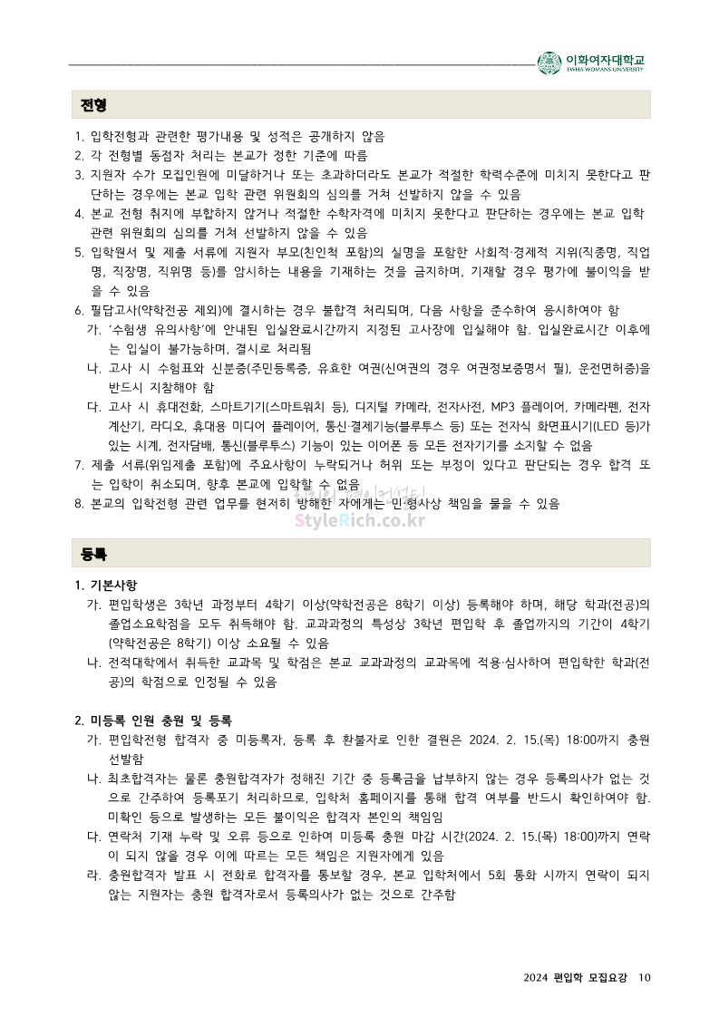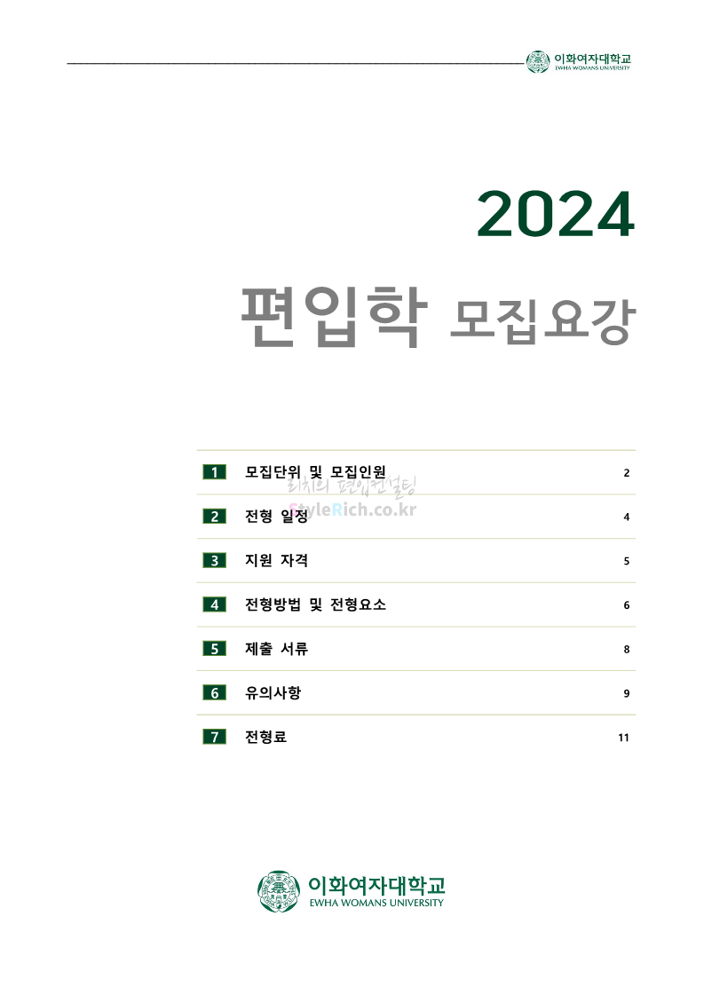 이화여대 편입 2024학년도 모집요강 간편하게 보자! 2023.12.02 12:38 편입 모집요강/2024학년도 모집요강 2024학년도 이화여대 편입 모집요강(2023.12.01 기준)을 간편하게 확인하세요. * 최종 모집요강 발표 이후에도 내용의 일부가 변경될 수 있으니 지원 전 반드시 이화여대 입학처에서 확인하세요. ☞이화여대 편입 최신 모집요강 확인하기☜ <출처: 이화여대> 공유하기 게시글 관리 리치의 편입컨설팅 저작자표시 비영리 변경금지 (새창열림) '편입 모집요강 > 2024학년도 모집요강' 카테고리의 다른 글 중앙대 편입 2024학년도 모집요강 간편하게 보자! (0) 2023.12.04 건국대 편입 2024학년도 모집요강 간편하게 보자! (0) 2023.12.04 숙명여대 편입 2024학년도 편입 모집요강 간편하게 보자! (0) 2023.12.02 서울과학기술대 편입 2024학년도 모집요강 간편하게 보자! (0) 2023.12.02 상명대 편입 2024학년도 모집요강 간편하게 보자! (0) 2023.12.02 댓글 공유하기 다른 글 댓글 이 글 공유하기 구독하기 구독하기 카카오톡 카카오톡 라인 라인 트위터 트위터 Facebook Facebook 카카오스토리 카카오스토리 밴드 밴드 네이버 블로그 네이버 블로그 Pocket Pocket Evernote Evernote 다른 글 중앙대 편입 2024학년도 모집요강 간편하게 보자! 중앙대 편입 2024학년도 모집요강 간편하게 보자! 2023.12.04 건국대 편입 2024학년도 모집요강 간편하게 보자! 건국대 편입 2024학년도 모집요강 간편하게 보자! 2023.12.04 숙명여대 편입 2024학년도 편입 모집요강 간편하게 보자! 숙명여대 편입 2024학년도 편입 모집요강 간편하게 보자! 2023.12.02 서울과학기술대 편입 2024학년도 모집요강 간편하게 보자! 서울과학기술대 편입 2024학년도 모집요강 간편하게 보자! 2023.12.02 다른 글 더 둘러보기