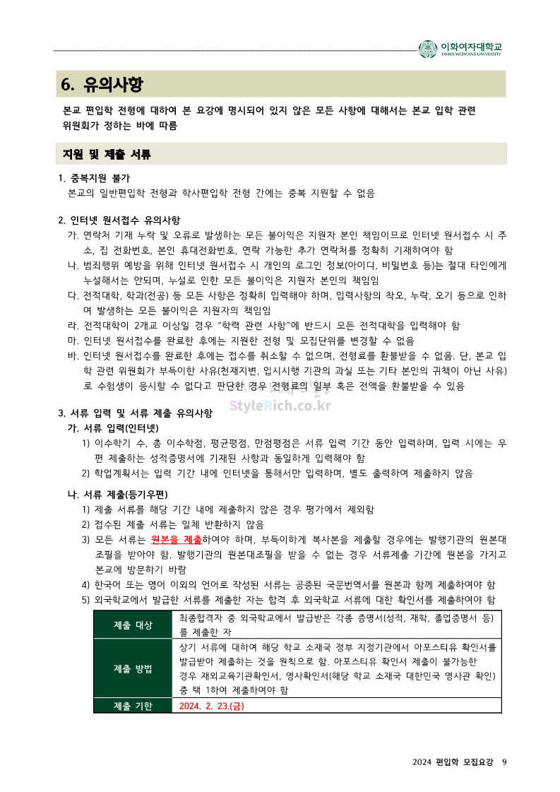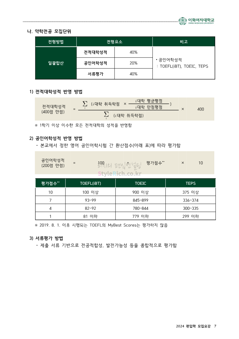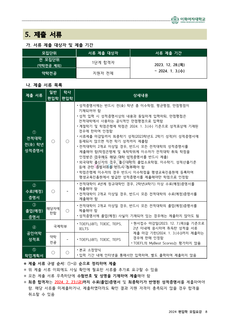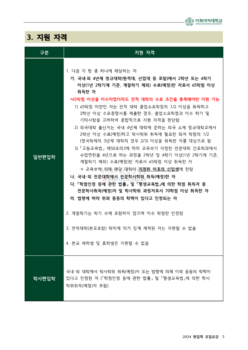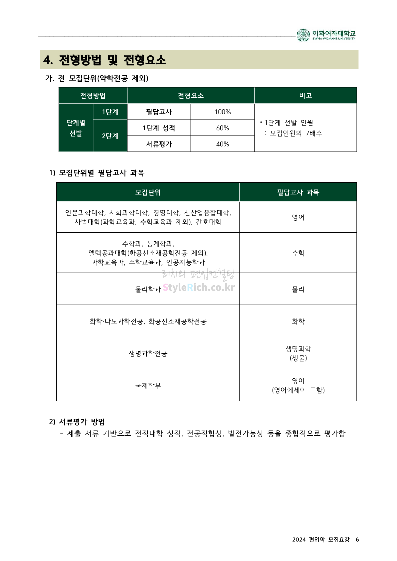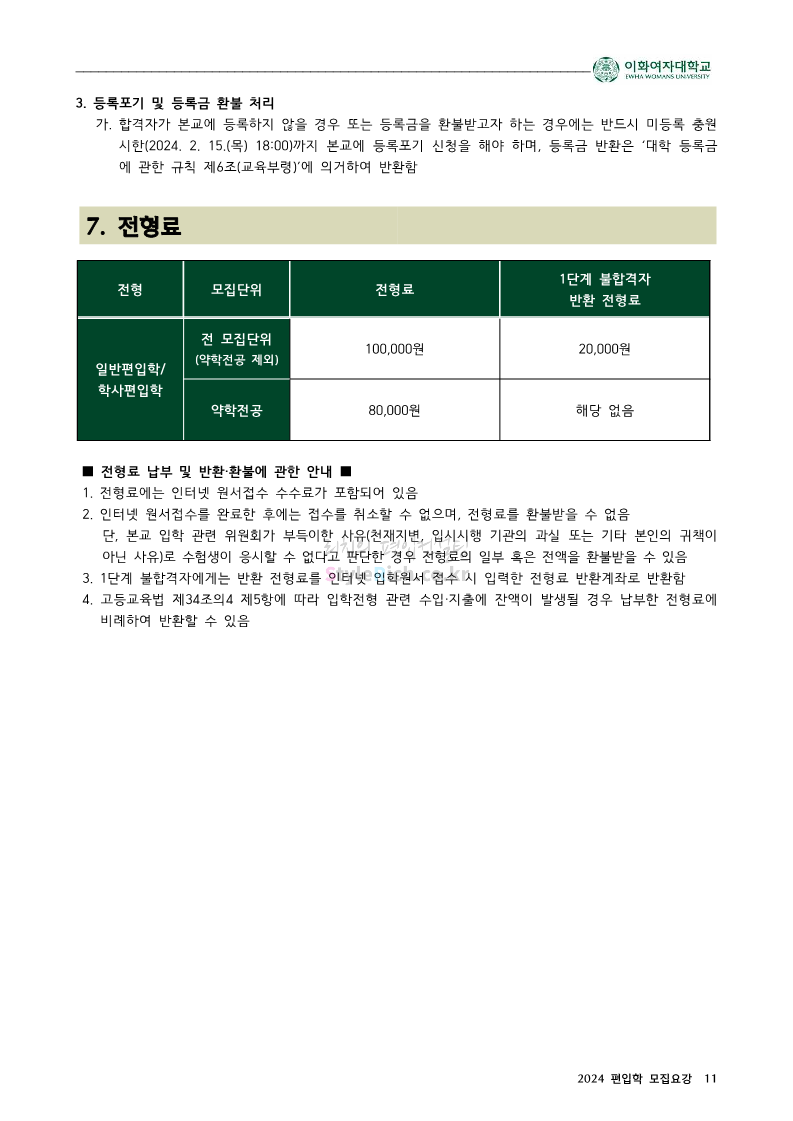 이화여대 편입 2024학년도 모집요강 간편하게 보자! 2023.12.02 12:38 편입 모집요강/2024학년도 모집요강 2024학년도 이화여대 편입 모집요강(2023.12.01 기준)을 간편하게 확인하세요. * 최종 모집요강 발표 이후에도 내용의 일부가 변경될 수 있으니 지원 전 반드시 이화여대 입학처에서 확인하세요. ☞이화여대 편입 최신 모집요강 확인하기☜ <출처: 이화여대> 공유하기 게시글 관리 리치의 편입컨설팅 저작자표시 비영리 변경금지 (새창열림) '편입 모집요강 > 2024학년도 모집요강' 카테고리의 다른 글 중앙대 편입 2024학년도 모집요강 간편하게 보자! (0) 2023.12.04 건국대 편입 2024학년도 모집요강 간편하게 보자! (0) 2023.12.04 숙명여대 편입 2024학년도 편입 모집요강 간편하게 보자! (0) 2023.12.02 서울과학기술대 편입 2024학년도 모집요강 간편하게 보자! (0) 2023.12.02 상명대 편입 2024학년도 모집요강 간편하게 보자! (0) 2023.12.02 댓글 공유하기 다른 글 댓글 이 글 공유하기 구독하기 구독하기 카카오톡 카카오톡 라인 라인 트위터 트위터 Facebook Facebook 카카오스토리 카카오스토리 밴드 밴드 네이버 블로그 네이버 블로그 Pocket Pocket Evernote Evernote 다른 글 중앙대 편입 2024학년도 모집요강 간편하게 보자! 중앙대 편입 2024학년도 모집요강 간편하게 보자! 2023.12.04 건국대 편입 2024학년도 모집요강 간편하게 보자! 건국대 편입 2024학년도 모집요강 간편하게 보자! 2023.12.04 숙명여대 편입 2024학년도 편입 모집요강 간편하게 보자! 숙명여대 편입 2024학년도 편입 모집요강 간편하게 보자! 2023.12.02 서울과학기술대 편입 2024학년도 모집요강 간편하게 보자! 서울과학기술대 편입 2024학년도 모집요강 간편하게 보자! 2023.12.02 다른 글 더 둘러보기