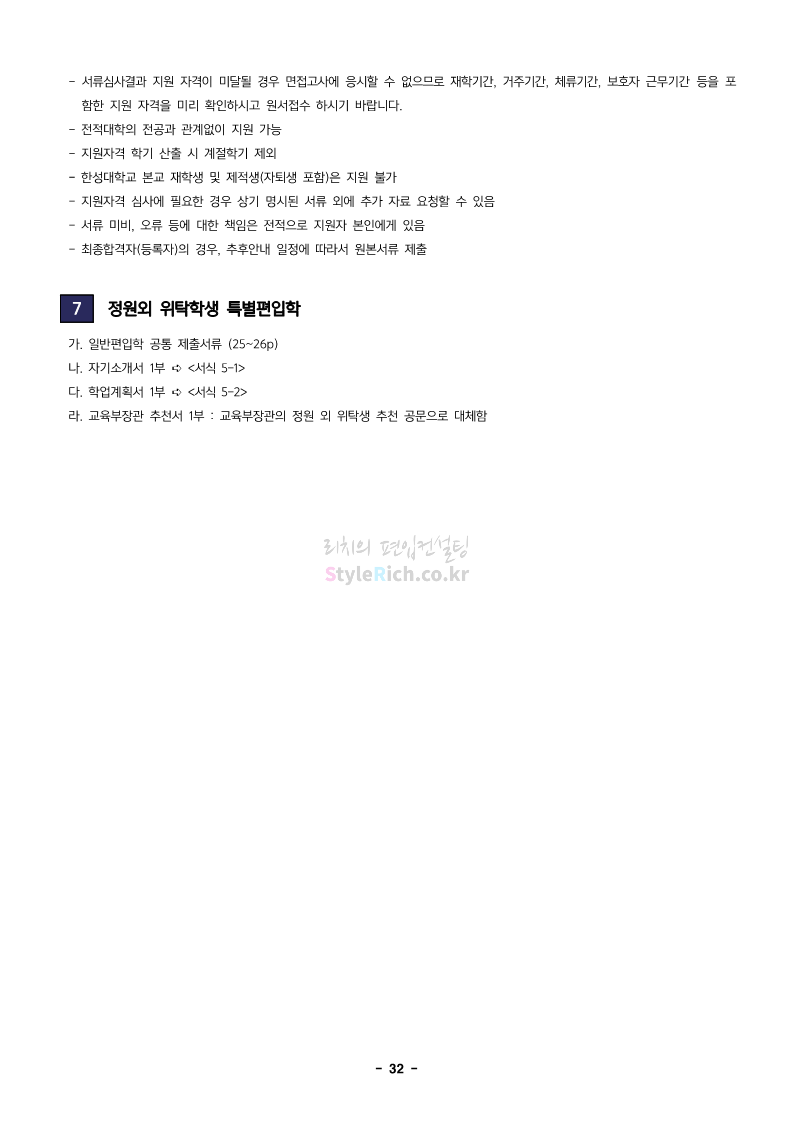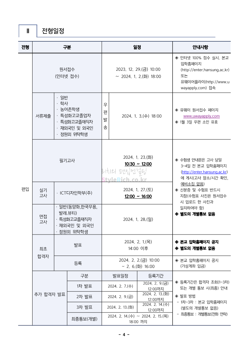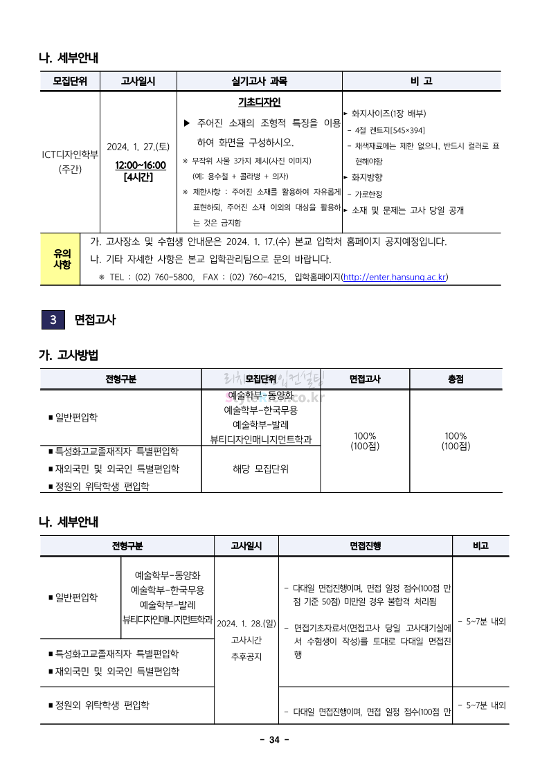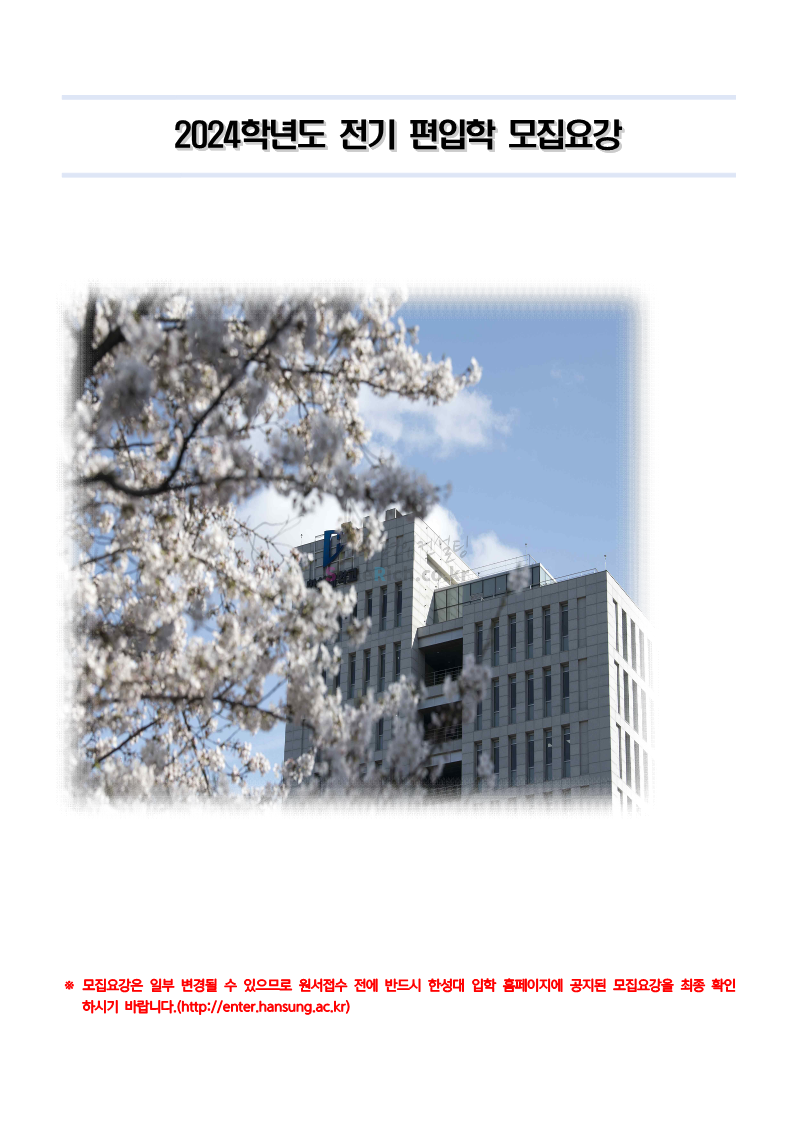 한성대 편입 2024학년도 모집요강 간편하게 보자! 2023.12.09 03:50 편입 모집요강/2024학년도 모집요강 2024학년도 한성대 편입 모집요강(2023.12.08 기준)을 간편하게 확인하세요. * 최종 모집요강 발표 이후에도 내용의 일부가 변경될 수 있으니 지원 전 반드시 한성대 입학처에서 확인하세요. ☞한성대 편입 최신 모집요강 확인하기☜ <출처: 한성대> 공유하기 게시글 관리 리치의 편입컨설팅 저작자표시 비영리 변경금지 (새창열림) '편입 모집요강 > 2024학년도 모집요강' 카테고리의 다른 글 한양대(에리카) 2024학년도 모집요강 간편하게 보자! (0) 2023.12.13 서강대 편입 2024학년도 모집요강 간편하게 보자! (0) 2023.12.11 한국외대 편입 2024학년도 모집요강 간편하게 보자! (0) 2023.12.09 서울여대 2024학년도 모집요강 간편하게 보자! (0) 2023.12.09 서경대 편입 2024학년도 모집요강 간편하게 보자! (0) 2023.12.09 댓글 공유하기 다른 글 댓글 이 글 공유하기 구독하기 구독하기 카카오톡 카카오톡 라인 라인 트위터 트위터 Facebook Facebook 카카오스토리 카카오스토리 밴드 밴드 네이버 블로그 네이버 블로그 Pocket Pocket Evernote Evernote 다른 글 한양대(에리카) 2024학년도 모집요강 간편하게 보자! 한양대(에리카) 2024학년도 모집요강 간편하게 보자! 2023.12.13 서강대 편입 2024학년도 모집요강 간편하게 보자! 서강대 편입 2024학년도 모집요강 간편하게 보자! 2023.12.11 한국외대 편입 2024학년도 모집요강 간편하게 보자! 한국외대 편입 2024학년도 모집요강 간편하게 보자! 2023.12.09 서울여대 2024학년도 모집요강 간편하게 보자! 서울여대 2024학년도 모집요강 간편하게 보자! 2023.12.09 다른 글 더 둘러보기