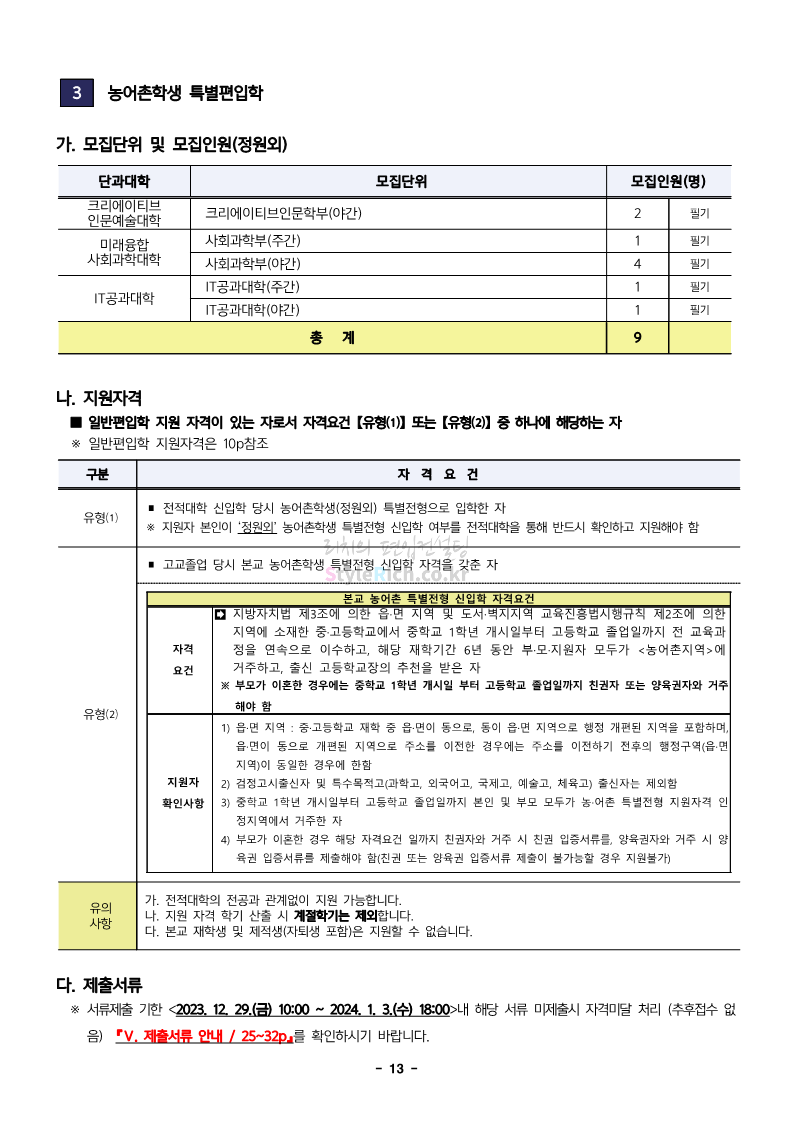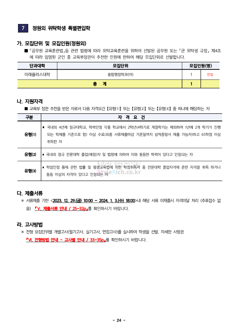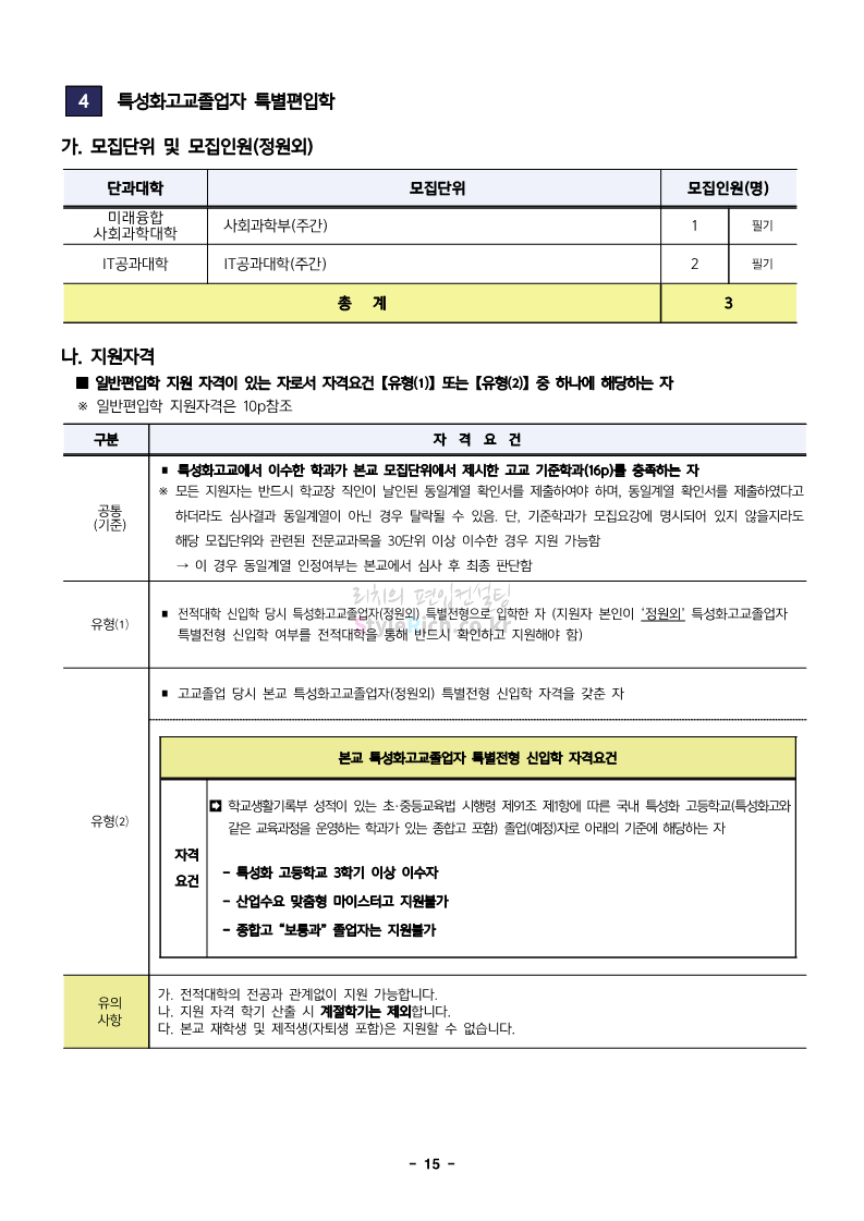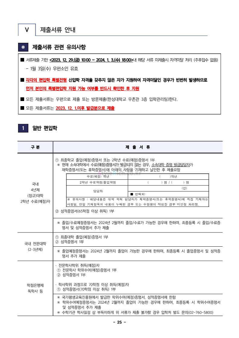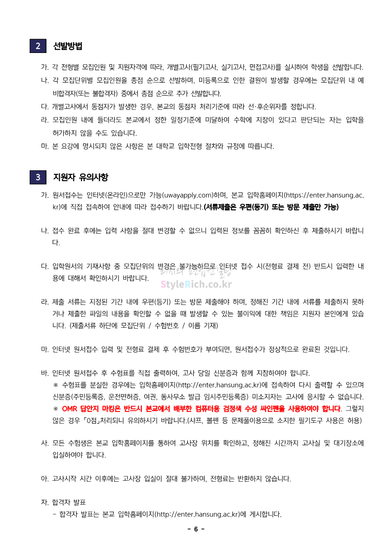 한성대 편입 2024학년도 모집요강 간편하게 보자! 2023.12.09 03:50 편입 모집요강/2024학년도 모집요강 2024학년도 한성대 편입 모집요강(2023.12.08 기준)을 간편하게 확인하세요. * 최종 모집요강 발표 이후에도 내용의 일부가 변경될 수 있으니 지원 전 반드시 한성대 입학처에서 확인하세요. ☞한성대 편입 최신 모집요강 확인하기☜ <출처: 한성대> 공유하기 게시글 관리 리치의 편입컨설팅 저작자표시 비영리 변경금지 (새창열림) '편입 모집요강 > 2024학년도 모집요강' 카테고리의 다른 글 한양대(에리카) 2024학년도 모집요강 간편하게 보자! (0) 2023.12.13 서강대 편입 2024학년도 모집요강 간편하게 보자! (0) 2023.12.11 한국외대 편입 2024학년도 모집요강 간편하게 보자! (0) 2023.12.09 서울여대 2024학년도 모집요강 간편하게 보자! (0) 2023.12.09 서경대 편입 2024학년도 모집요강 간편하게 보자! (0) 2023.12.09 댓글 공유하기 다른 글 댓글 이 글 공유하기 구독하기 구독하기 카카오톡 카카오톡 라인 라인 트위터 트위터 Facebook Facebook 카카오스토리 카카오스토리 밴드 밴드 네이버 블로그 네이버 블로그 Pocket Pocket Evernote Evernote 다른 글 한양대(에리카) 2024학년도 모집요강 간편하게 보자! 한양대(에리카) 2024학년도 모집요강 간편하게 보자! 2023.12.13 서강대 편입 2024학년도 모집요강 간편하게 보자! 서강대 편입 2024학년도 모집요강 간편하게 보자! 2023.12.11 한국외대 편입 2024학년도 모집요강 간편하게 보자! 한국외대 편입 2024학년도 모집요강 간편하게 보자! 2023.12.09 서울여대 2024학년도 모집요강 간편하게 보자! 서울여대 2024학년도 모집요강 간편하게 보자! 2023.12.09 다른 글 더 둘러보기