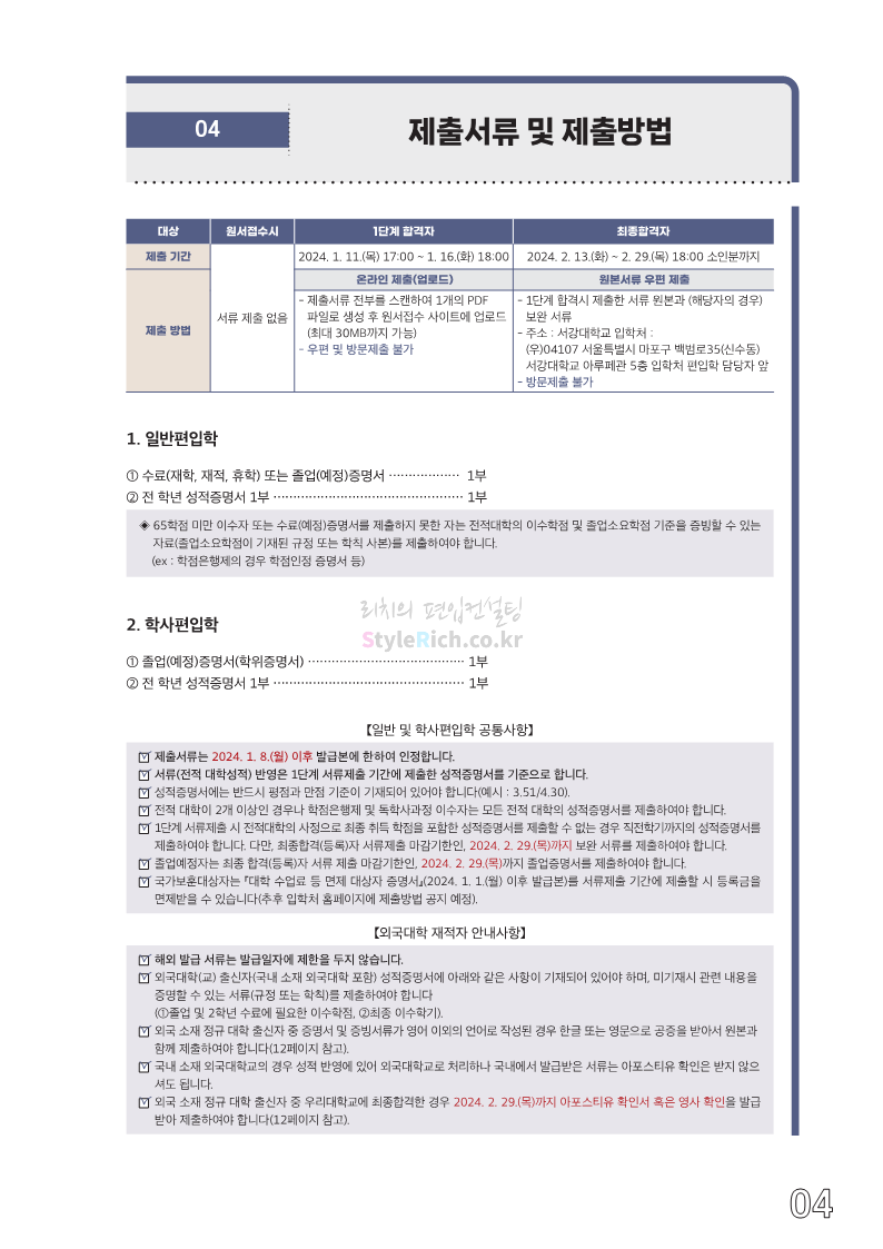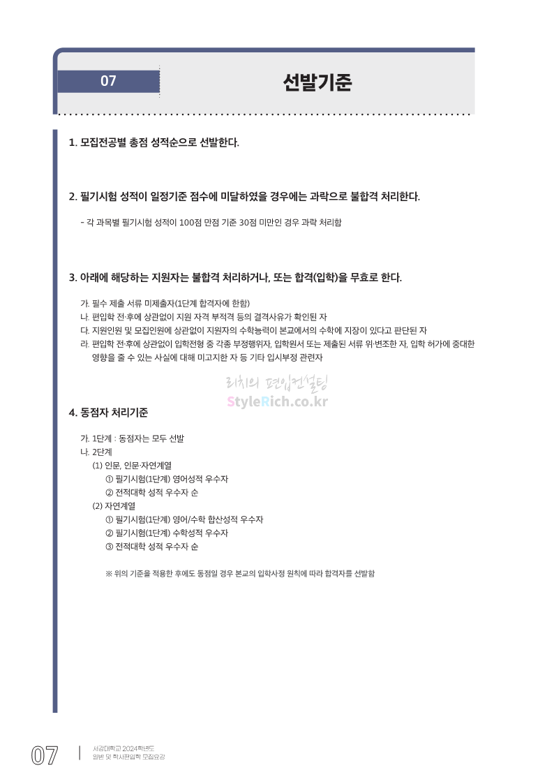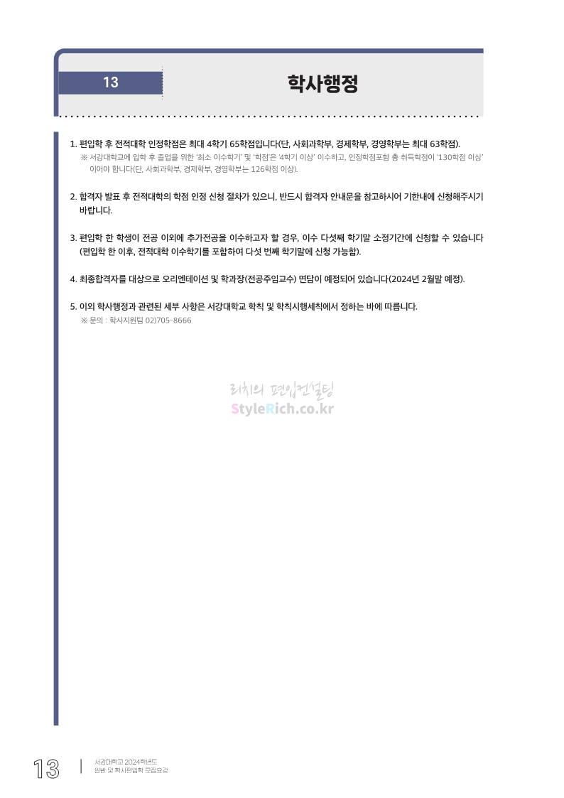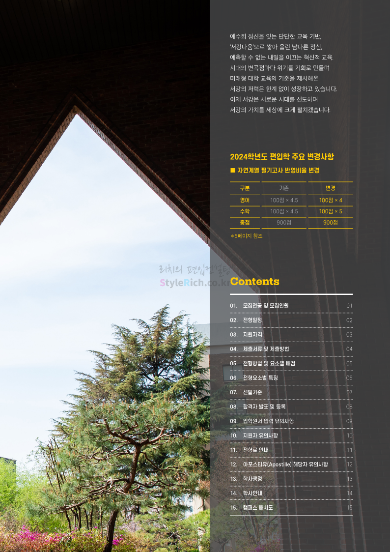 서강대 편입 2024학년도 모집요강 간편하게 보자! 2023.12.11 22:38 편입 모집요강/2024학년도 모집요강 2024학년도 서강대 편입 모집요강(2023.12.11 기준)을 간편하게 확인하세요. * 최종 모집요강 발표 이후에도 내용의 일부가 변경될 수 있으니 지원 전 반드시 서강대 입학처에서 확인하세요. ☞서강대 편입 최신 모집요강 확인하기☜ <출처: 서강대> 공유하기 게시글 관리 리치의 편입컨설팅 저작자표시 비영리 변경금지 (새창열림) '편입 모집요강 > 2024학년도 모집요강' 카테고리의 다른 글 서강대 편입 2024학년도 자연계열 필기시험(수학) 참고분야를 알아보자! (0) 2023.12.13 한양대(에리카) 2024학년도 모집요강 간편하게 보자! (0) 2023.12.13 한성대 편입 2024학년도 모집요강 간편하게 보자! (0) 2023.12.09 한국외대 편입 2024학년도 모집요강 간편하게 보자! (0) 2023.12.09 서울여대 2024학년도 모집요강 간편하게 보자! (0) 2023.12.09 댓글 공유하기 다른 글 댓글 이 글 공유하기 구독하기 구독하기 카카오톡 카카오톡 라인 라인 트위터 트위터 Facebook Facebook 카카오스토리 카카오스토리 밴드 밴드 네이버 블로그 네이버 블로그 Pocket Pocket Evernote Evernote 다른 글 서강대 편입 2024학년도 자연계열 필기시험(수학) 참고분야를 알아보자! 서강대 편입 2024학년도 자연계열 필기시험(수학) 참고분야를 알아보자! 2023.12.13 한양대(에리카) 2024학년도 모집요강 간편하게 보자! 한양대(에리카) 2024학년도 모집요강 간편하게 보자! 2023.12.13 한성대 편입 2024학년도 모집요강 간편하게 보자! 한성대 편입 2024학년도 모집요강 간편하게 보자! 2023.12.09 한국외대 편입 2024학년도 모집요강 간편하게 보자! 한국외대 편입 2024학년도 모집요강 간편하게 보자! 2023.12.09 다른 글 더 둘러보기
