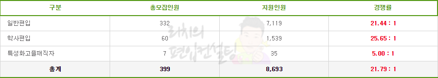인문계에서 가장 경쟁률이 높은 학과는 지리학과이고 가장 낮은 학과는 경제학과입니다. 자연계에서 가장 경쟁률이 높은 학과는 컴퓨터공학과이고 가장 낮은 학과는 물리학과와 줄기세포재생공학과입니다. 일반편입과 마찬가지로 학사편입에서도 인문계가 자연계보다 약 2~3배 이상의 높은 경쟁률을 보이고 있습니다.