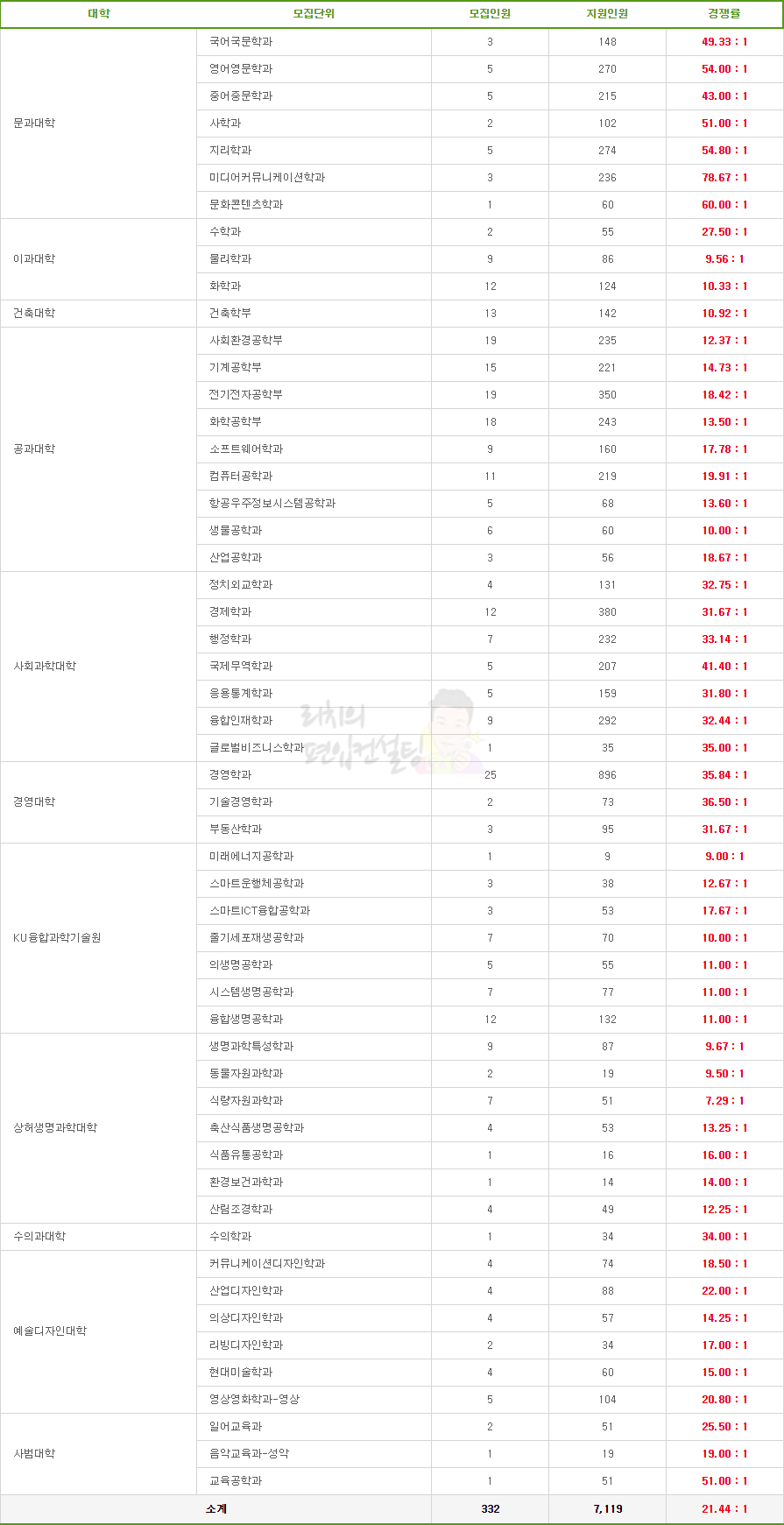 인문계에서 가장 경쟁률이 높은 학과는 미디어커뮤니케이션학과이고 가장 낮은 학과는 일어교육과입니다. 자연계에서 가장 경쟁률이 높은 학과는 수학과이고 가장 낮은 학과는 식량자원과학과입니다. 인문계가 자연계보다 약 2~3배 이상의 높은 경쟁률을 보이며, 특히 문과대학에 속한 모집단위에서 경쟁률이 상당히 높습니다.