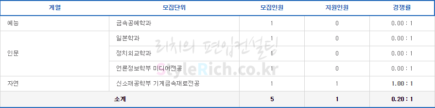 인문계에서는 2개 학과가 모집하였고 경영학부 경영학전공이 중국학부 중국정경전공보다 높았습니다. 자연계에서도 2개 학과만 모집하였고 신소재공학부 기계금속재료전공이 건설시스템공학부 건설시스템공학전공보다 약간 높은 경쟁률을 보였습니다.