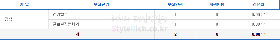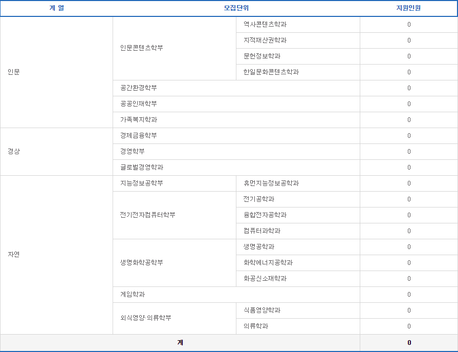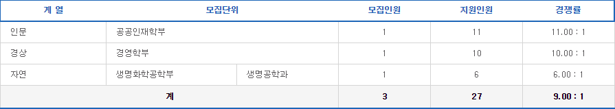 인문·경상계열에서 공공인재학부가 경영학부가보다 경쟁률이 높았습으며, 자연계열에서는 생명공학과만 모집하였습니다.
