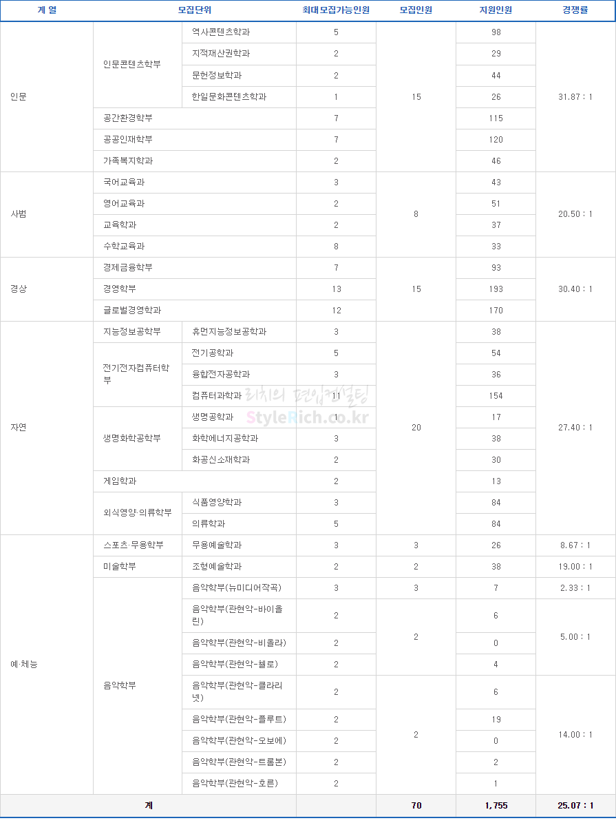 인문·경상계열에서 공공인재학부와 경영학부가 글로벌경영학과보다 경쟁률이 높았습으며, 자연계열에서는 화학에너지공학과만 모집하였습니다.