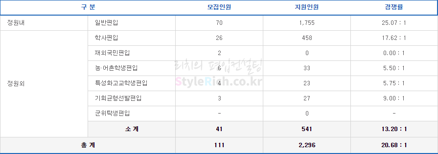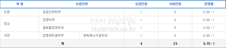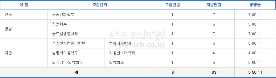 학사편입의 모집 방식에 대해서는 위의 일반편입에서 모집하는 방식과 같으며, 단순히 계열별 경쟁률로만 보았을 때 경상이 가장 높고 자연이 가장 낮습니다.