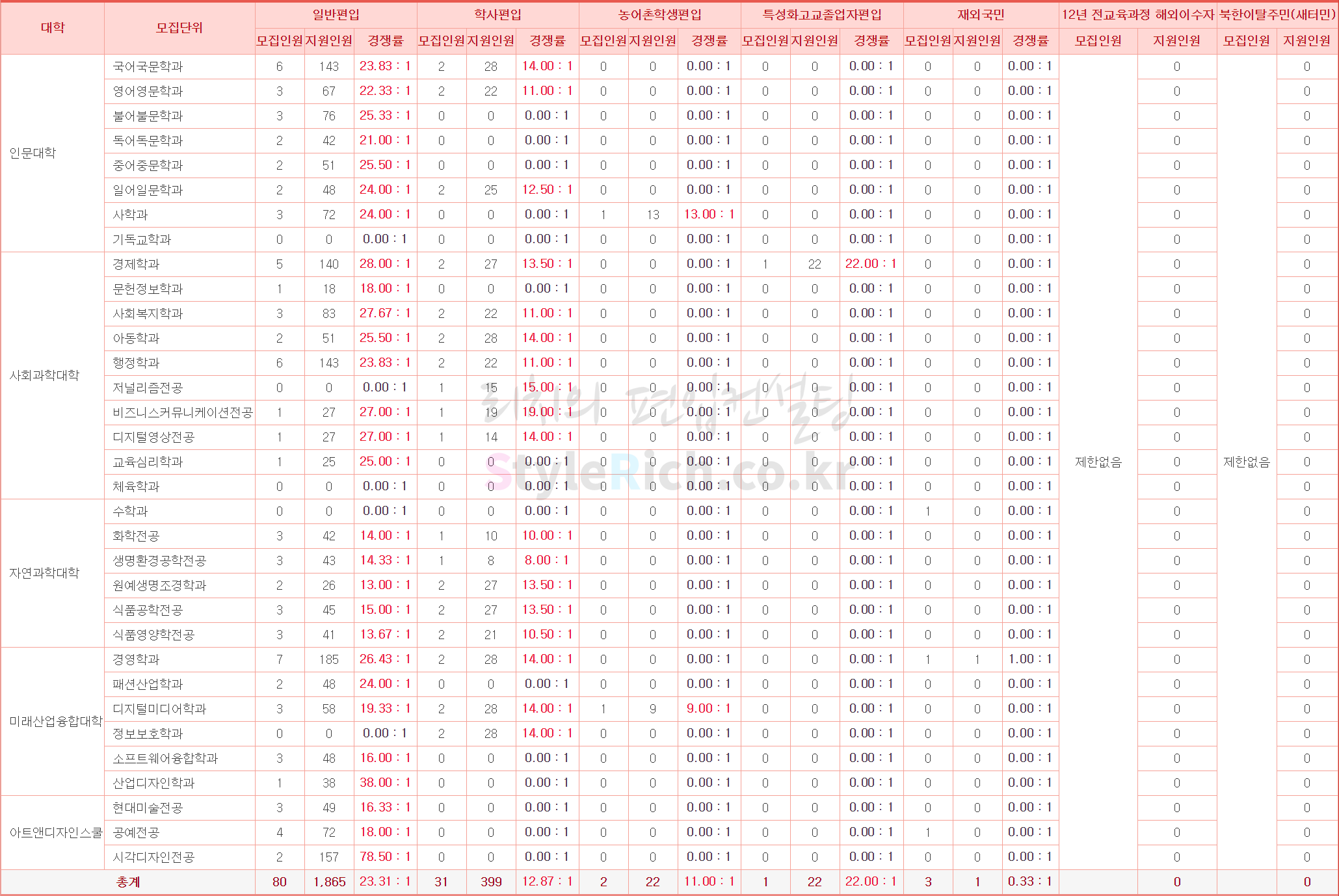 12년 전교육과정 해외이수자 및 북한이탈주민(새터민)편입은 모집인원에 제한이 없어 경쟁률이 성립되지 않습니다.