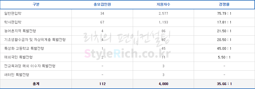 일반편입학이 경쟁률이 가장 높고, 재외국민 특별전형 편입이 가장 낮습니다.