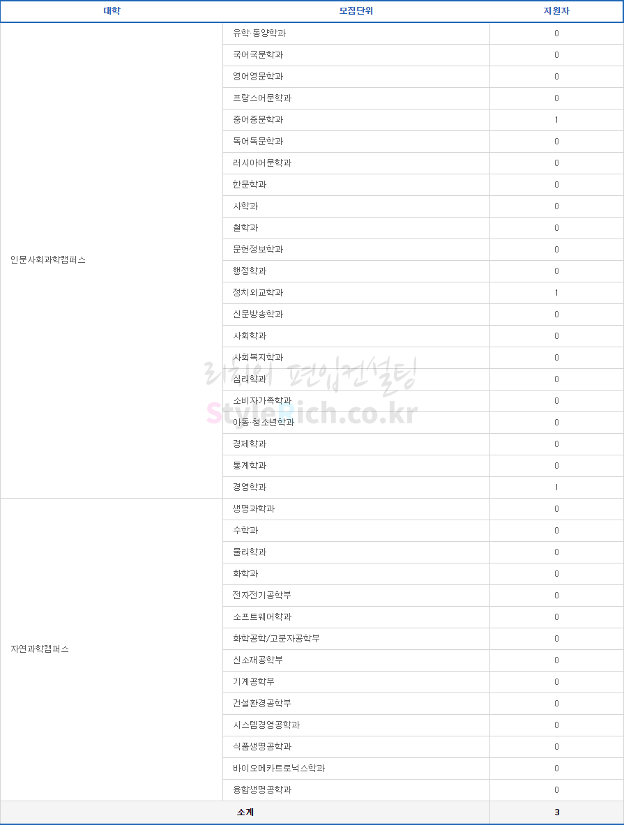 사범대학을 제외하고 2019학년도 편입에서 모집하는 전체 모집단위에서 선발하며, 선발인원을 명시하지 않아 경쟁률 산정이 의미가 없습니다. 중어중문학과, 정치외교학과,경영학과만 지원하였습니다.