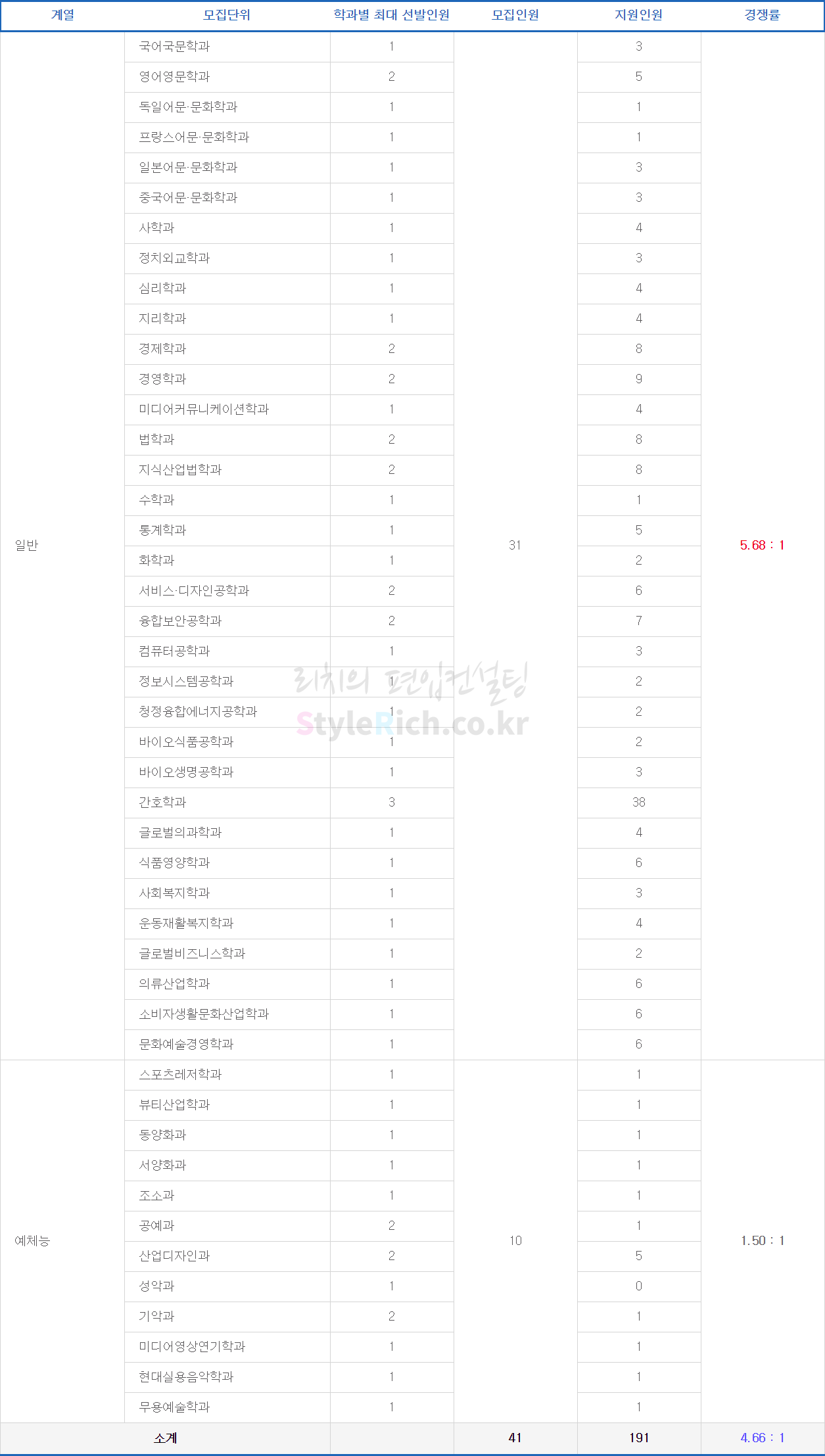 일반편입학이 경쟁률이 가장 높고, 재외국민과 외국인 전형 일반편입학이 가장 낮고 정원 미달입니다.