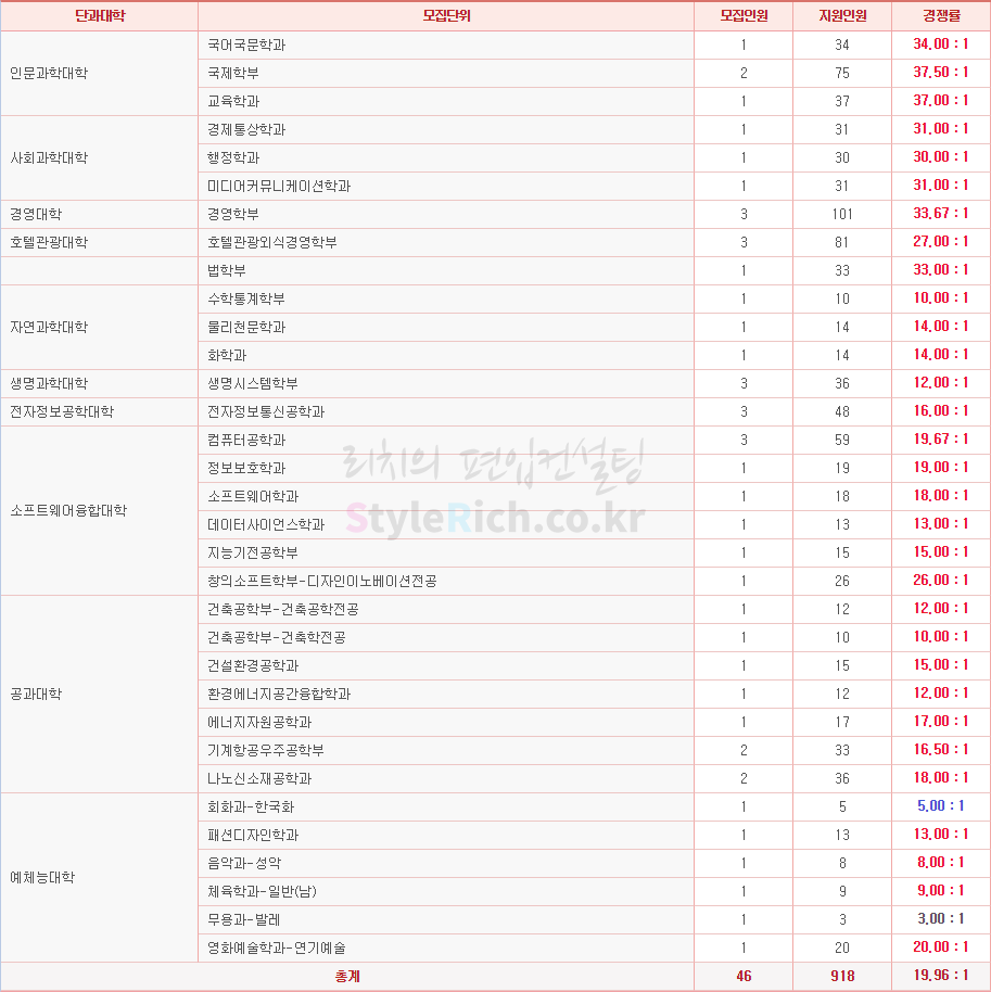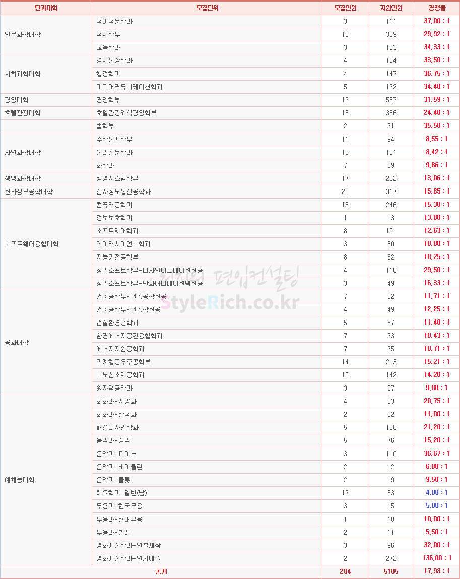 국제학부가 경쟁률이 가장 높고, 수학통계학부, 건축공학부-건축학전공이 가장 낮습니다. (예체능 제외)