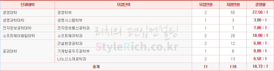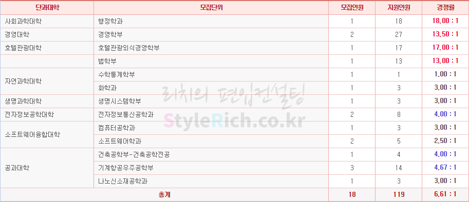 2019학년도 세종대 편입 전형별 경쟁률 현황