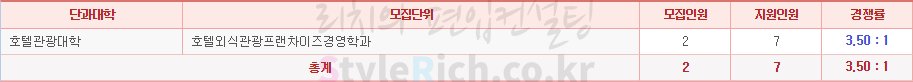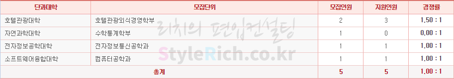 호텔관광외식경영학부가 경쟁률이 가장 높고, 수학통계학부가 가장 낮으며 정원 미달입니다.