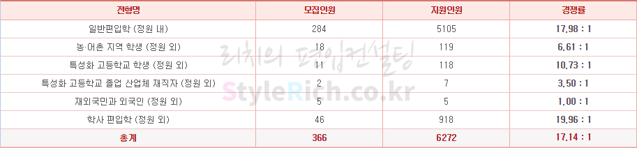 학사편입학이 경쟁률이 가장 높으며, 재외국민과 외국인 편입이 가장 낮고 정원이 충족되었습니다.