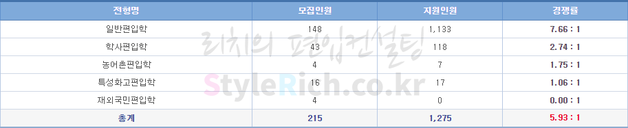 일반편입학이 경쟁률이 가장 높으며, 재외국민과 외국인 편입이 가장 낮고 정원 미달입니다.